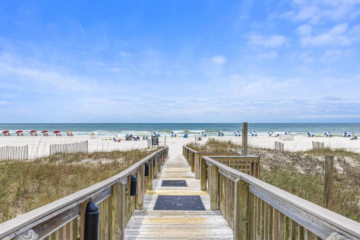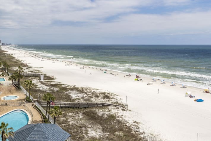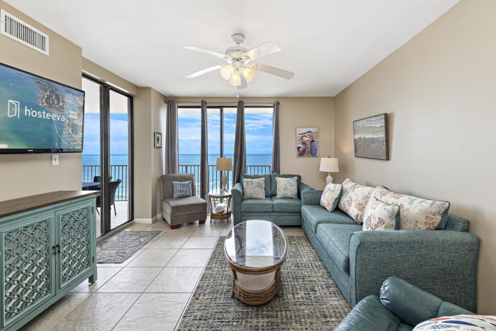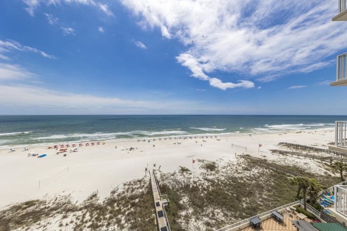 This Shoalwater condo by Hosteeva sits directly on the Gulf of Mexico in Orange Beach, Alabama on beautiful sugar-white sand beaches.