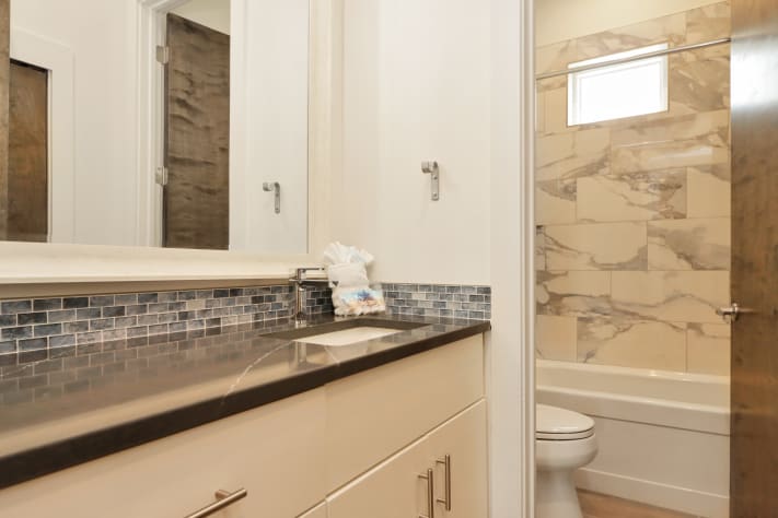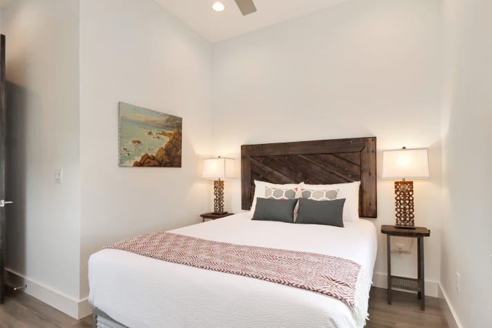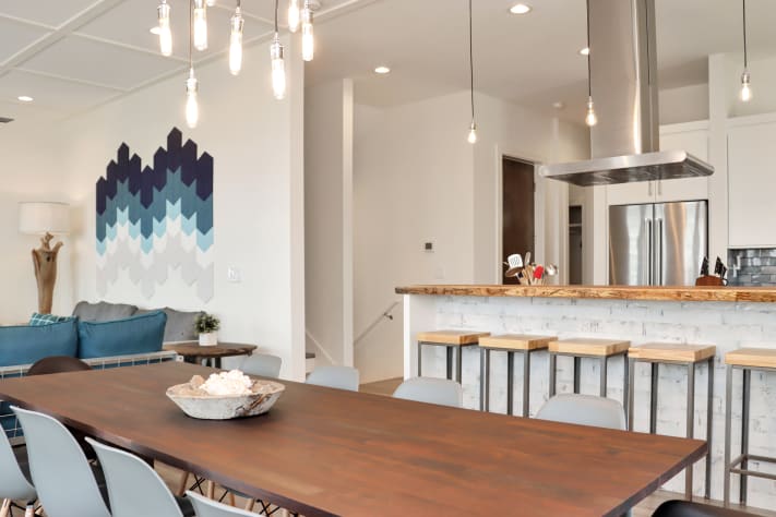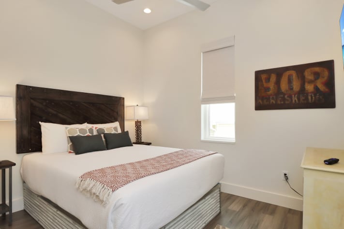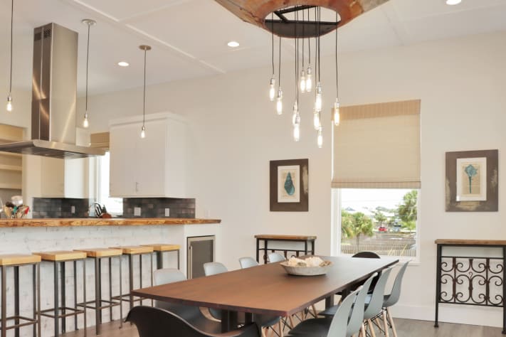 As you step inside, you'll be greeted by a contemporary interior featuring thoughtfully designed spaces. The ground floor boasts a private mother-in-law suite with its own entrance, full bathroom, kitchenette, and 6 person exclusive hot tub just outside the door—an ideal sanctuary for added privacy and relaxation. The main level offers a bedroom for convenience, while the second floor houses four additional bedrooms and a second living area, providing ample room for everyone to spread out and enjoy their stay. The main living area and upstairs lounge are adorned with hand-crafted furniture, including welded metal sofa frames and galvanized metal bed frames, all custom-built by Ferro Designs. The large oxidized metal chandelier over the dining room table serves as a striking focal point, complementing the home's modern aesthetic.