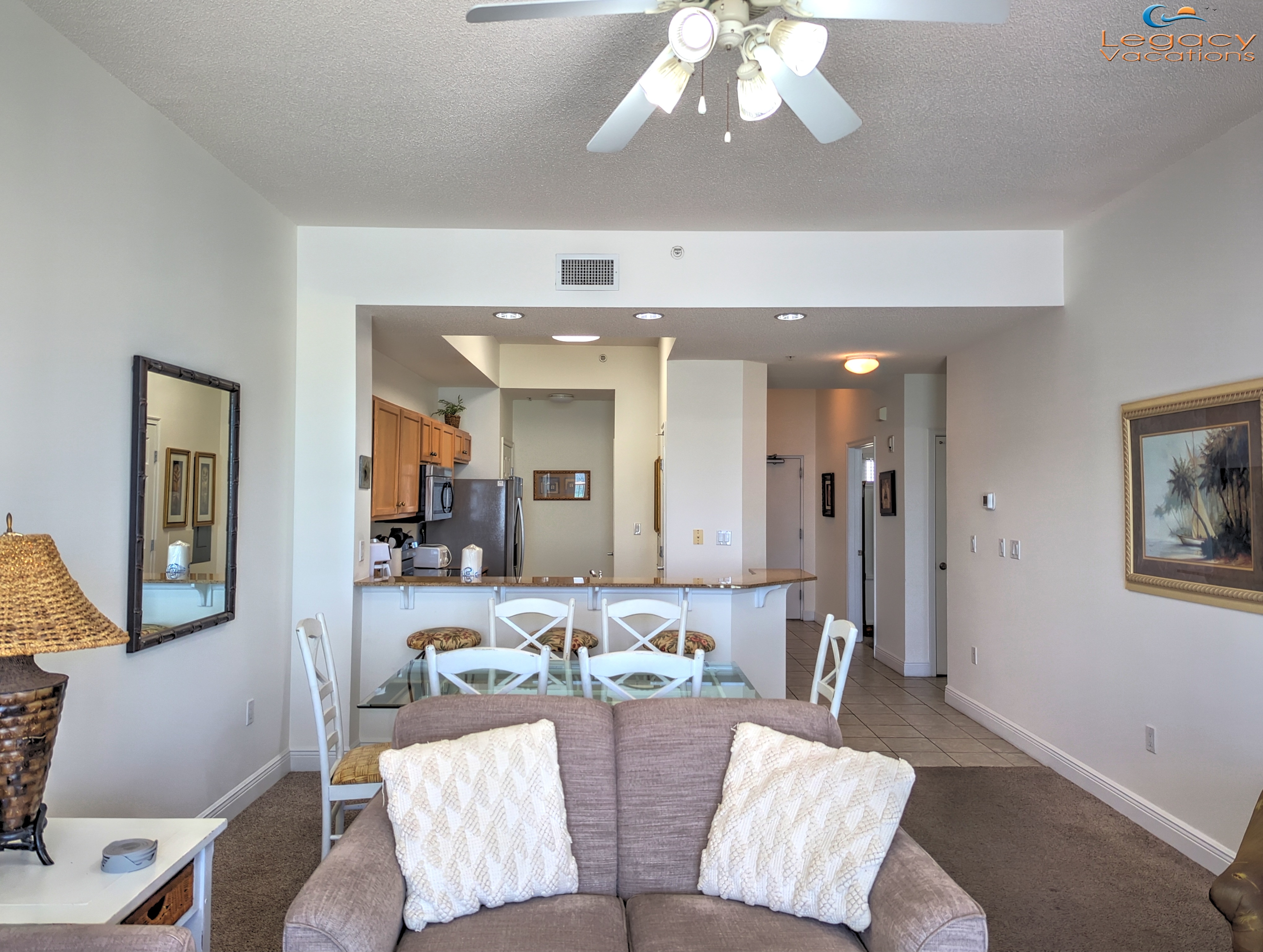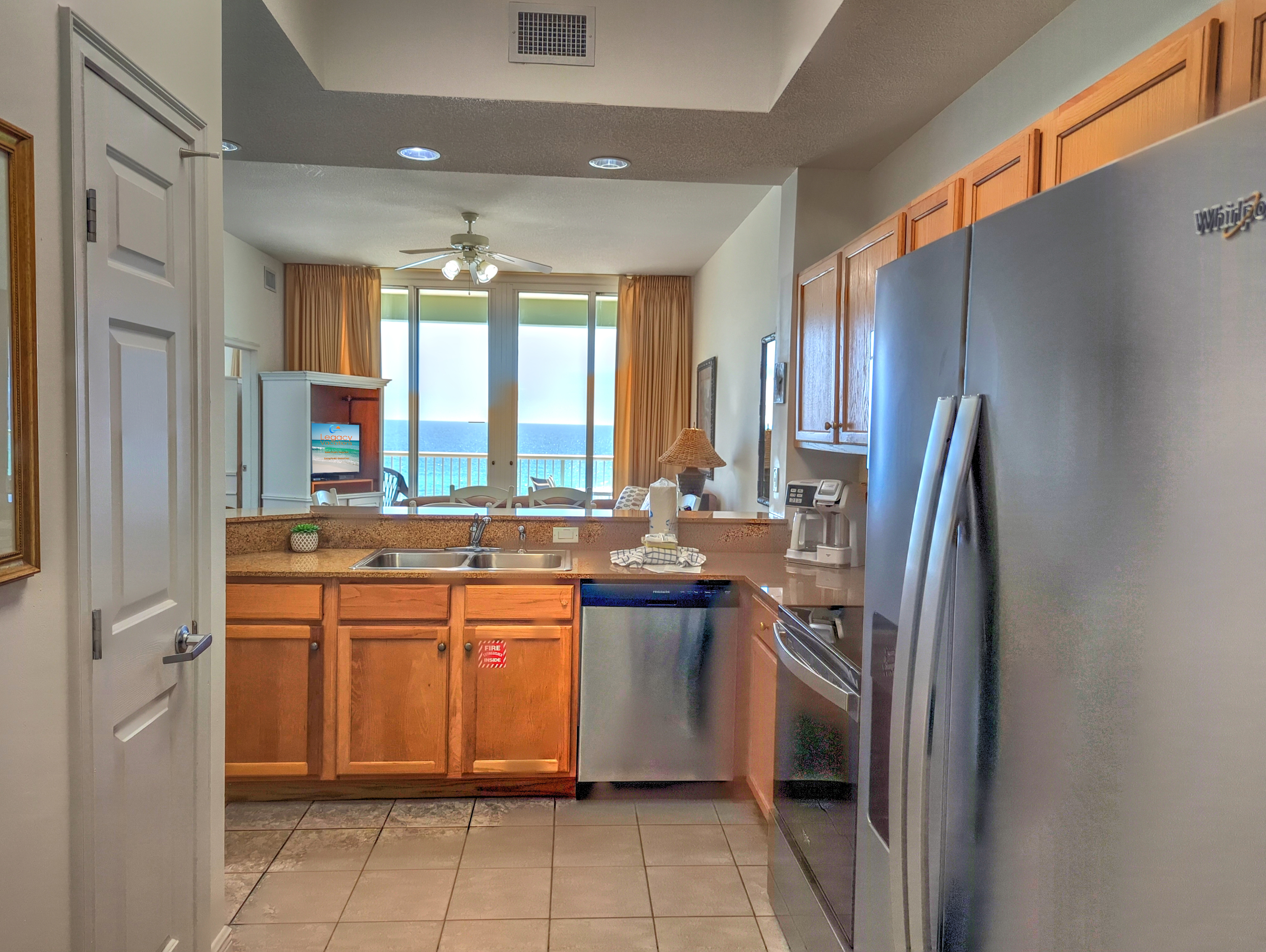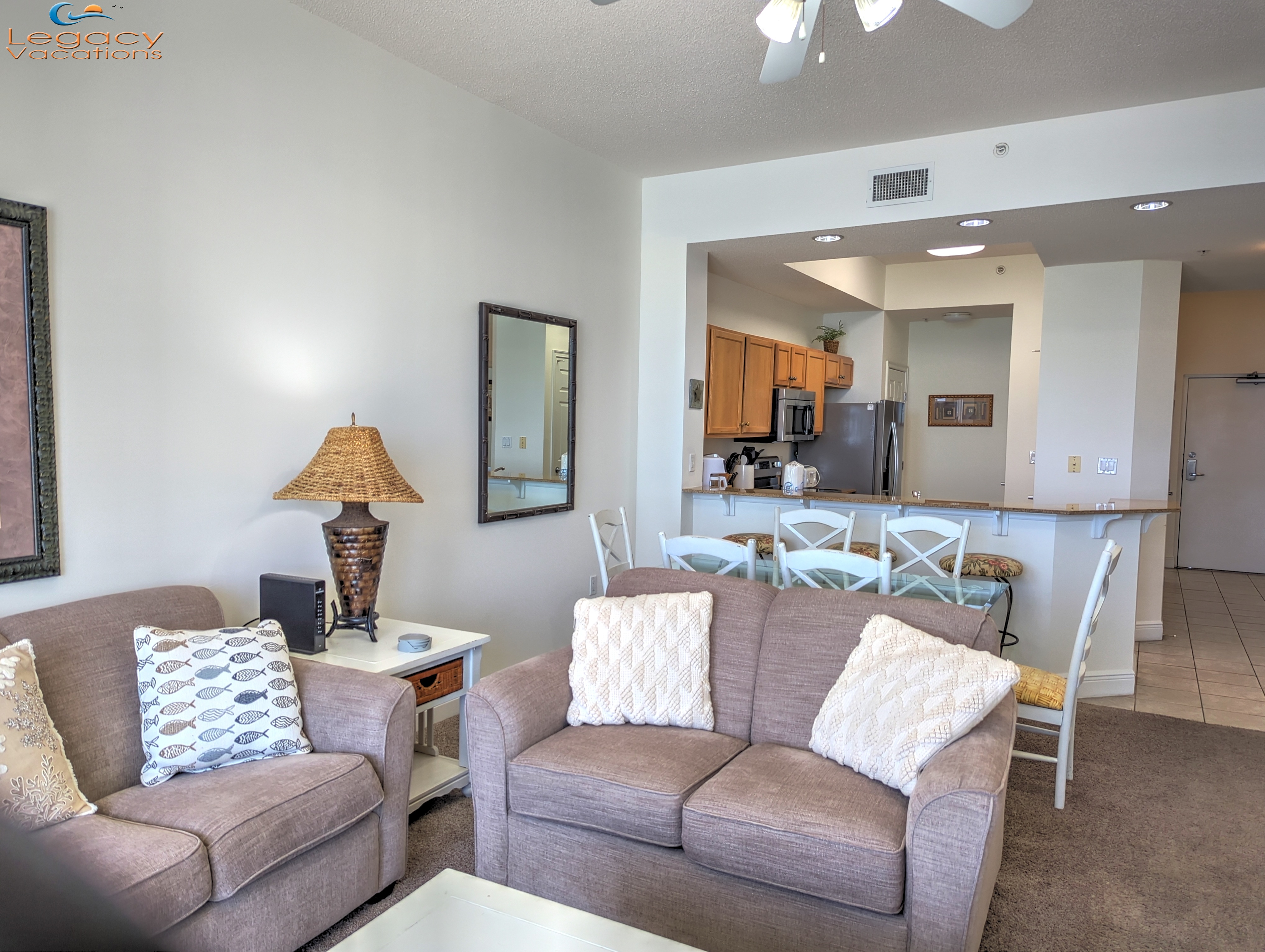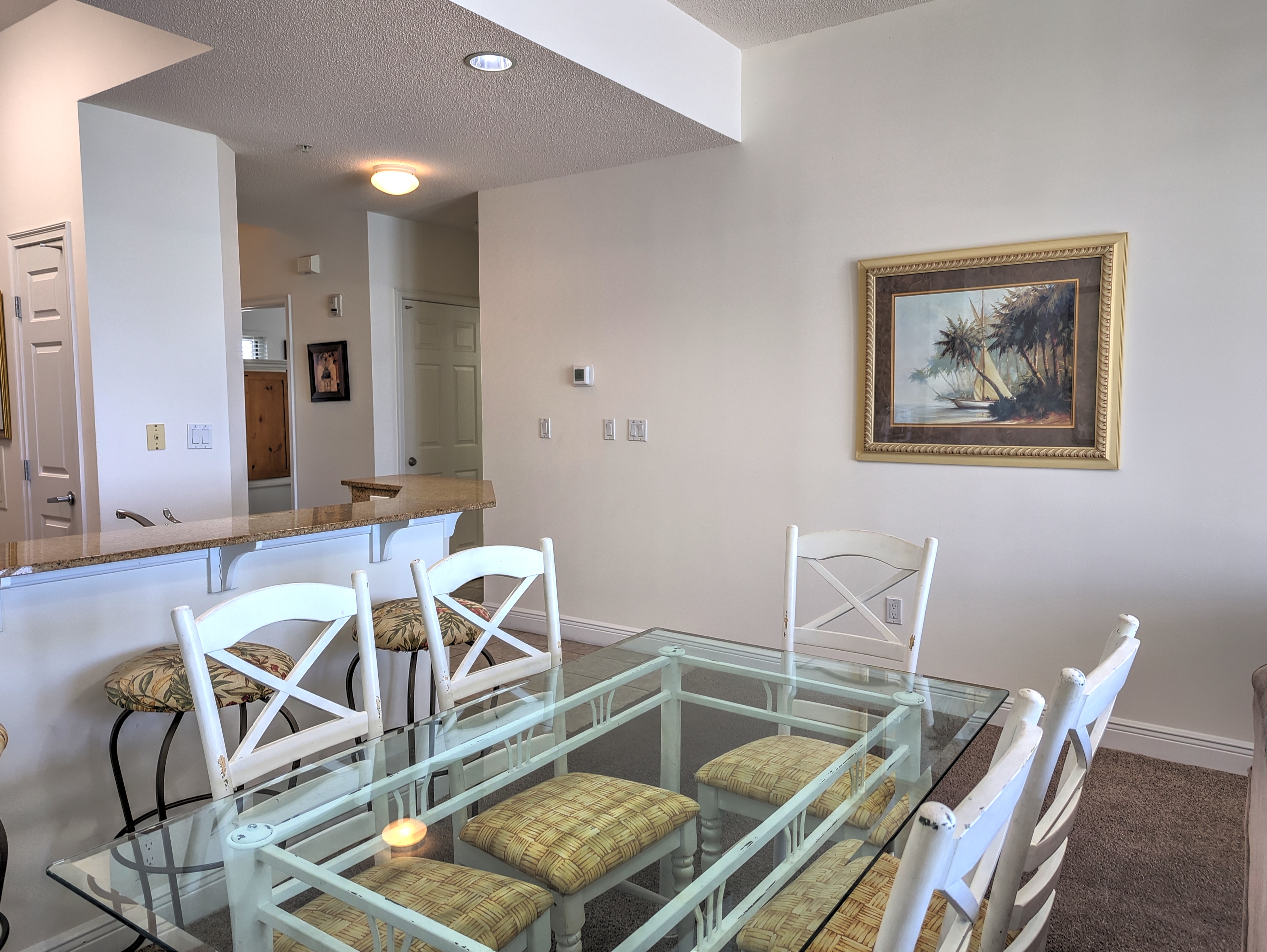 Boasting 10-foot ceilings, this large space features a fully equipped kitchen with granite counters, pantry, and a washer and dryer. The kitchen also includes a bar with extra seating, complete with a Keurig and Coffee maker combo. The open floor plan seamlessly connects the kitchen to the dining area, accommodating up to six guests, and the living area equipped with a Flat screen TV and a Queen sleeper sofa for additional guests. Marvel at the breathtaking Gulf views from the living ...