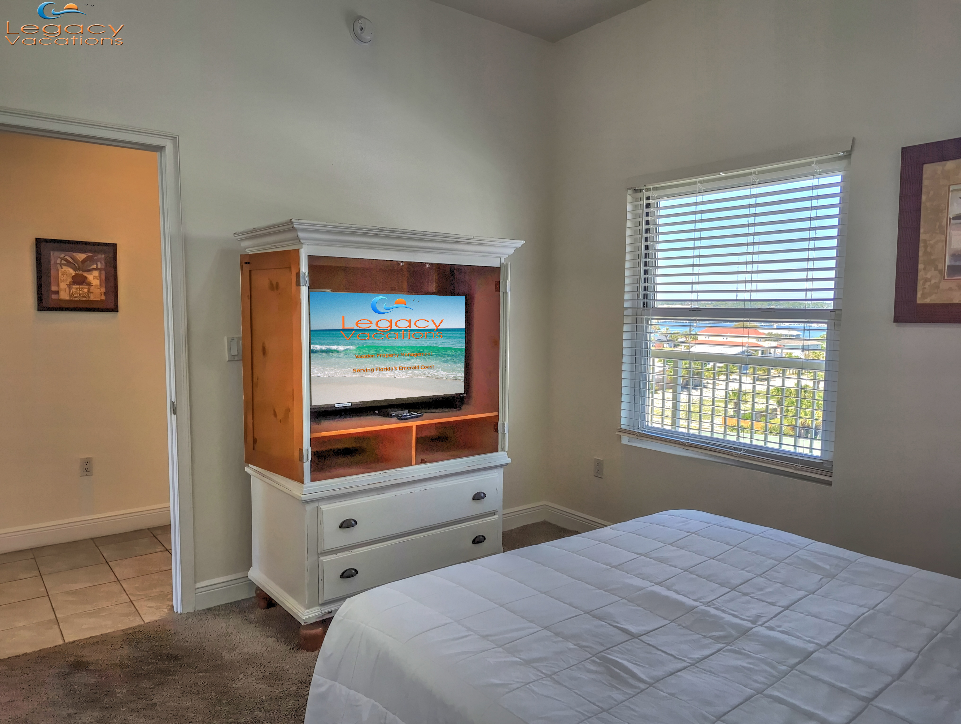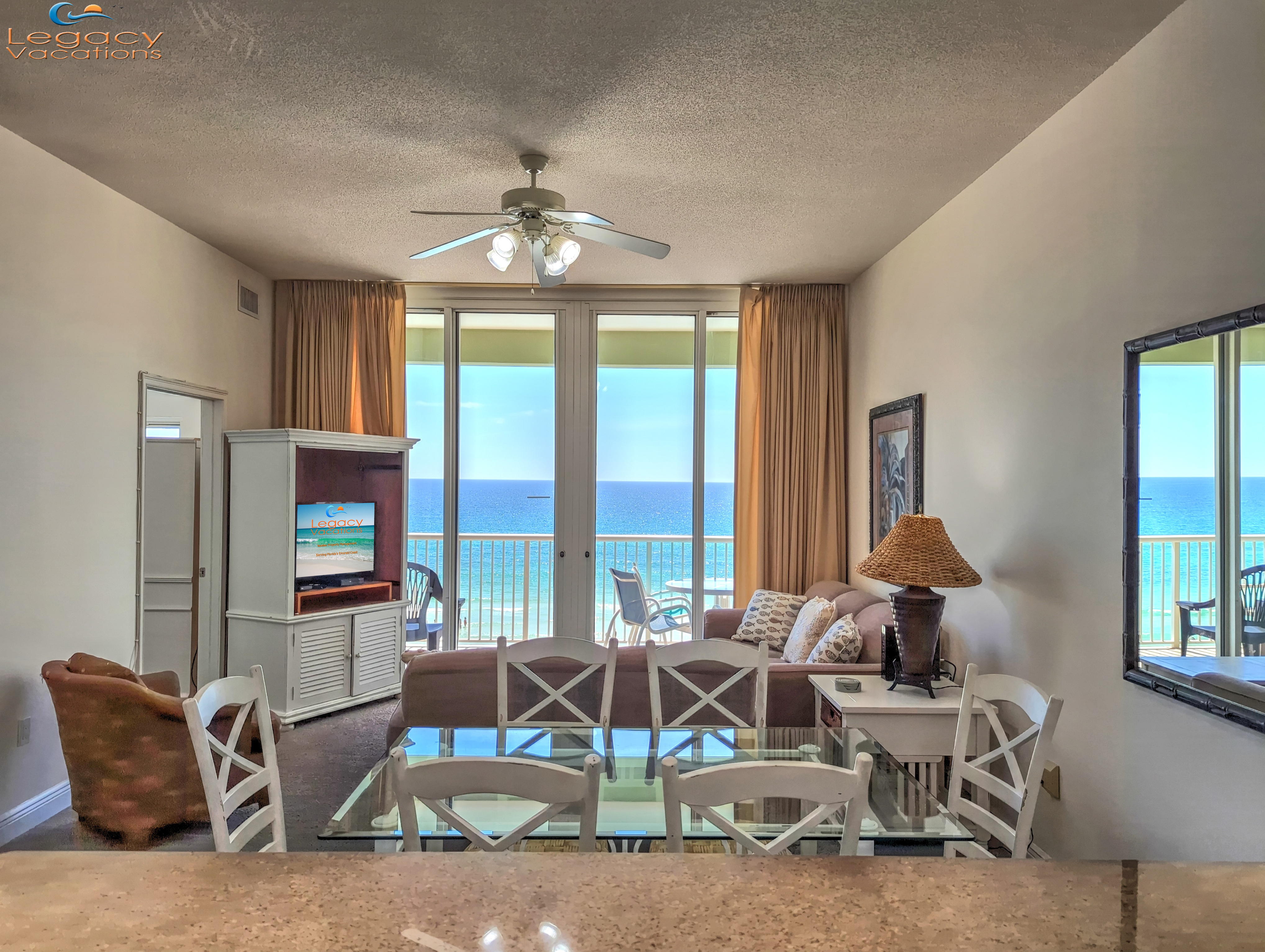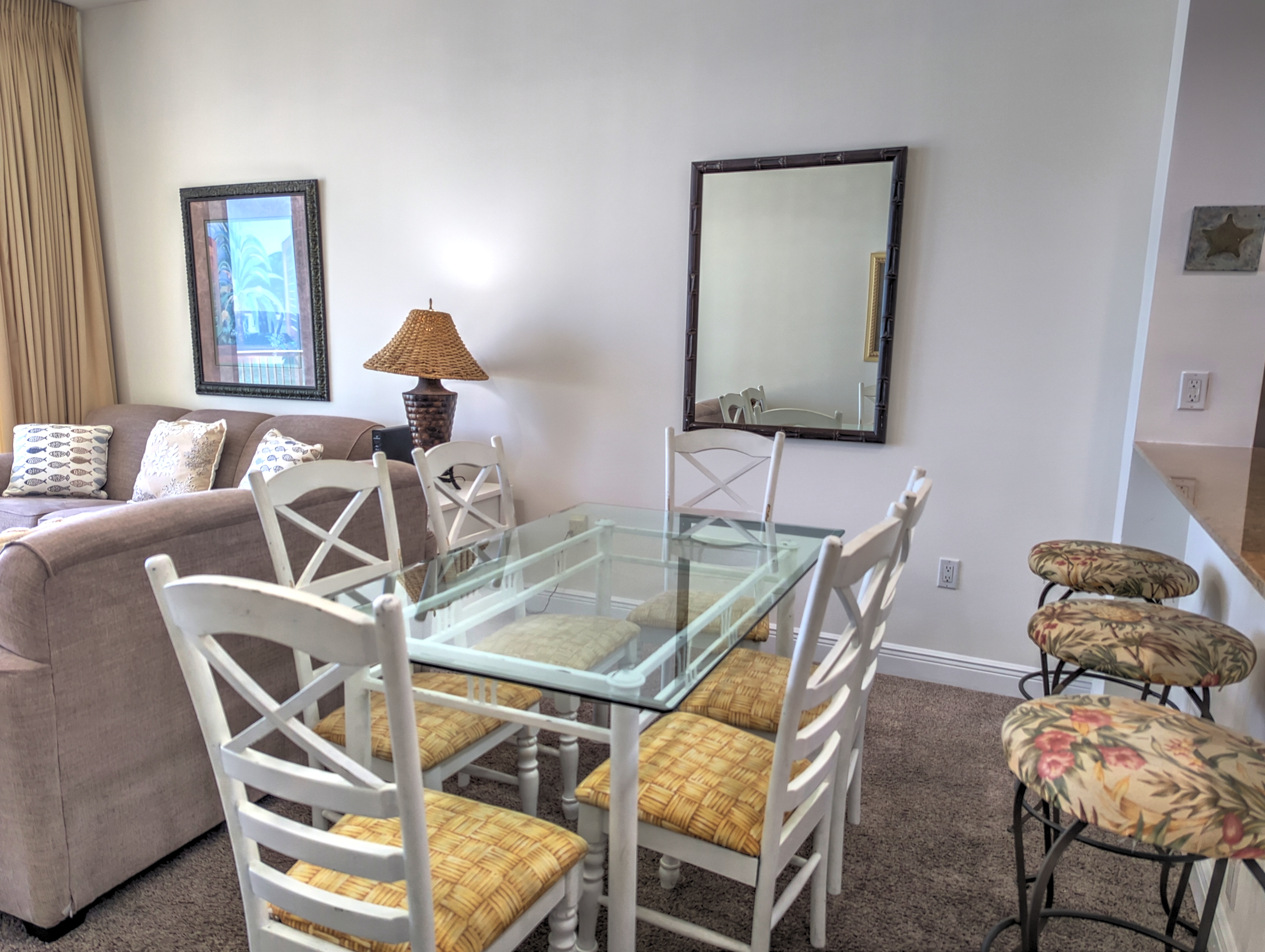 Boasting 10-foot ceilings, this large space features a fully equipped kitchen with granite counters, pantry, and a washer and dryer. The kitchen also includes a bar with extra seating, complete with a Keurig and Coffee maker combo. The open floor plan seamlessly connects the kitchen to the dining area, accommodating up to six guests, and the living area equipped with a Flat screen TV and a Queen sleeper sofa for additional guests. Marvel at the breathtaking Gulf views from the living ...
