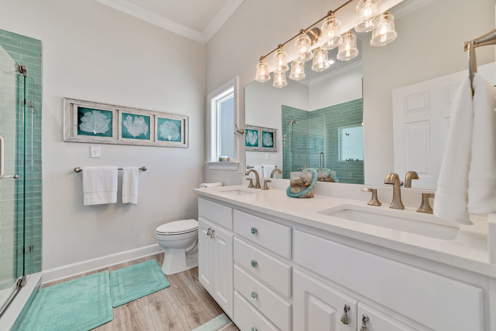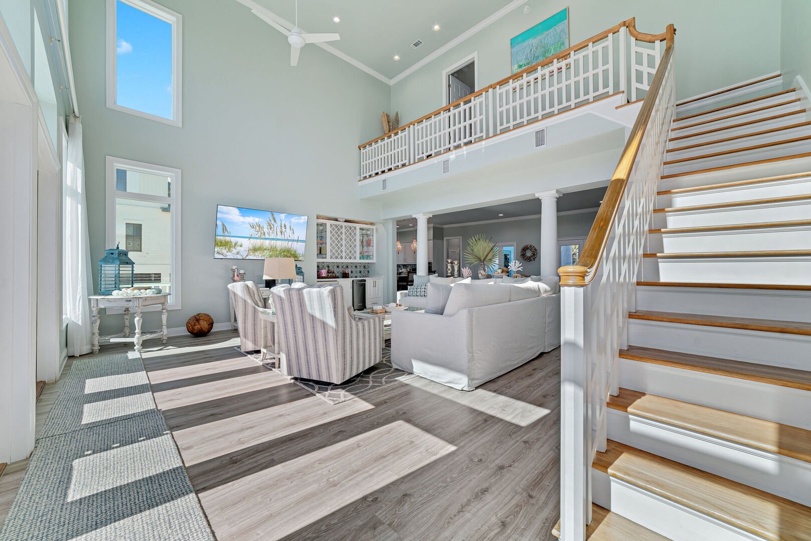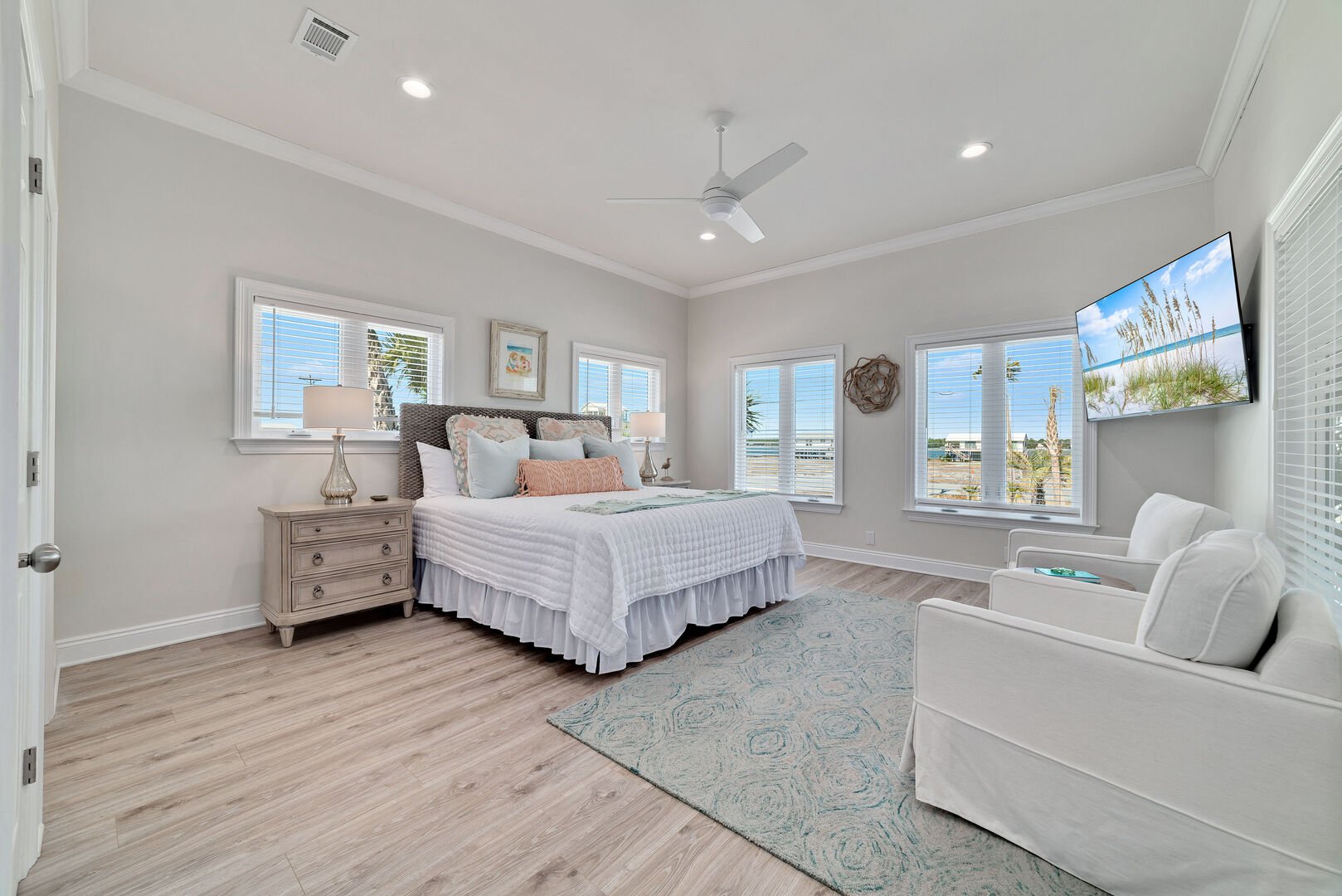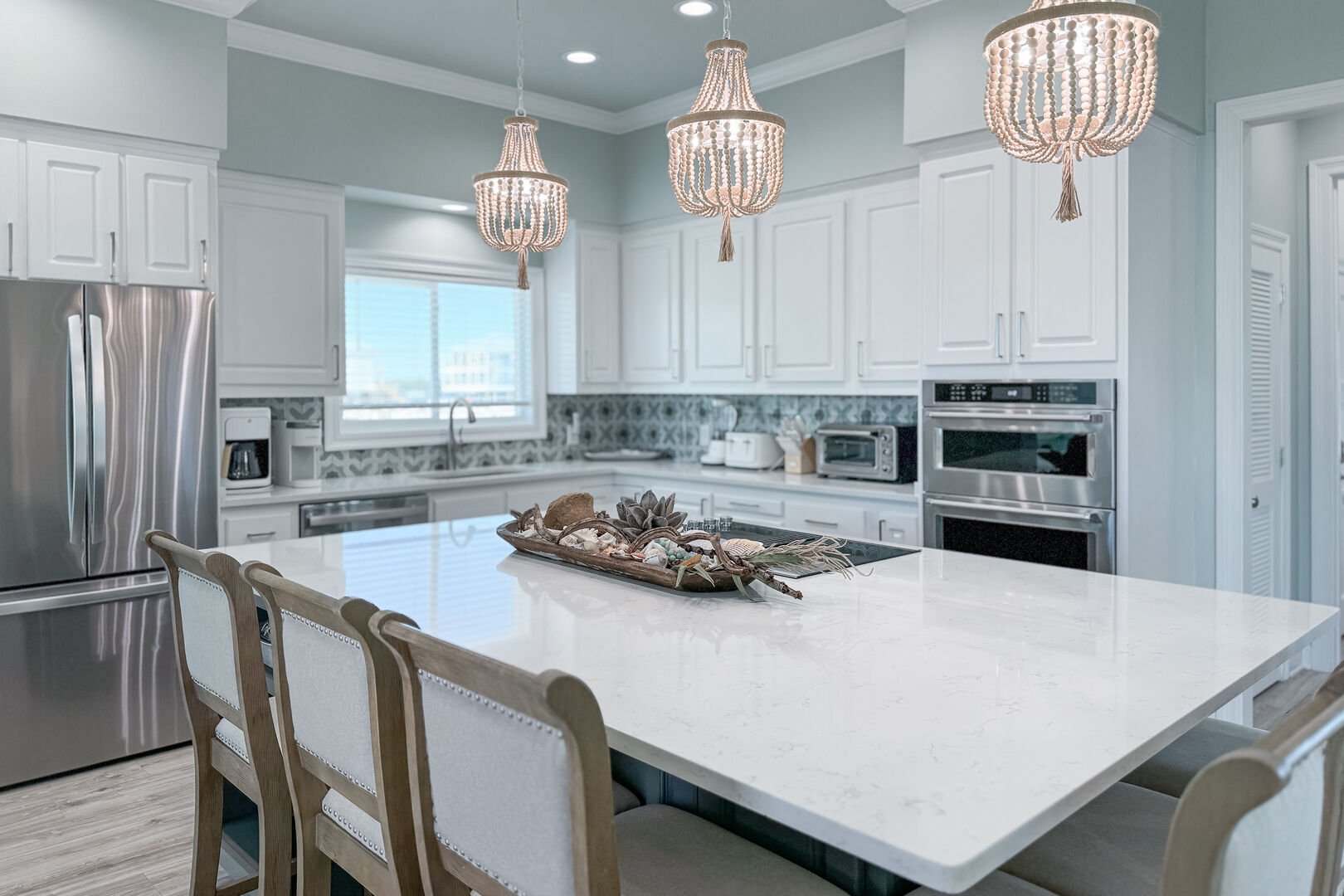 Seaside Palms features 4 gracious bedrooms (2 Kings, 1 with a Pair of Queens, plus the huge top floor room with a Pair of Queens topped by a loft with 2 Twins). Each with a private bath, a smart TV, and access to one of the porches. You'll be delighted with the fully stocked kitchen that makes cooking with a view a pleasure (if you enjoy that-we can also recommend great options ranging...