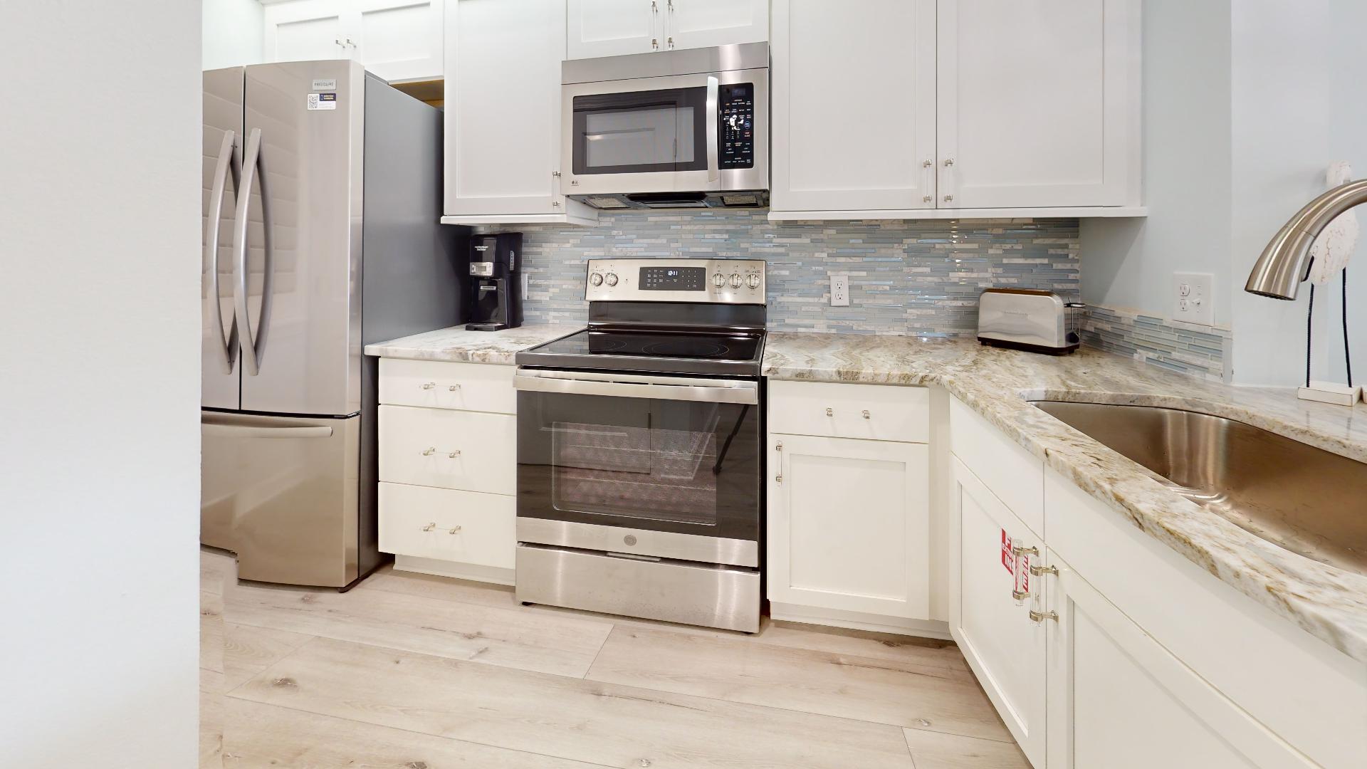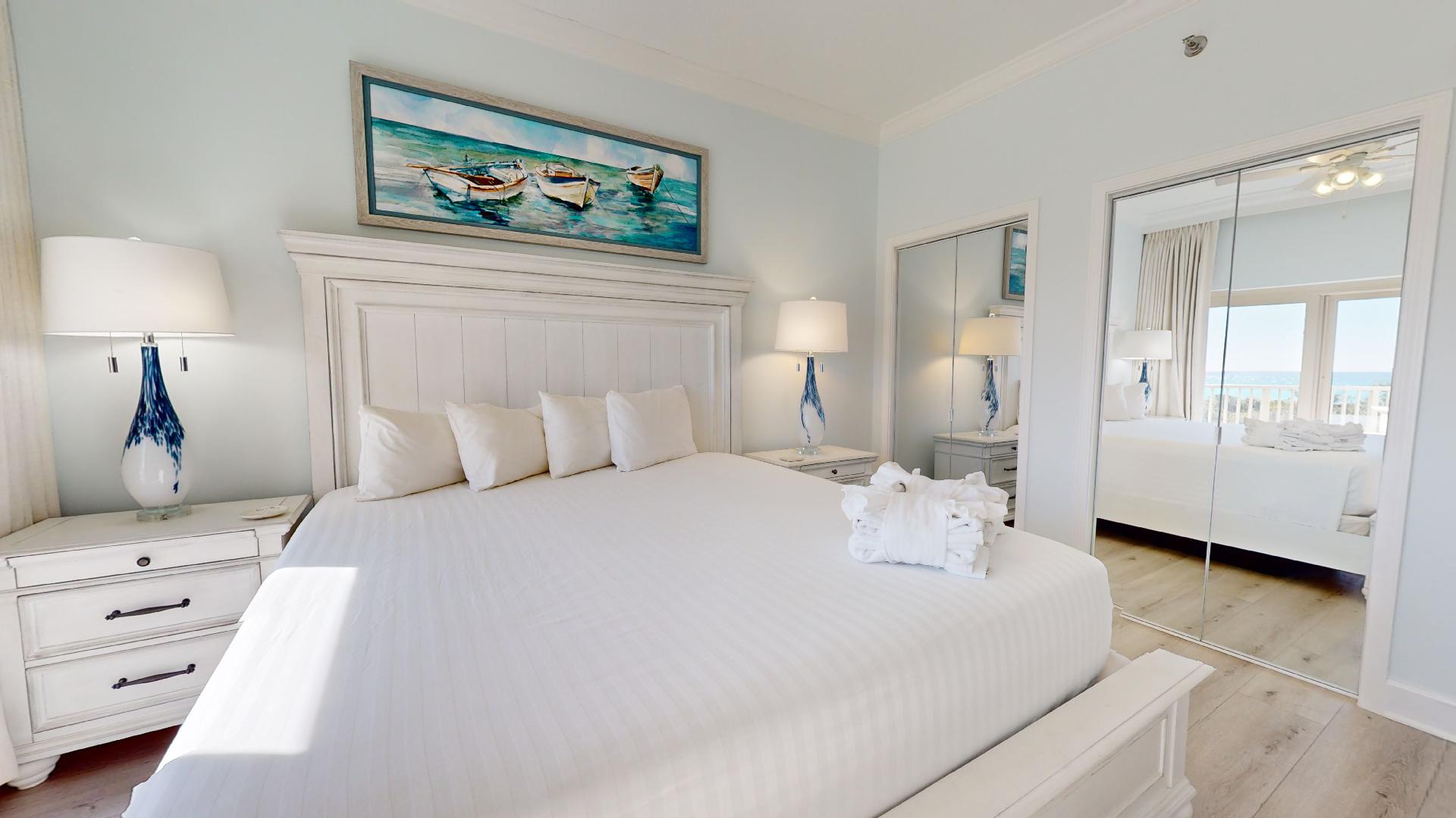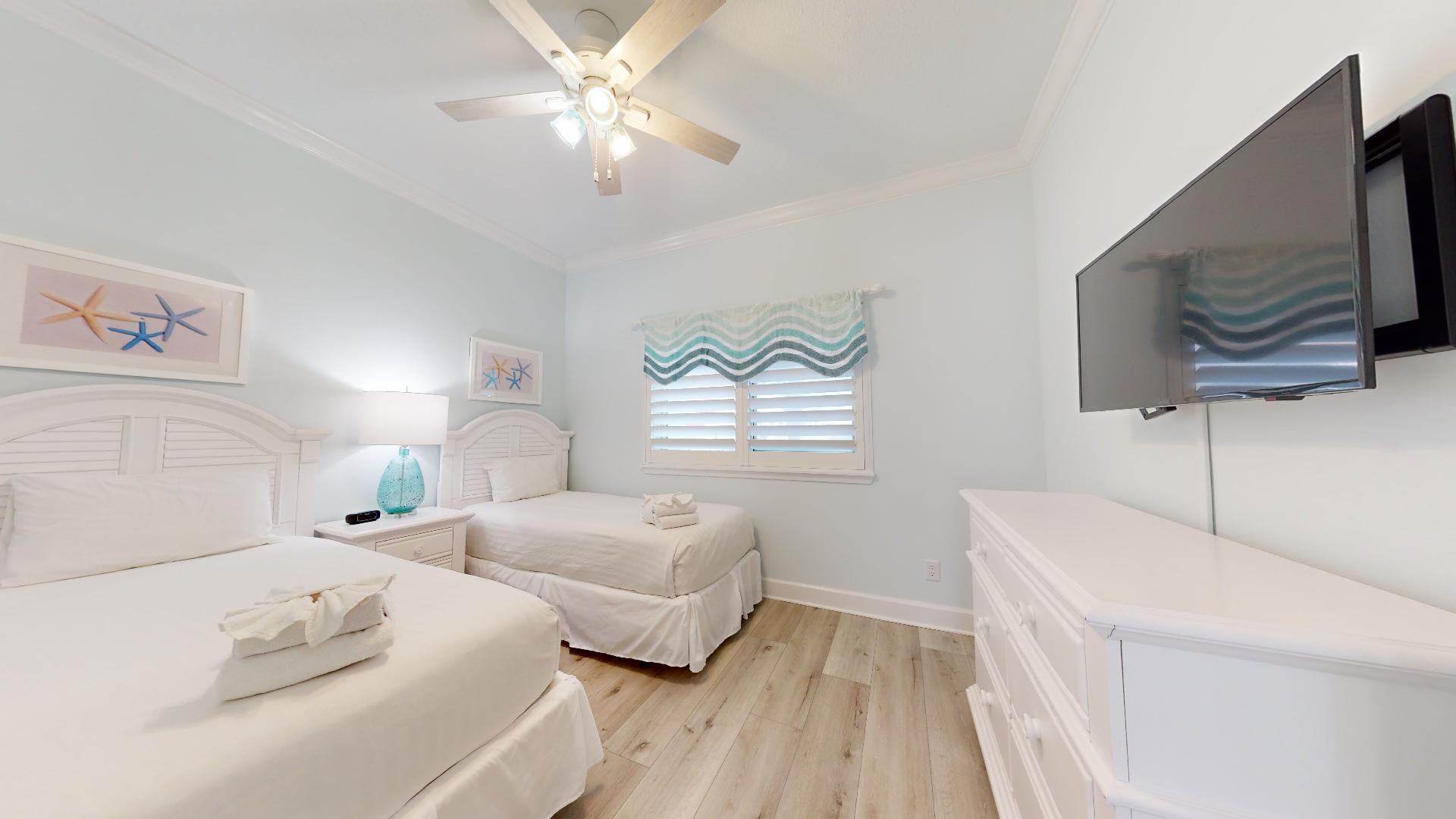 The master suite features a king bed, en-suite bath, and generous closet space. The guest bedroom offers two twin beds, while a sofa sleeper in the living room accommodates extra guests. A washer and dry...