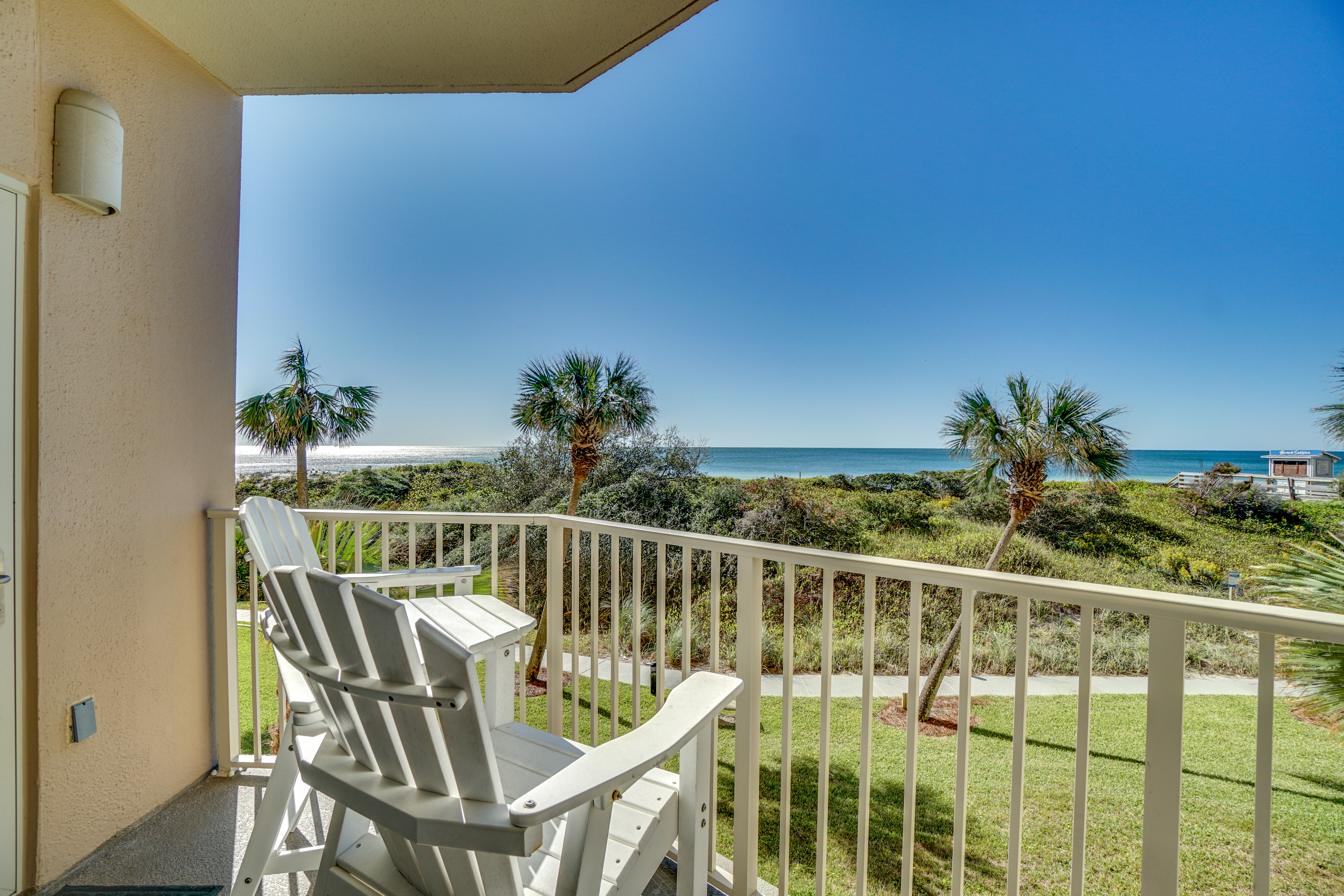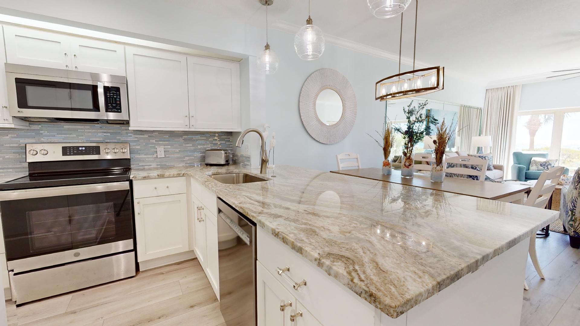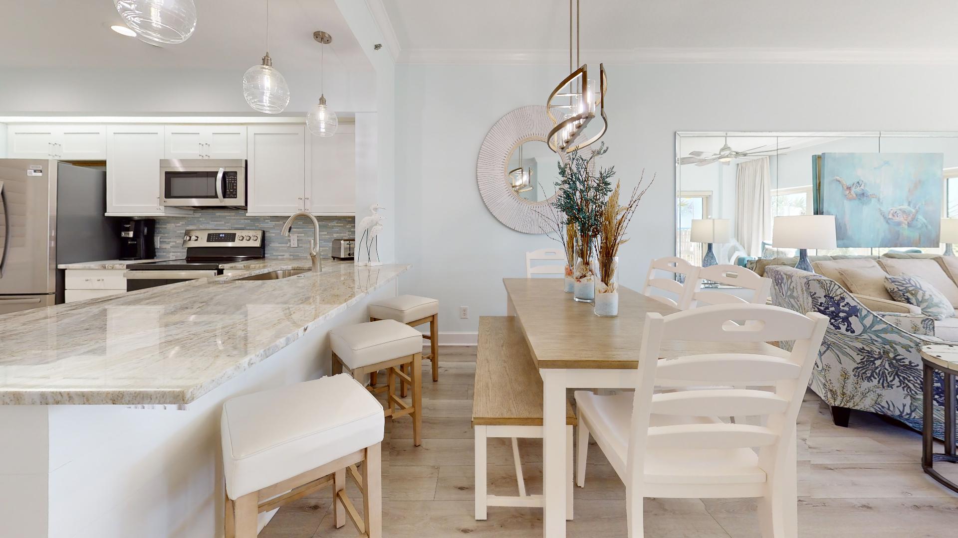 The fully equipped kitchen has everything you need for meals at home, with a dining area and spacious living room designed for comfort after a day in the sun. Step onto your private balcony to enjoy mesmerizing emerald water views and the soothing sound of waves just steps away.