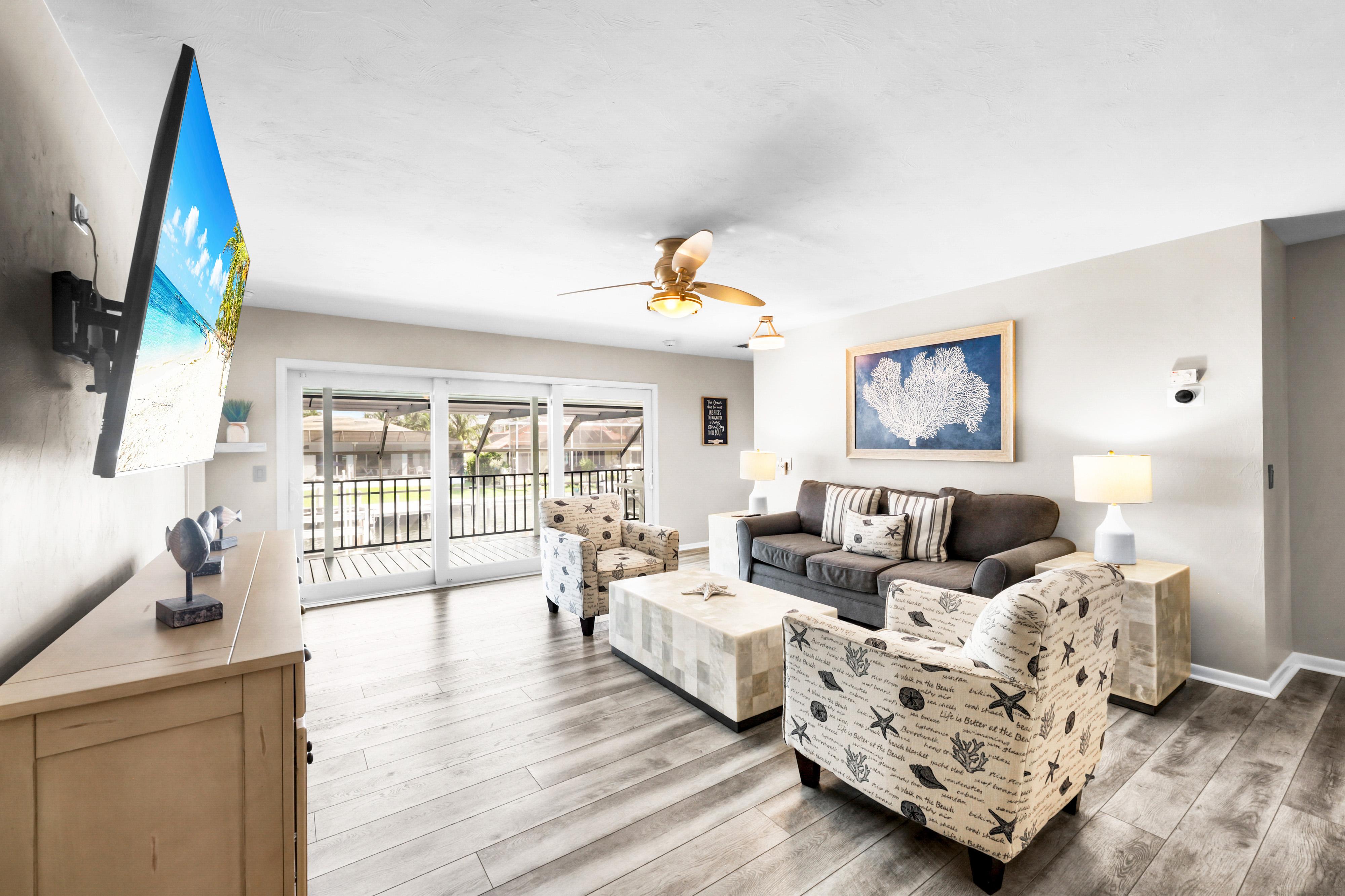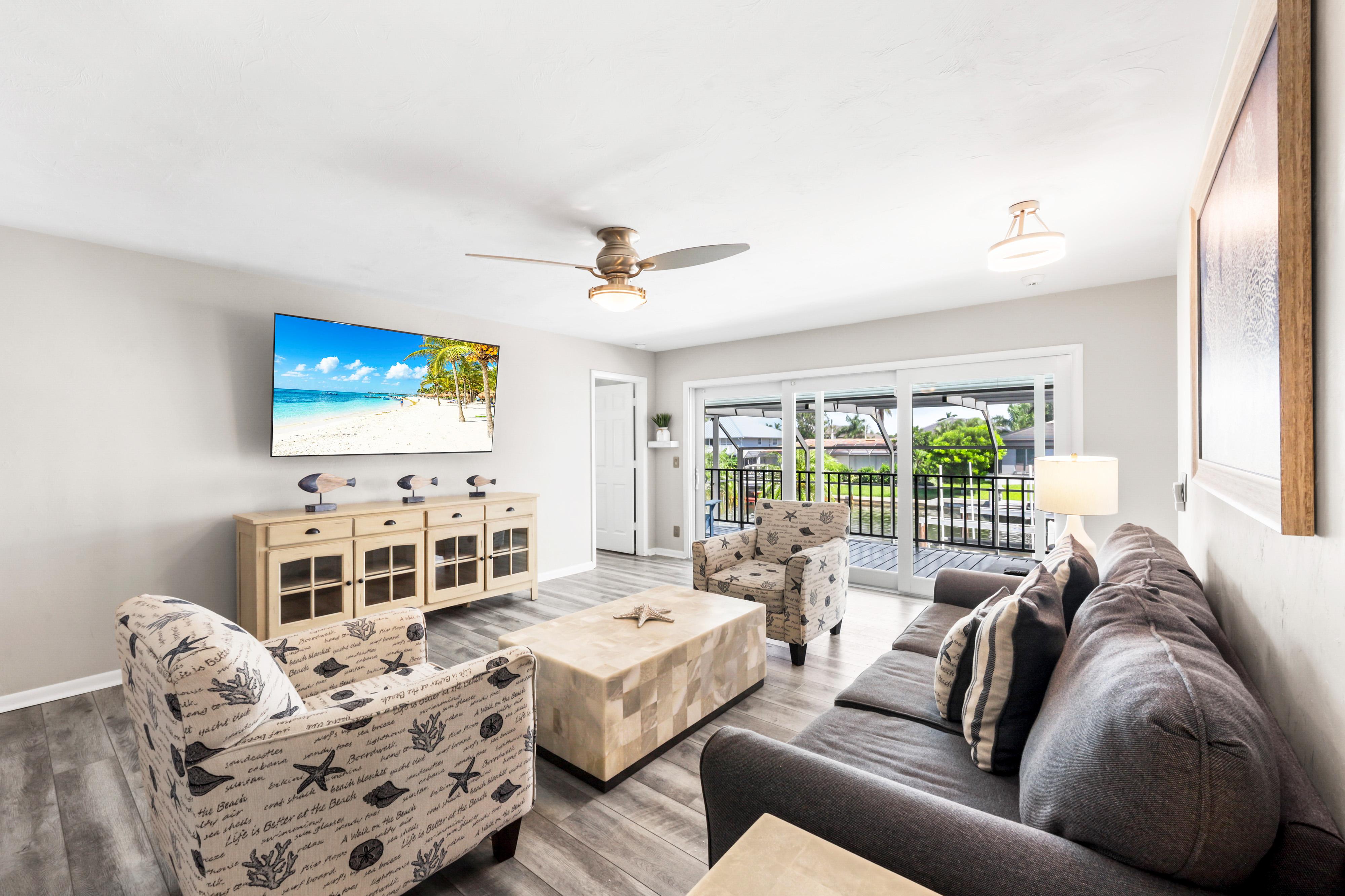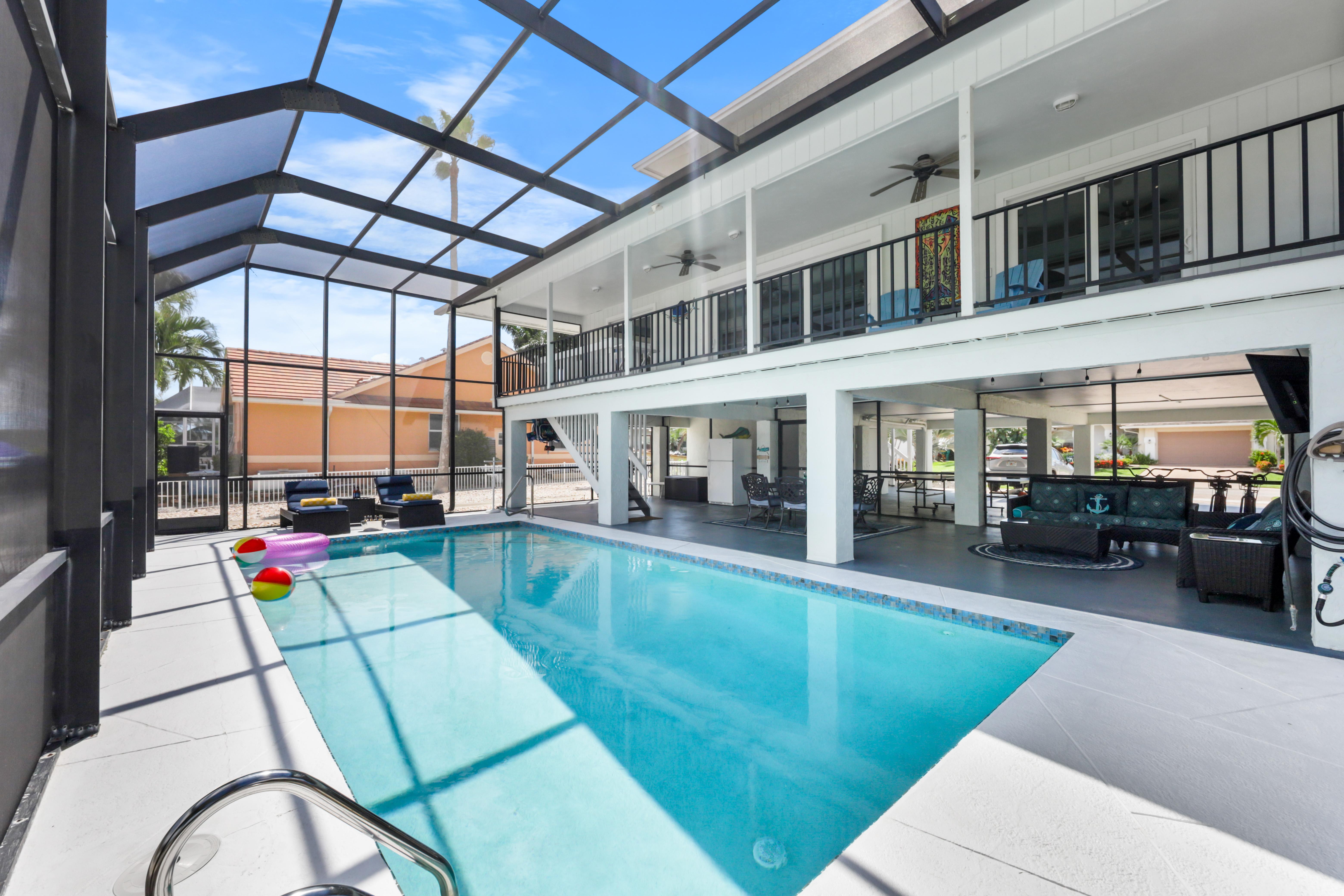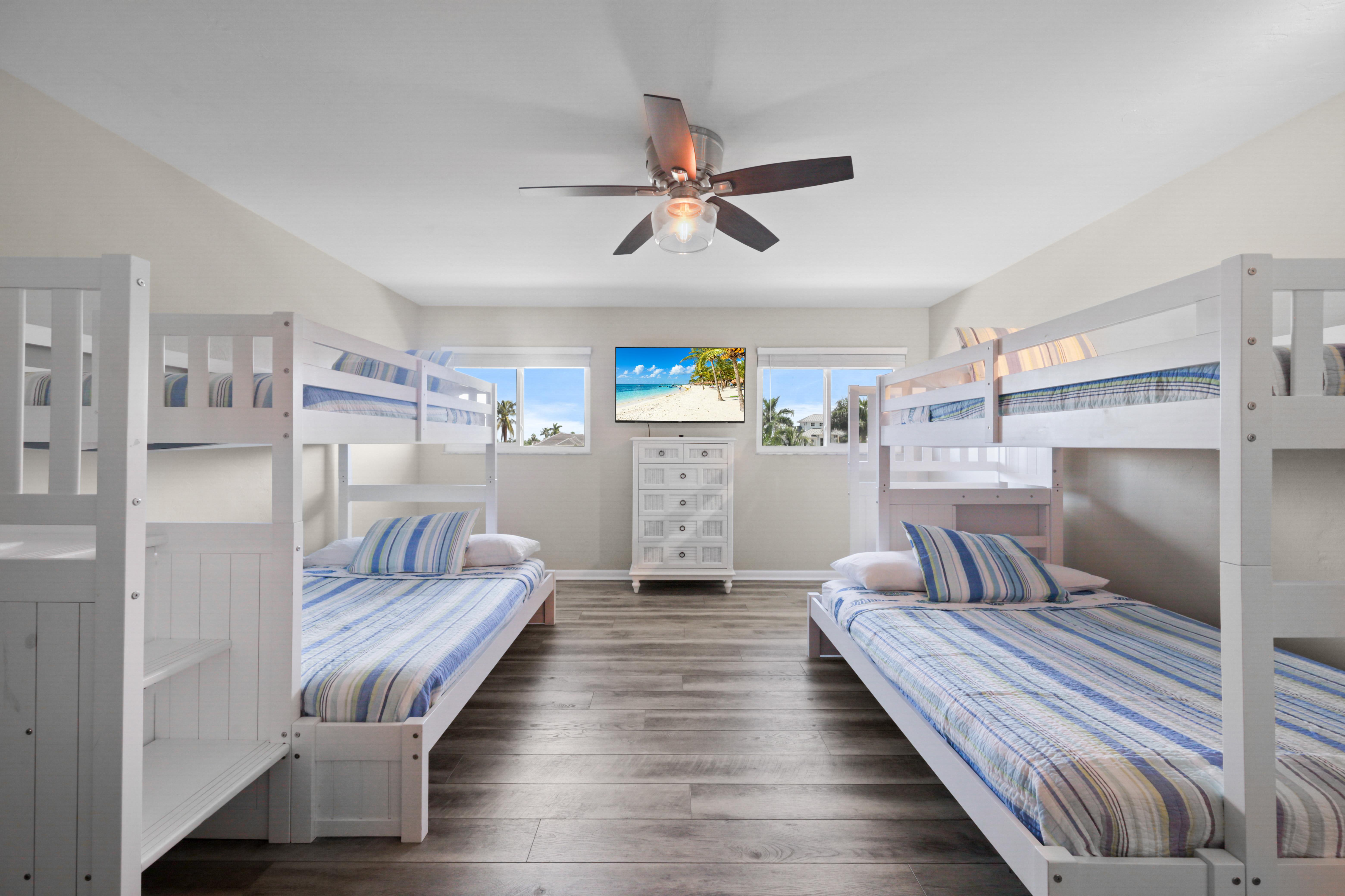 Arrive at your own slice of paradise along a palm-lined drive framed by tropical landscaping, leading up to this classic Florida-style waterfront retreat. With 2,200 square feet across three stories, it offers plenty of space for family and friends to spread out and enjoy the island lifestyle. It sleeps 14, with two king beds, two full-over-queen bunk beds, a sleeper sofa, and three-and-a-half bathrooms.