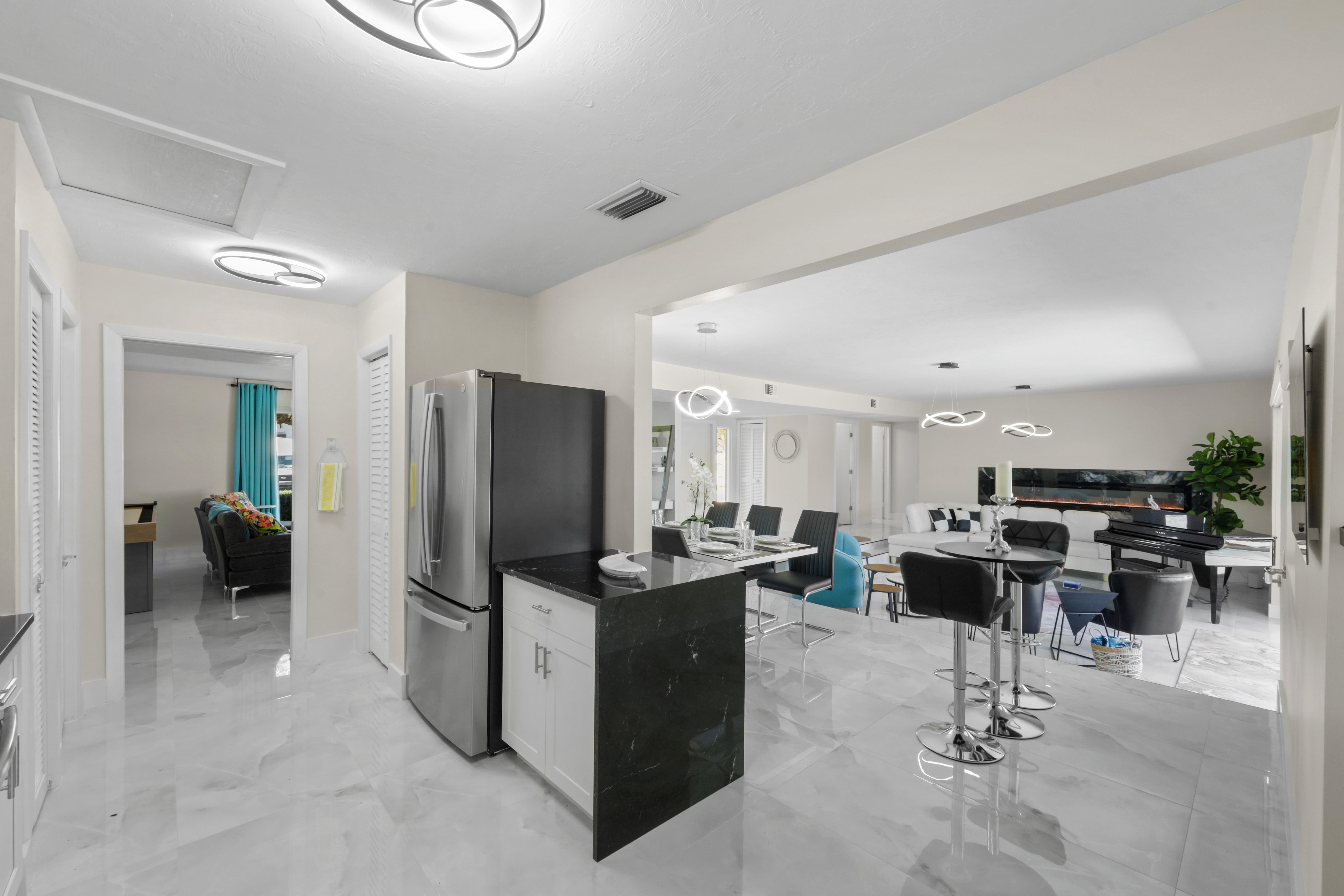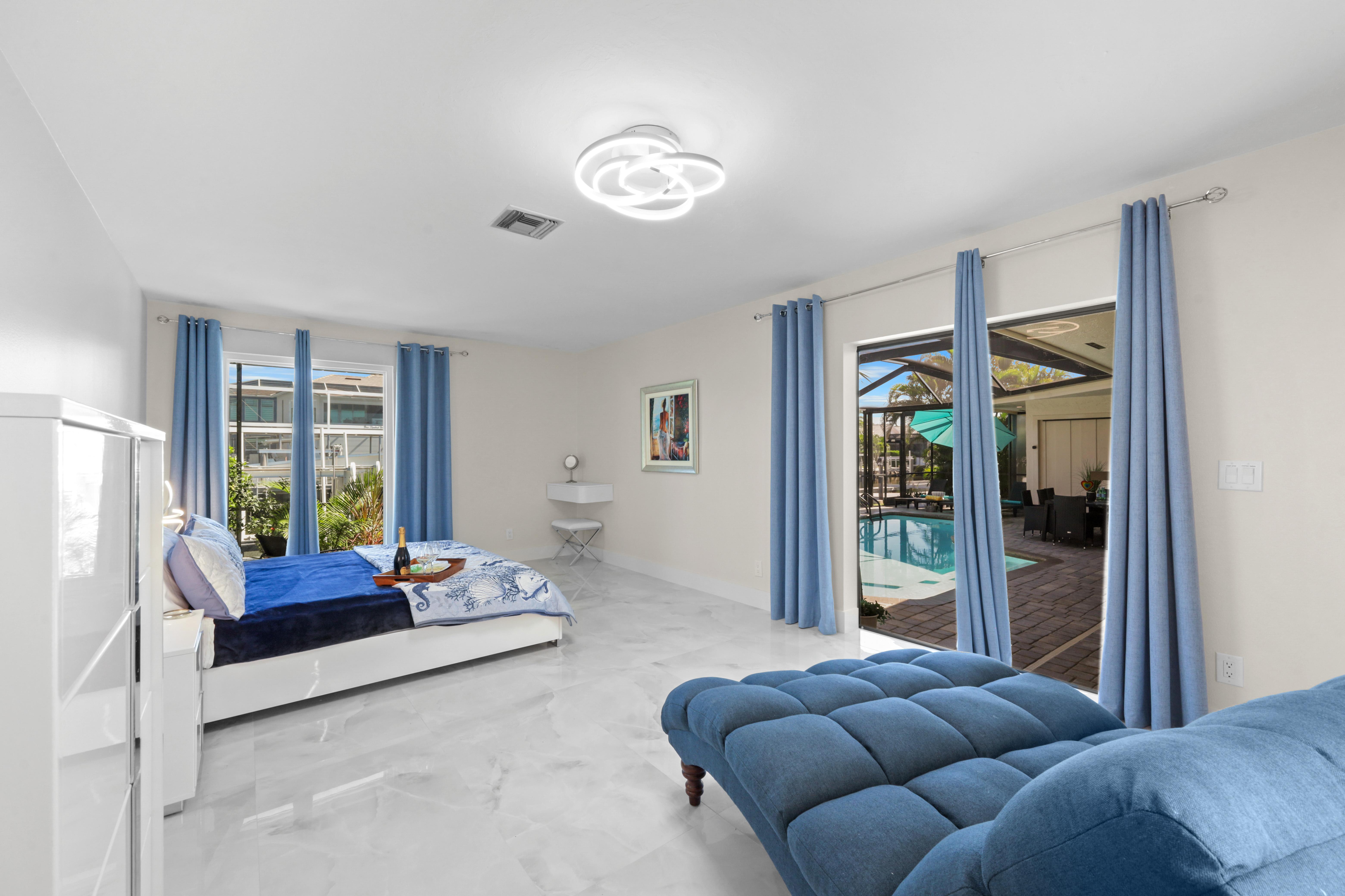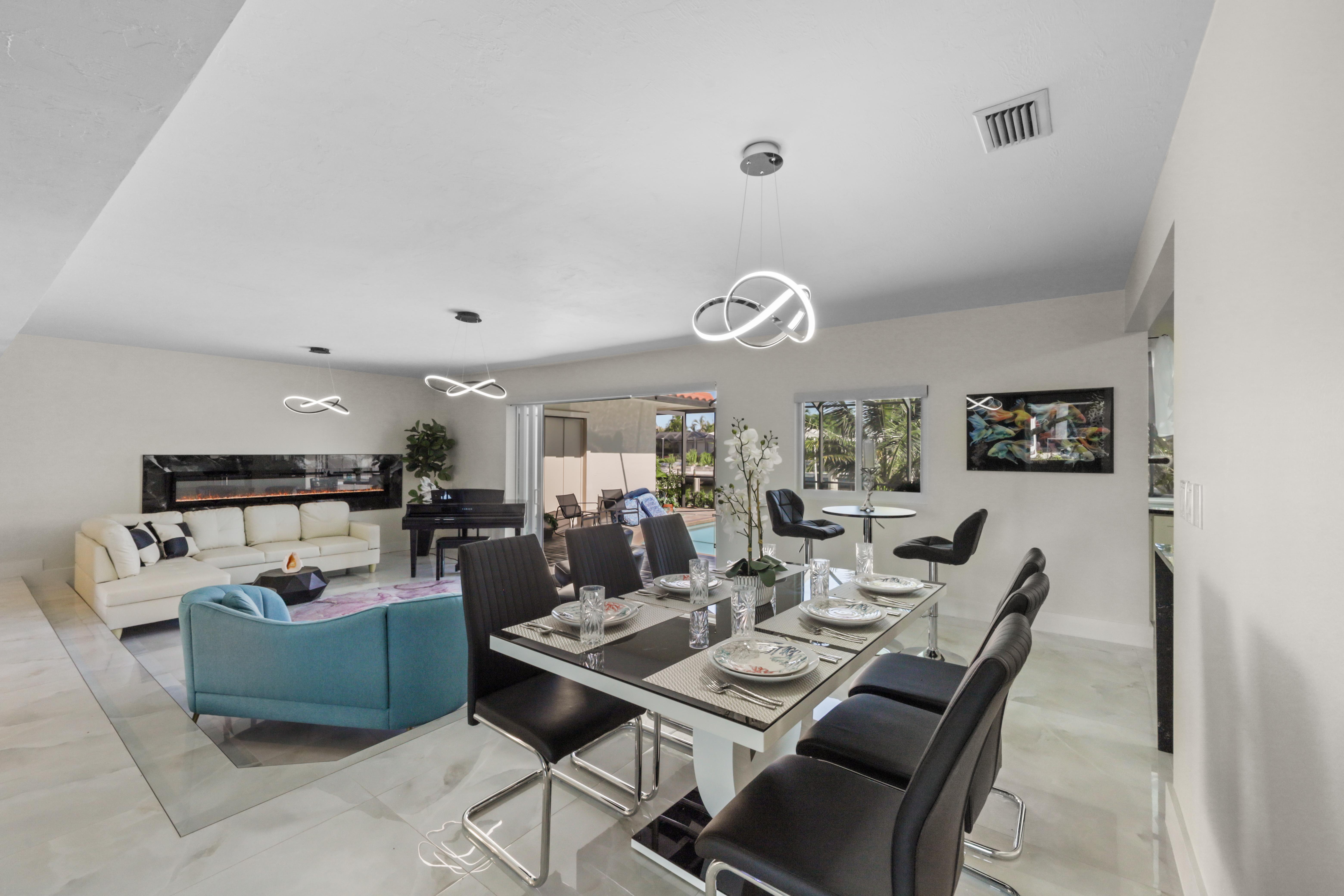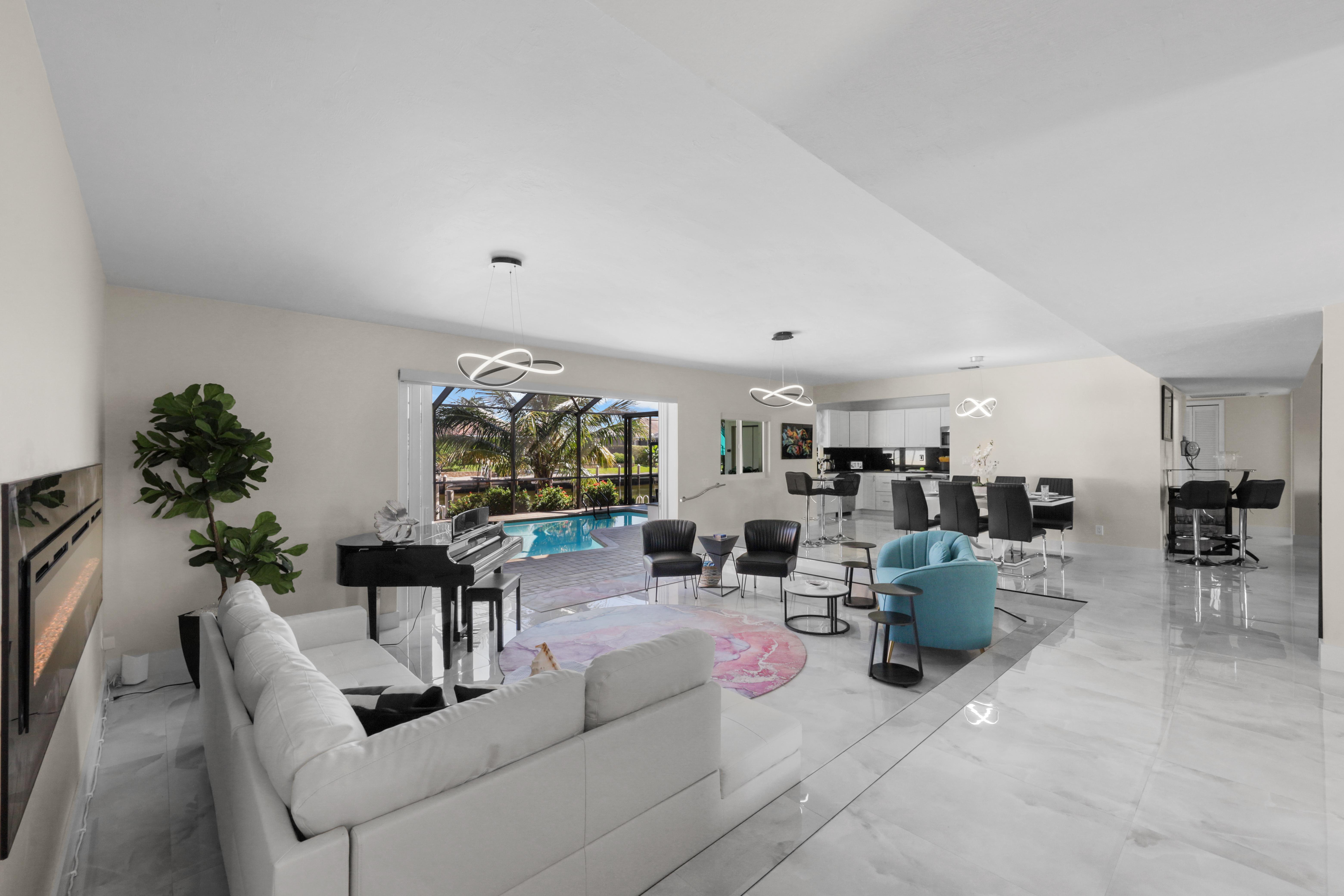 Step into your very own waterfront retreat on Marco Island, where tropical beauty meets modern coastal comfort. This four-bedroom, three-and-a-half-bathroom, 2,750-square-foot home welcomes you with a palm tree-lined driveway and lush tropical landscaping, setting the tone for an unforgettable getaway. It sleeps eight, with two king beds, two twin-sized bunk beds, one queen-sized murphy bed, and three-and-a-half bathrooms. It also comes with a two-car garage.