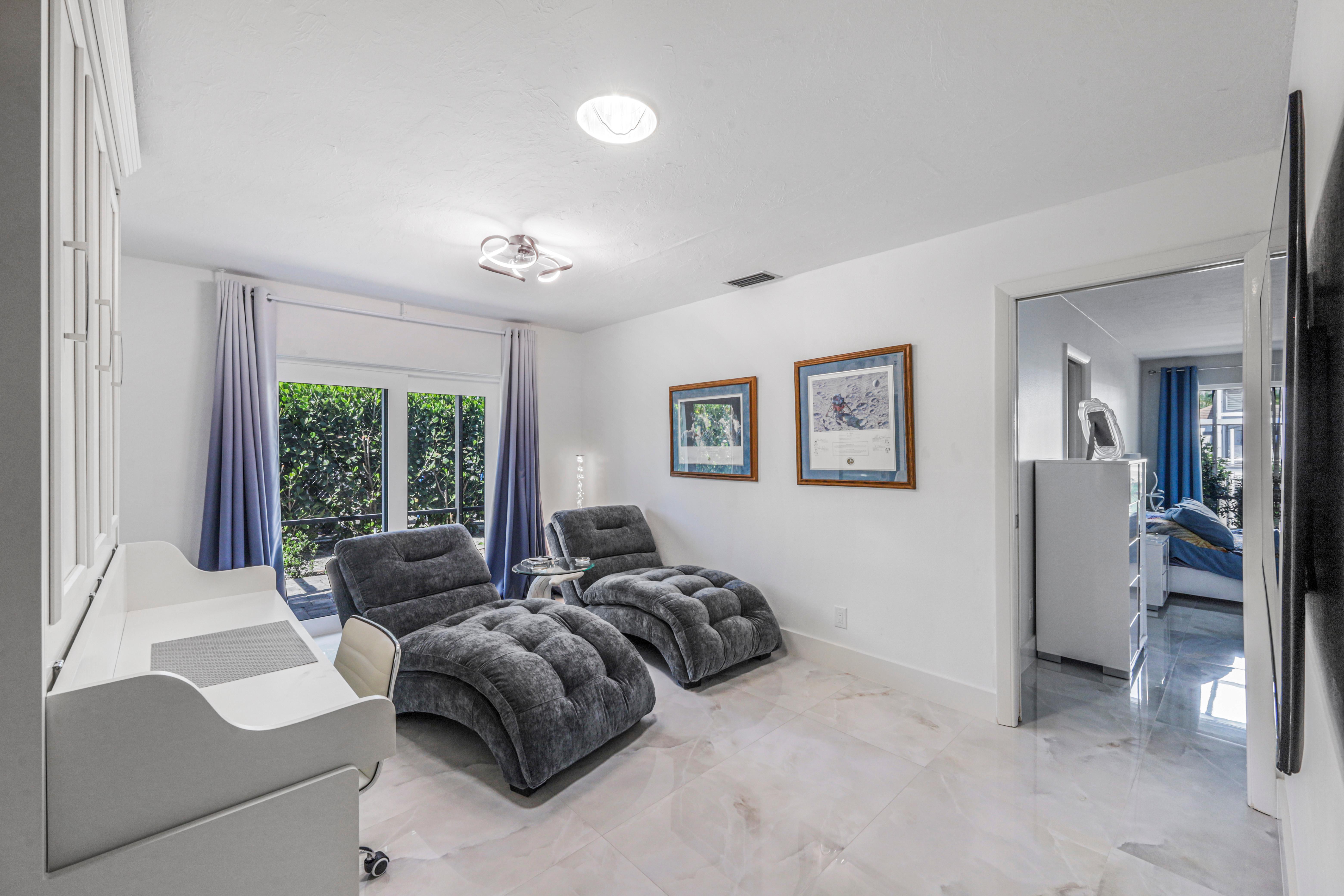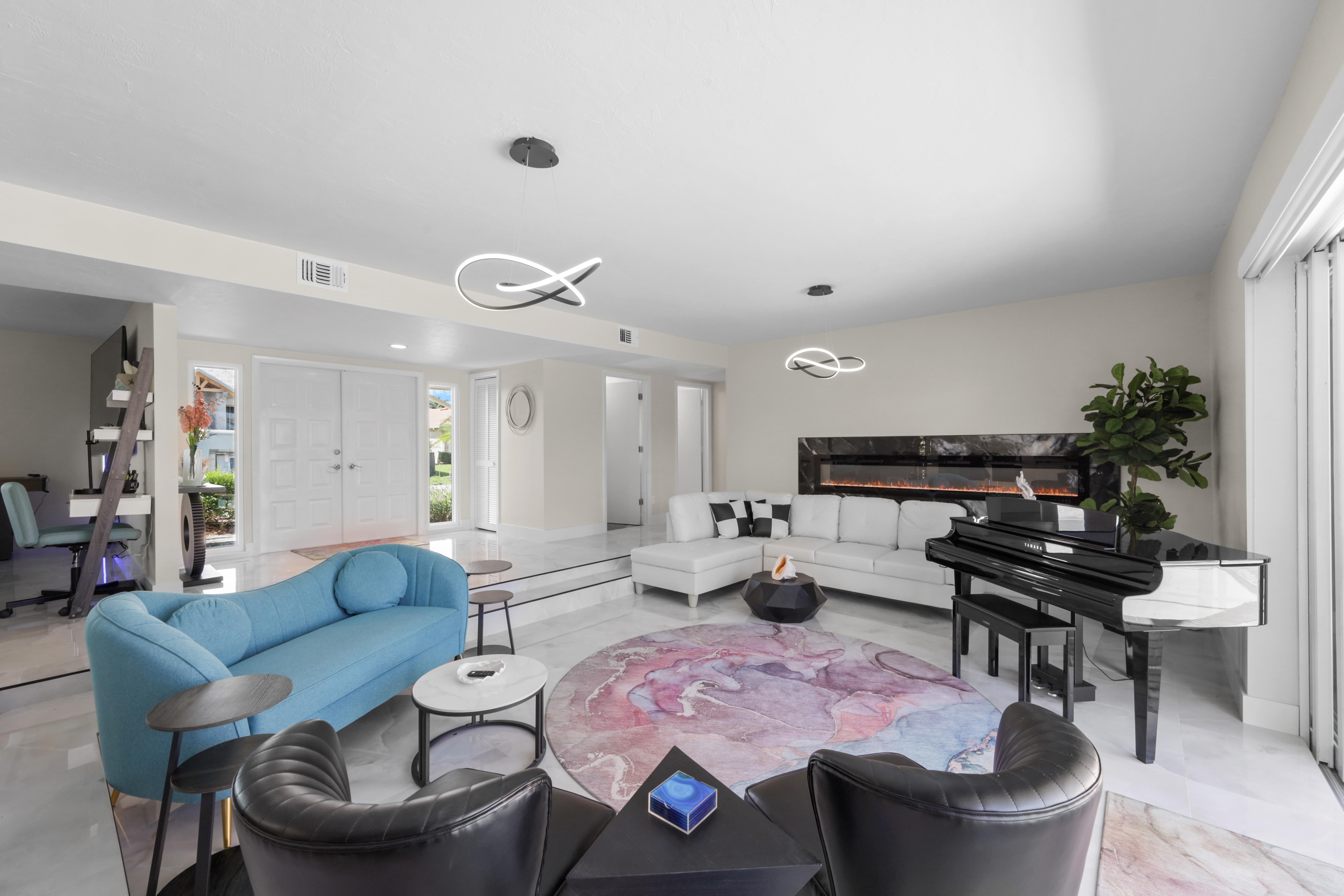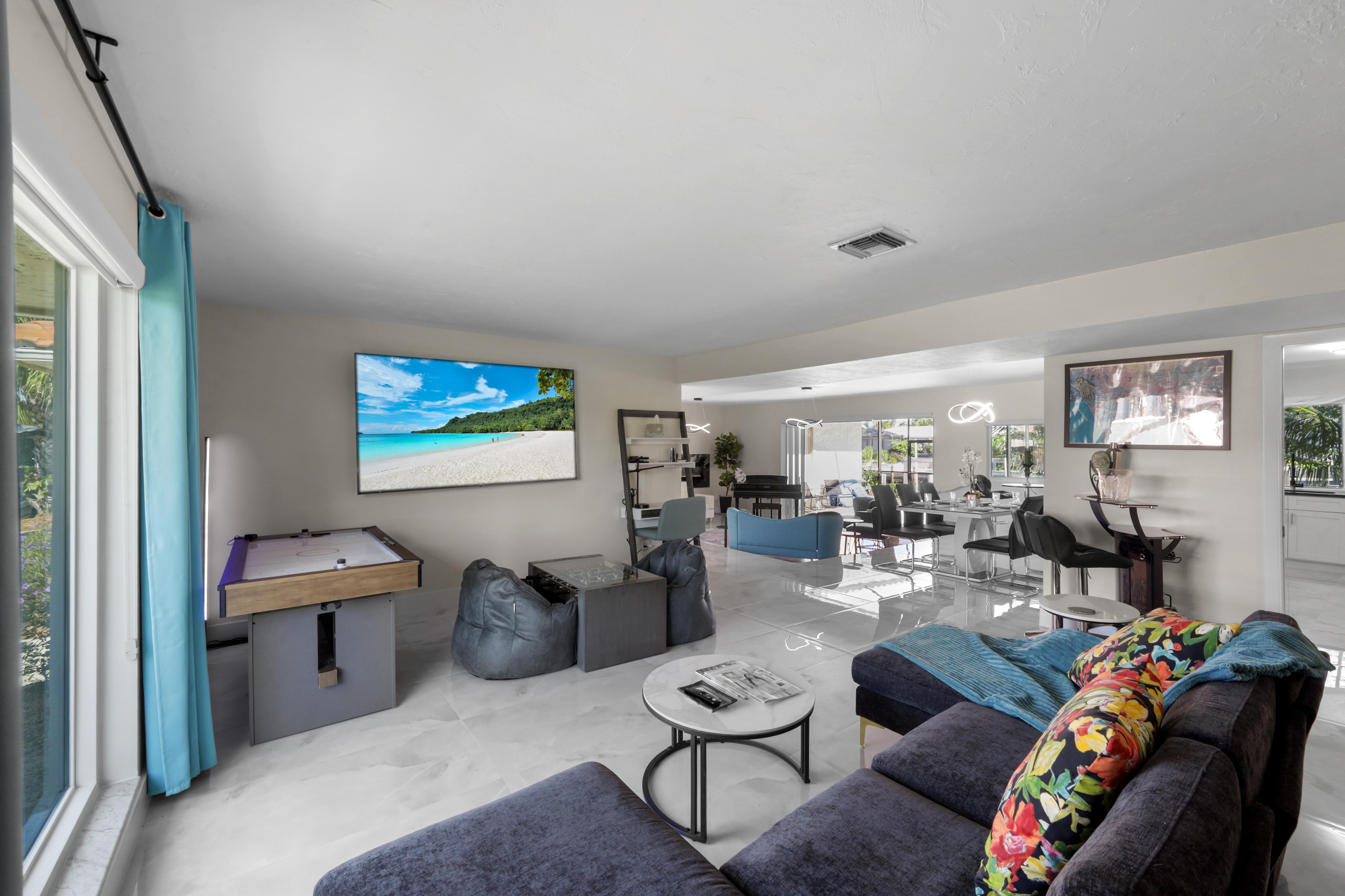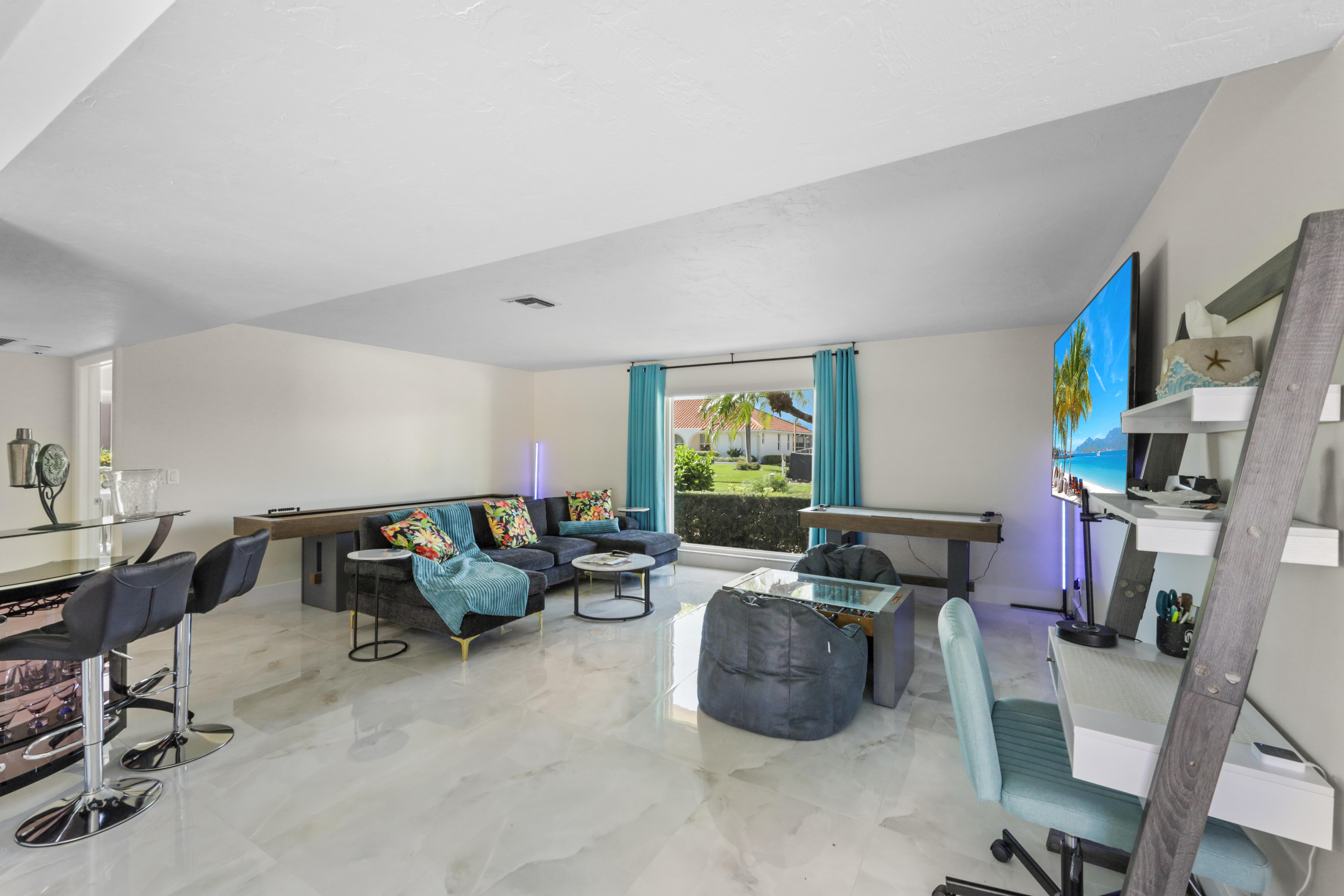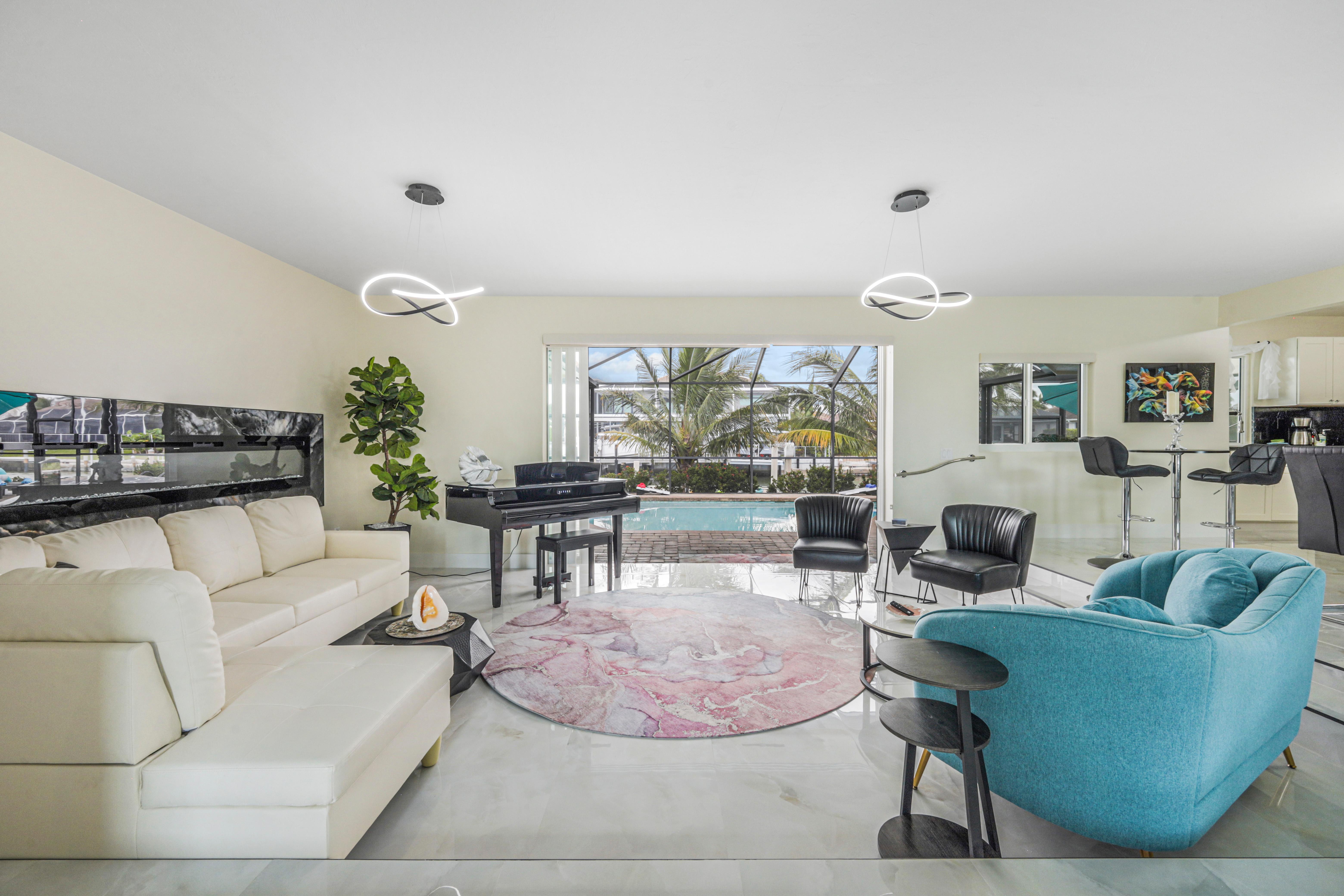 Inside, the spacious living room features a large, comfy sectional, additional couch and chairs surrounding a virtual fireplace, and direct sliding door access to the lanai, creating a seamless indoor-outdoor flow. Nearby, a relaxing family room offers another inviting couch and...