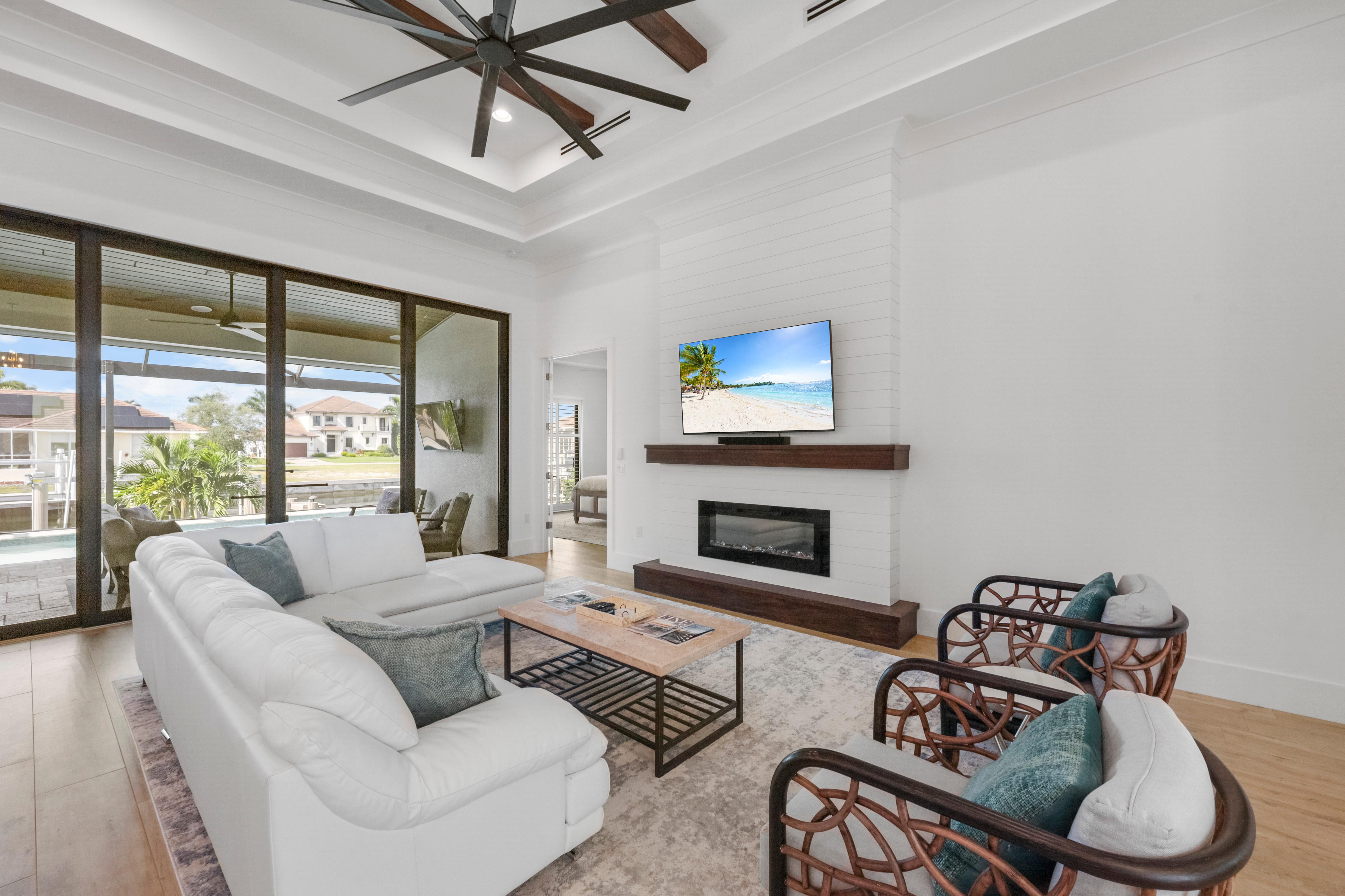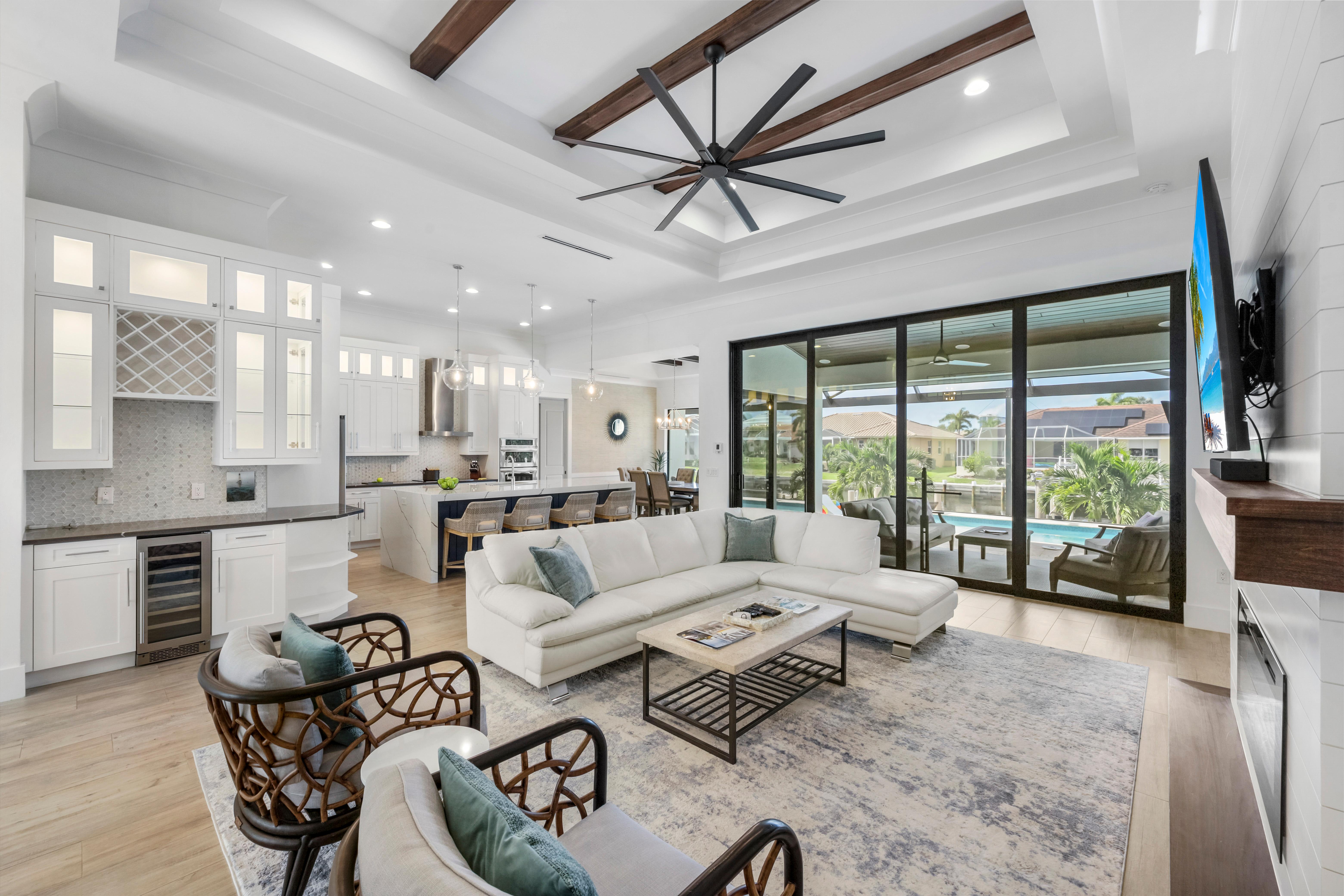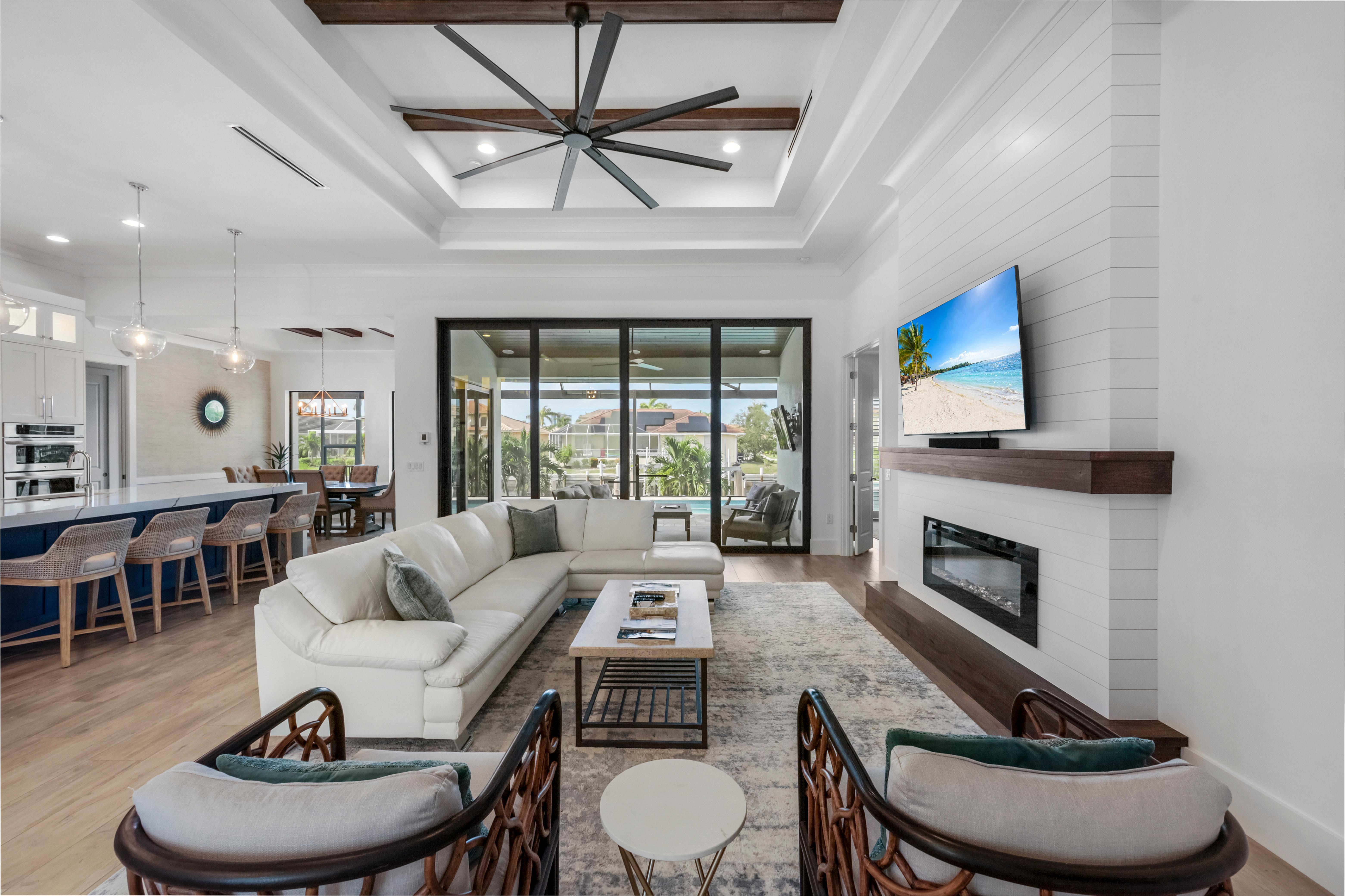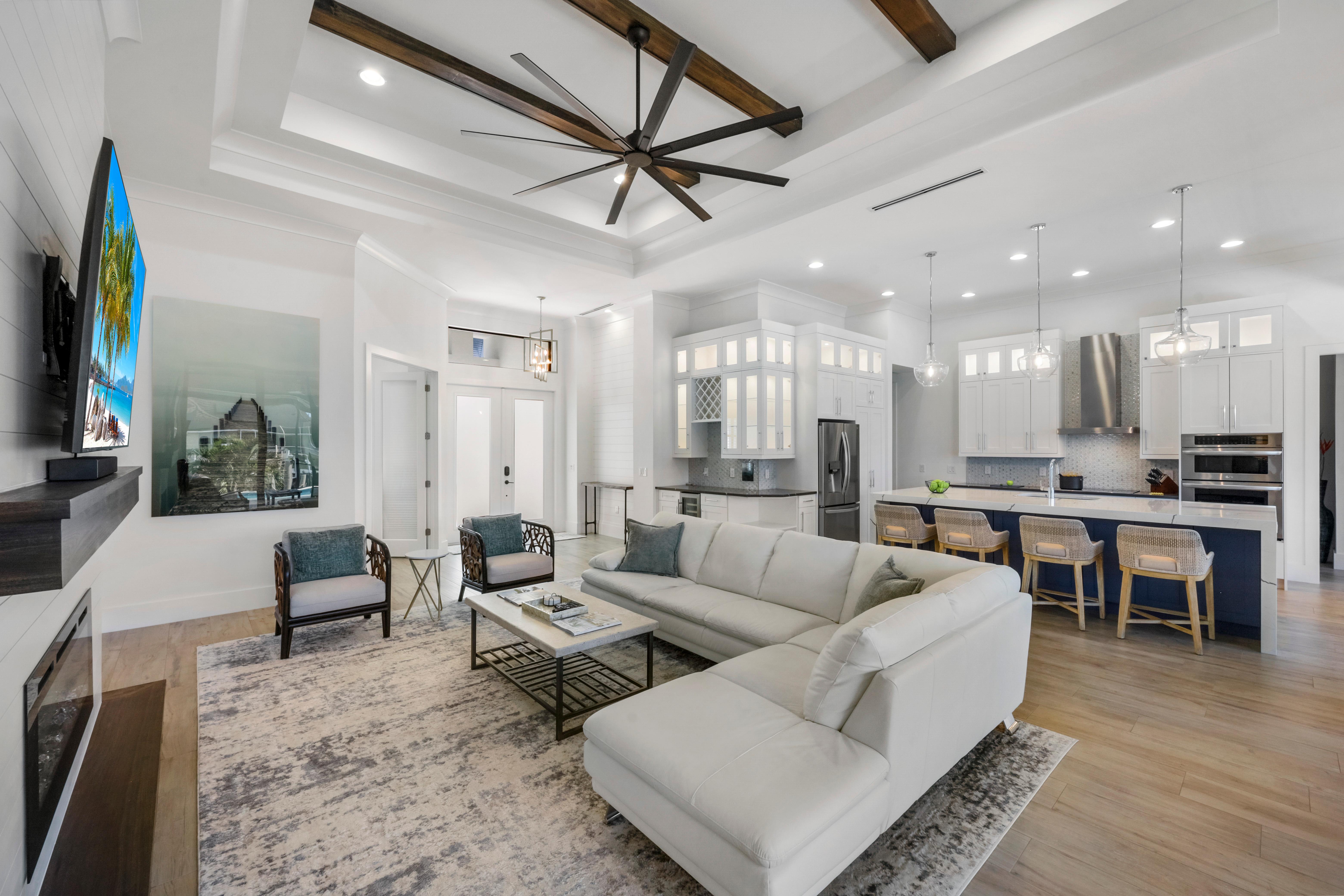 Step inside to a bright interior decorated in a modern ocean and beach theme. The grand living room features a sectional sofa and chairs surrounding the television, creating the ideal spot for movie nights or afternoons. Sliding glass doors open to the lanai, blending indoors and out, filling the home...