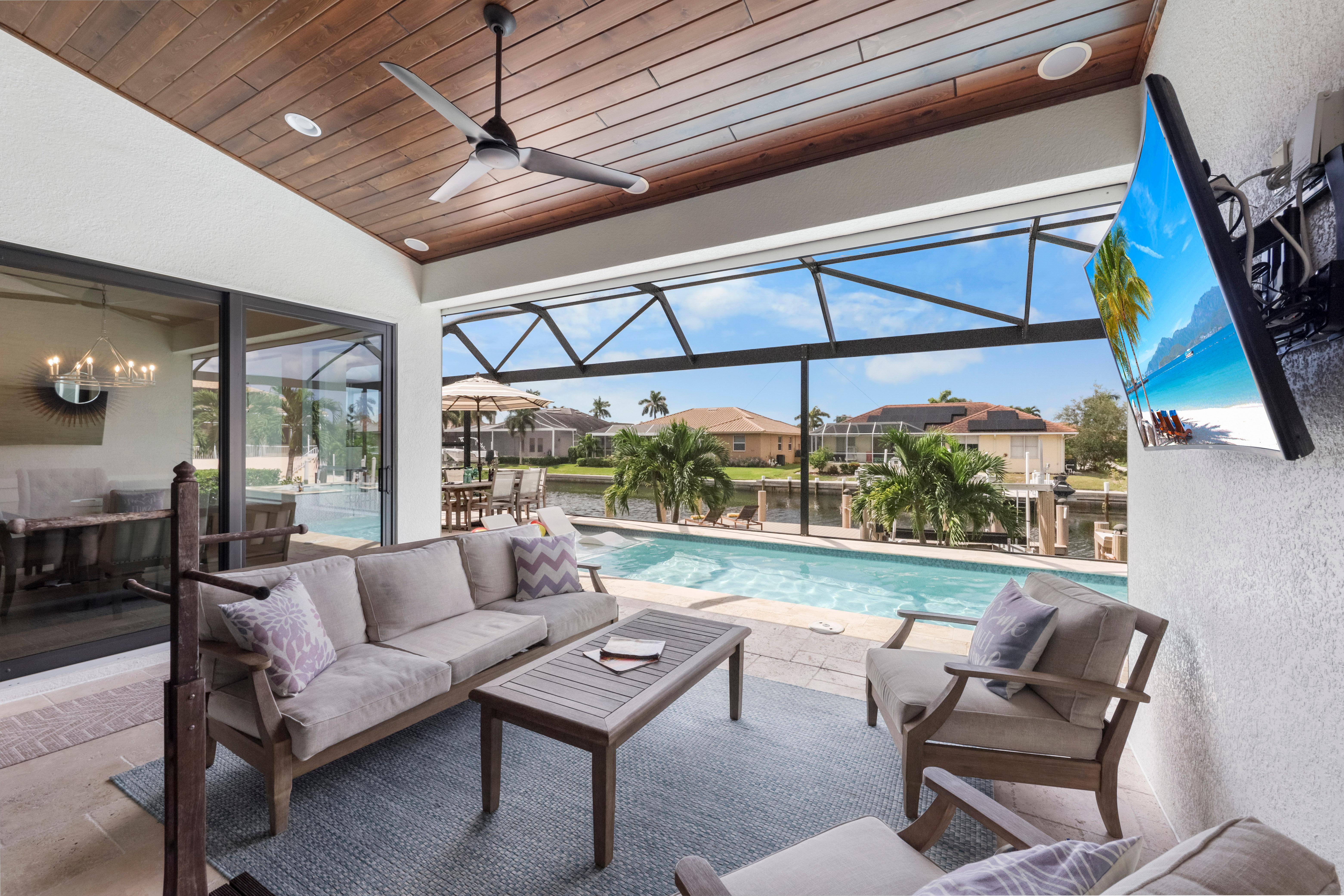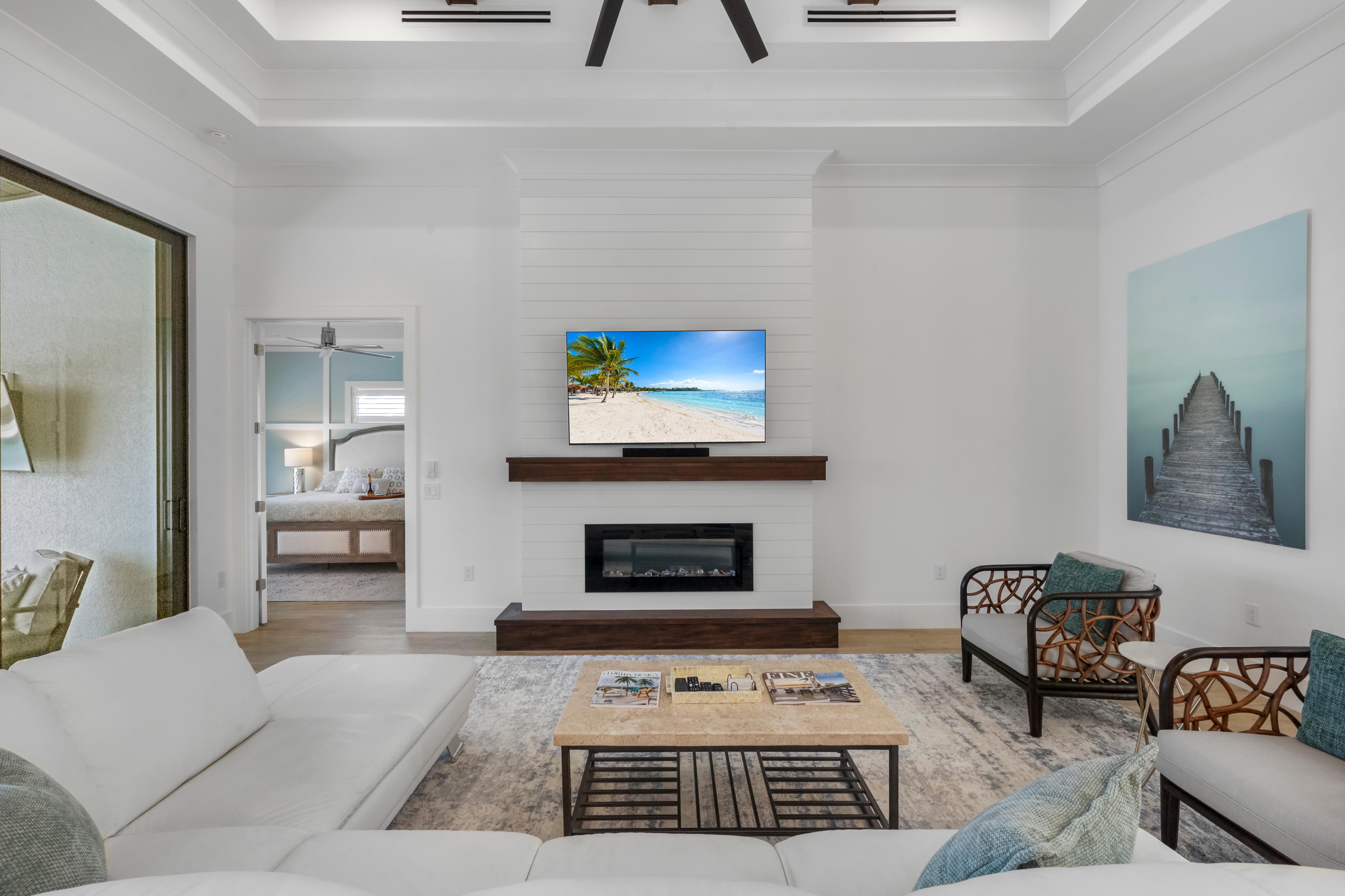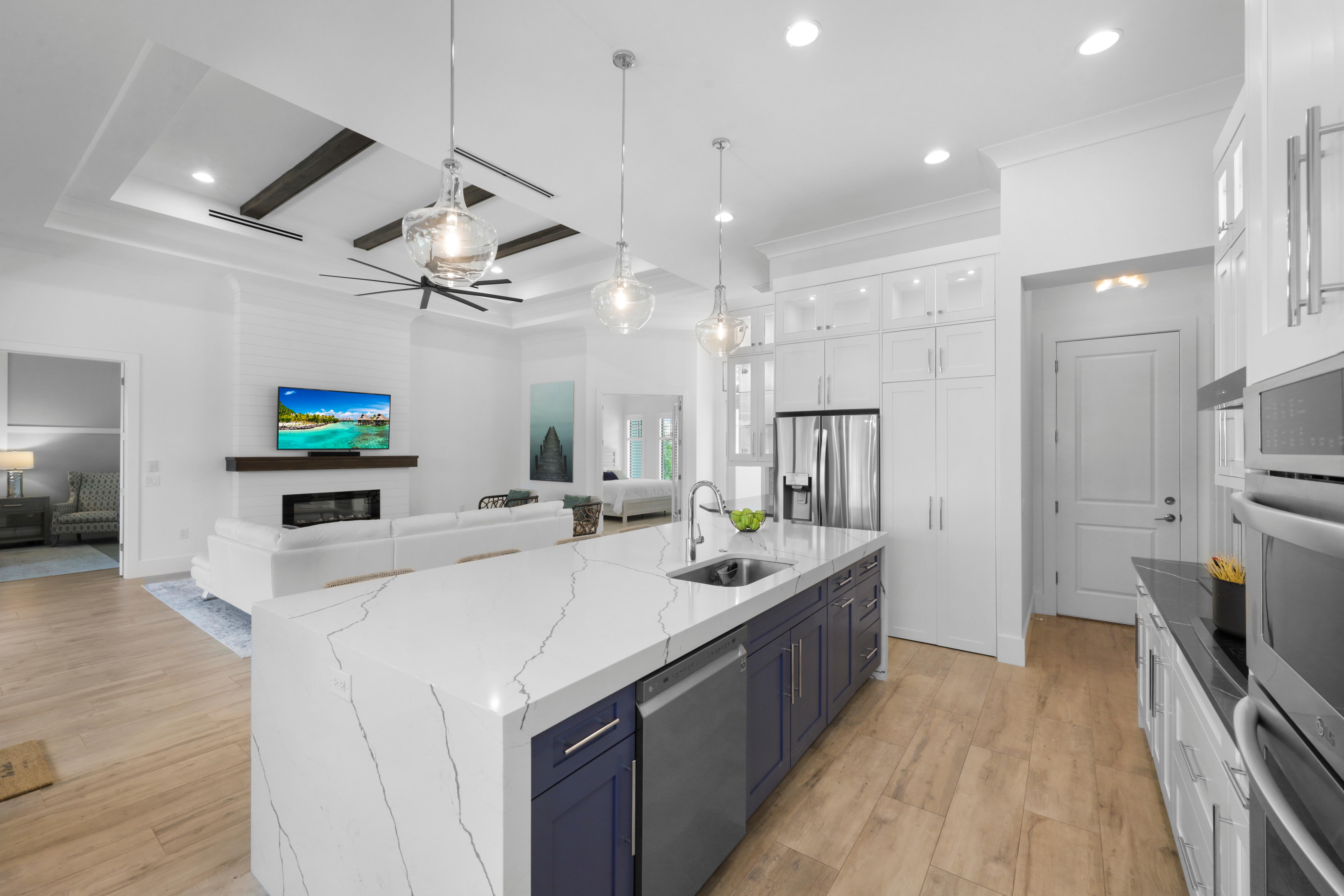 Step inside to a bright interior decorated in a modern ocean and beach theme. The grand living room features a sectional sofa and chairs surrounding the television, creating the ideal spot for movie nights or afternoons. Sliding glass doors open to the lanai, blending indoors and out, filling the home...