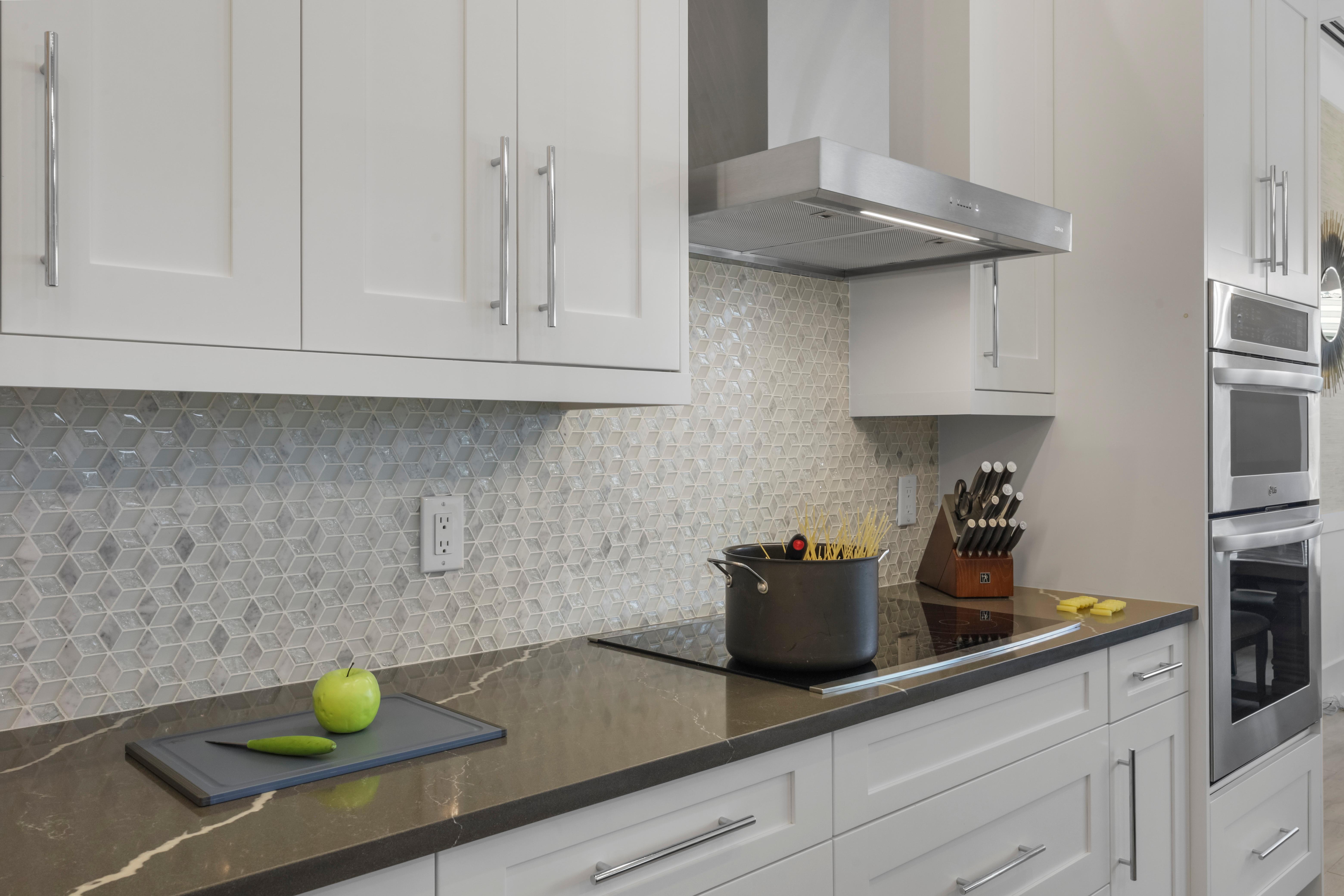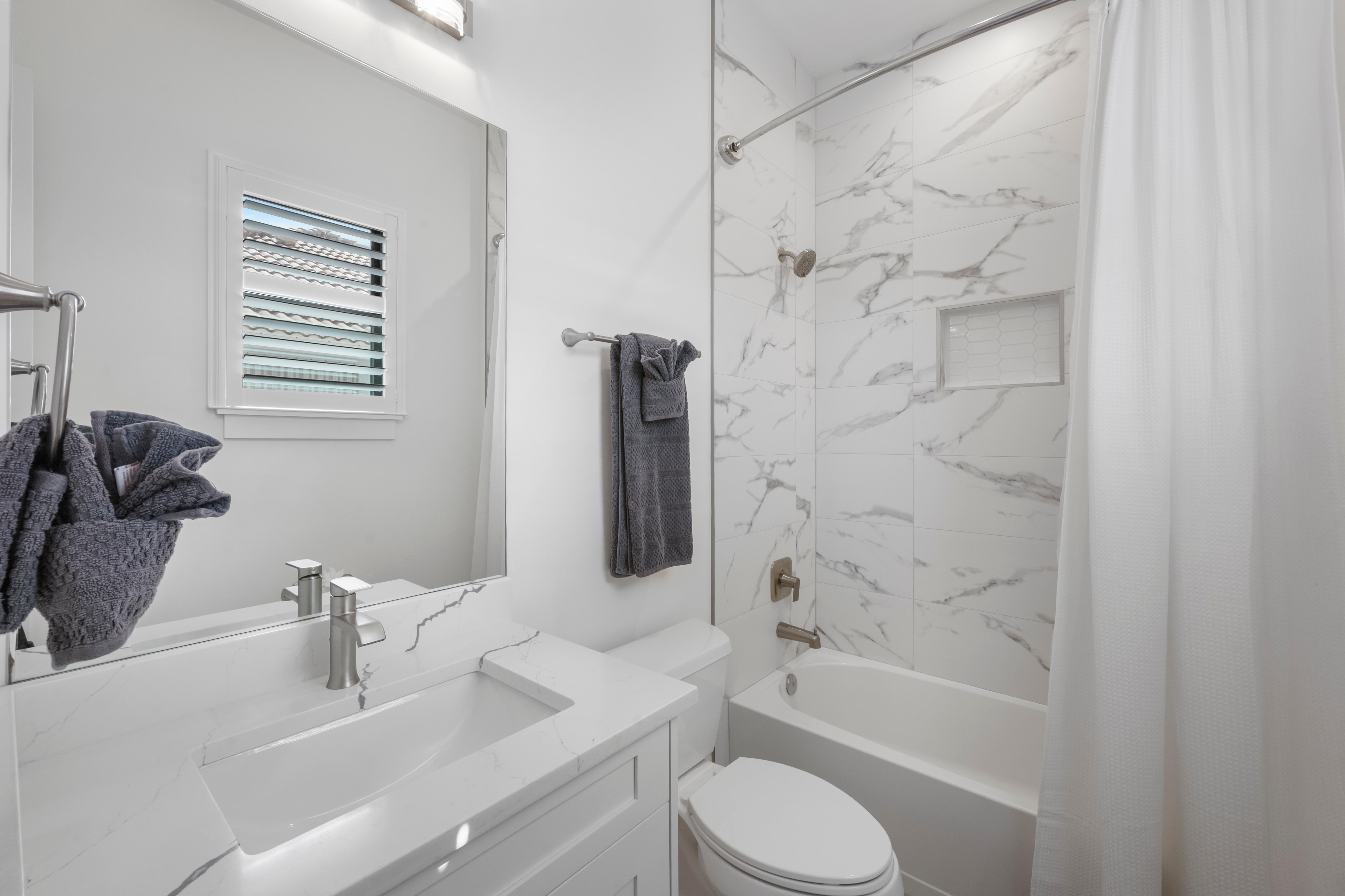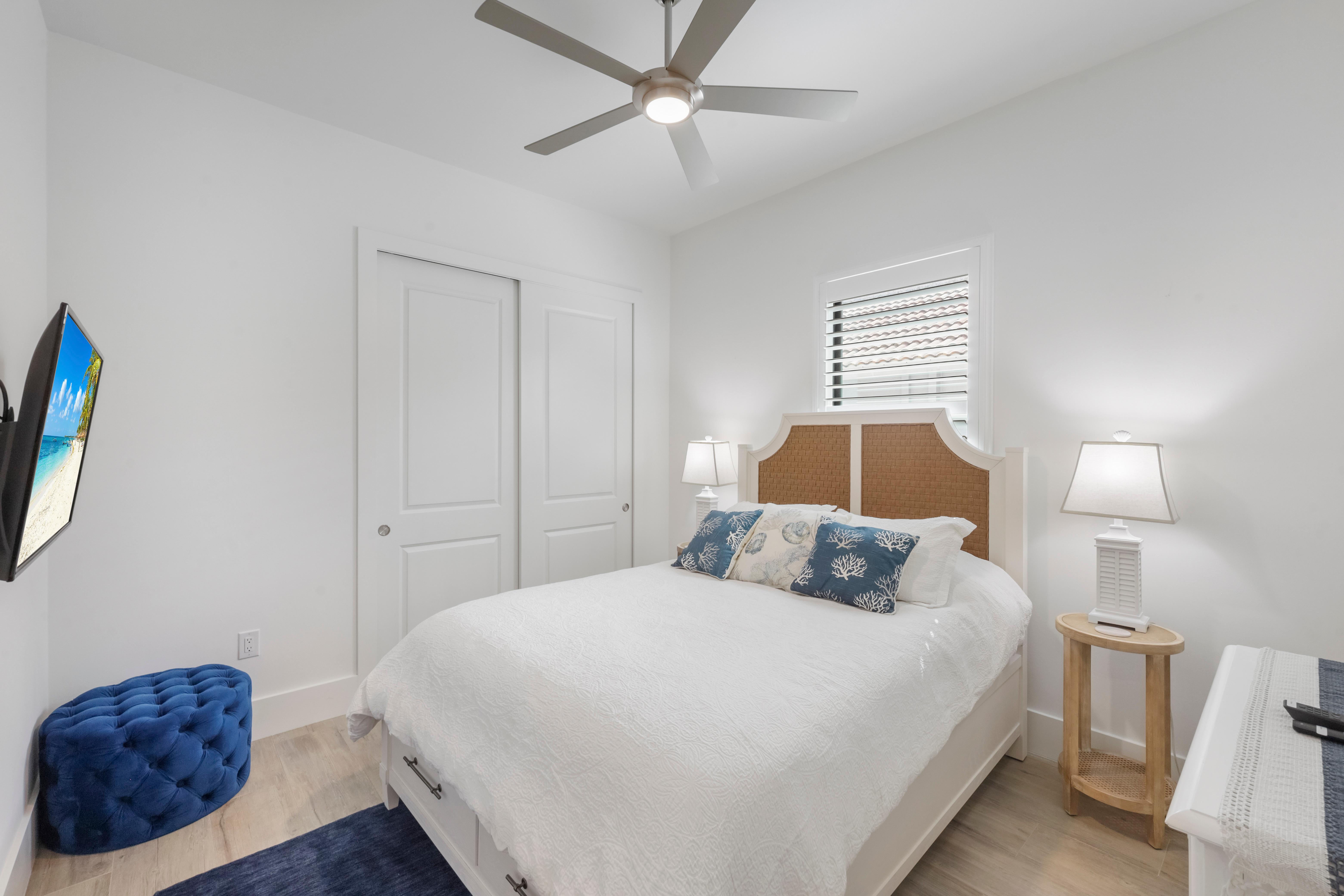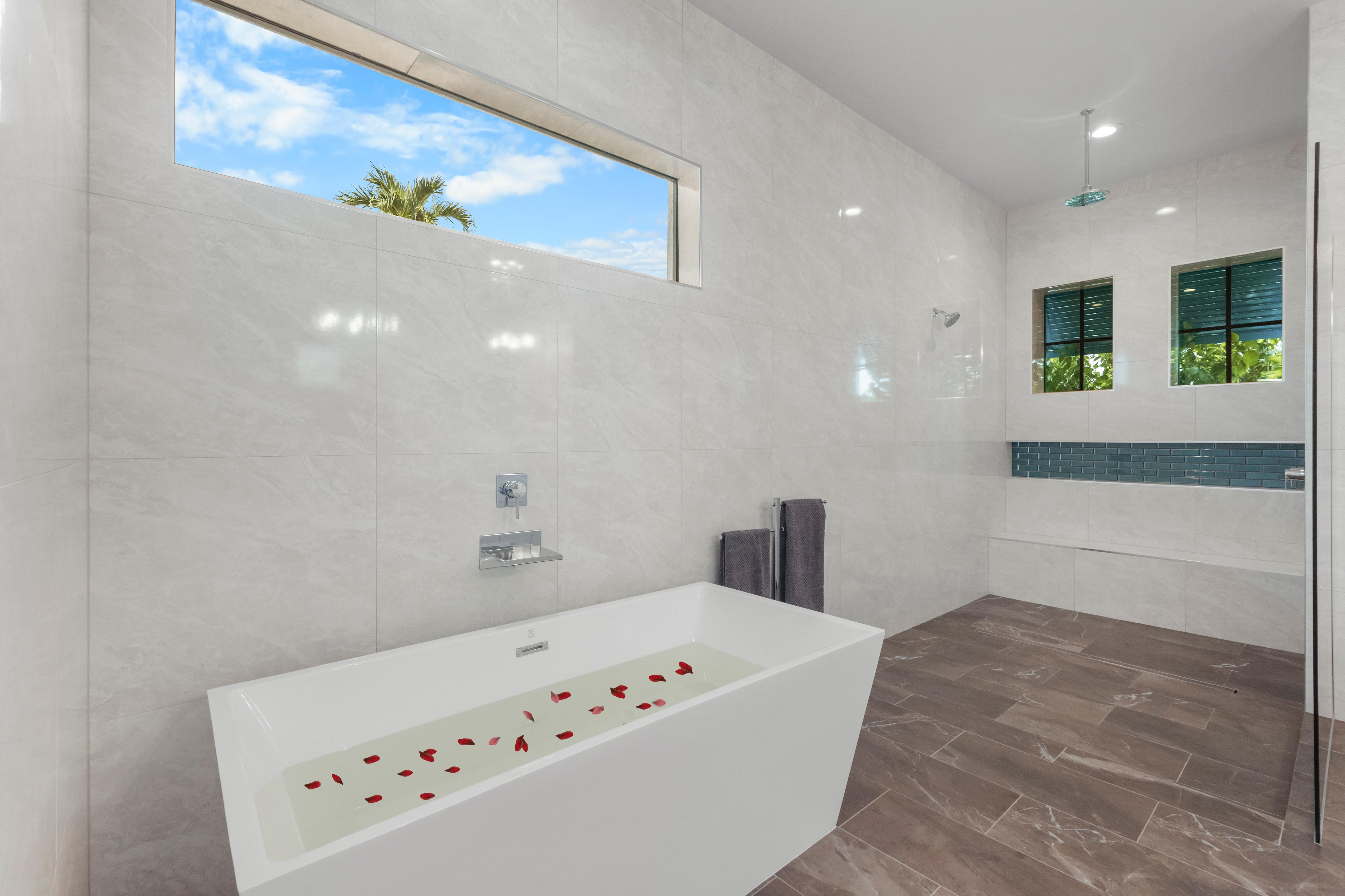 Step inside to a bright interior decorated in a modern ocean and beach theme. The grand living room features a sectional sofa and chairs surrounding the television, creating the ideal spot for movie nights or afternoons. Sliding glass doors open to the lanai, blending indoors and out, filling the home...