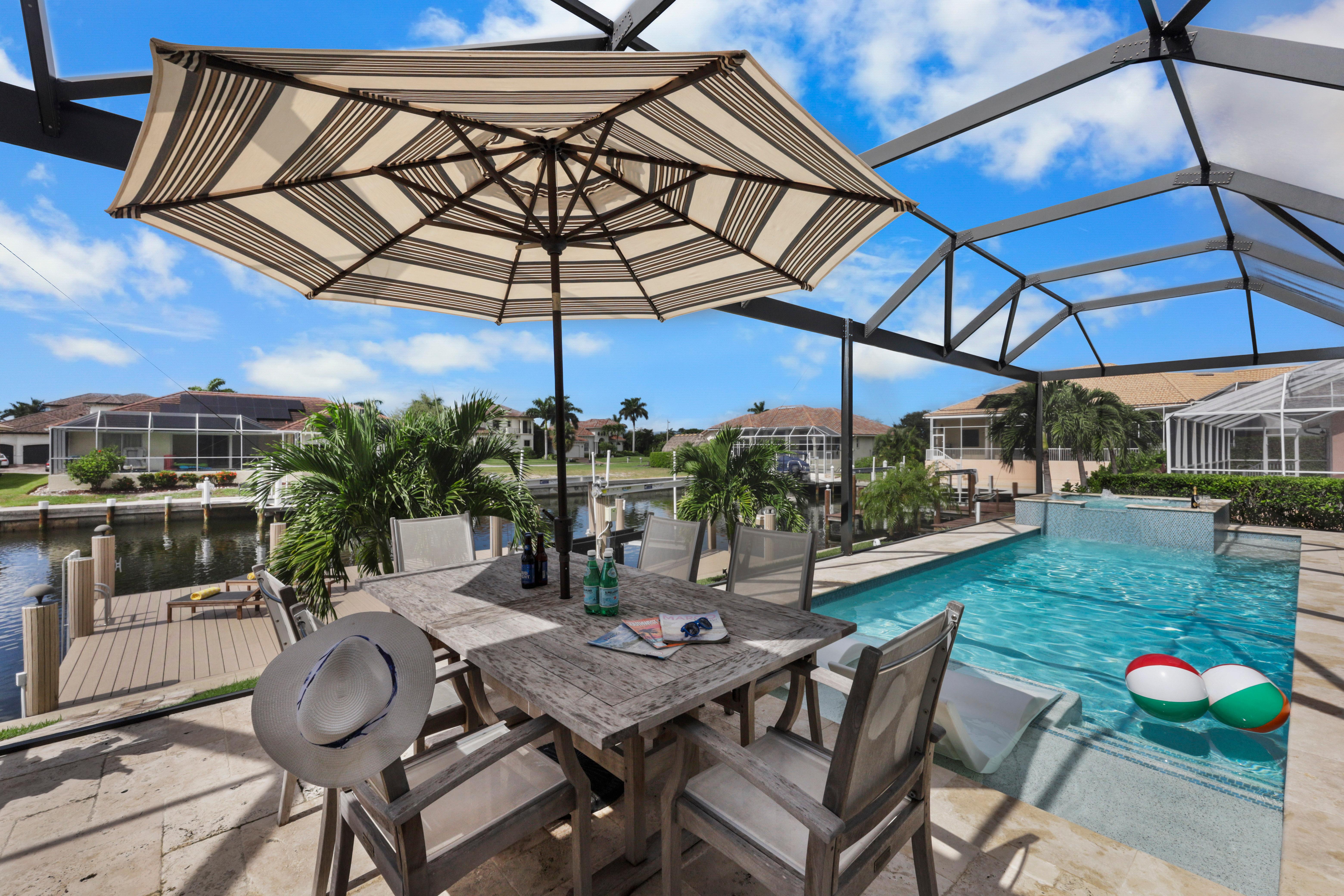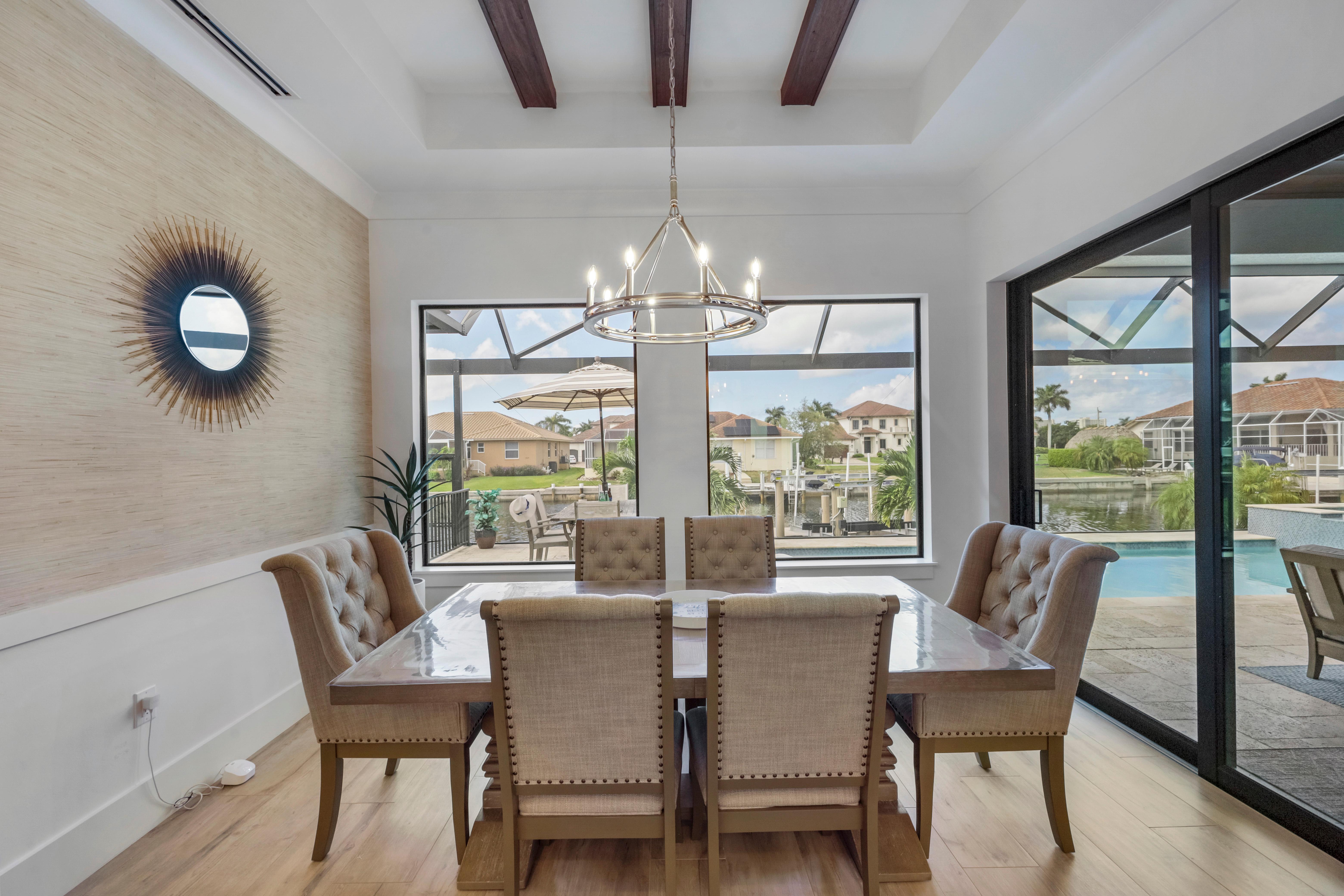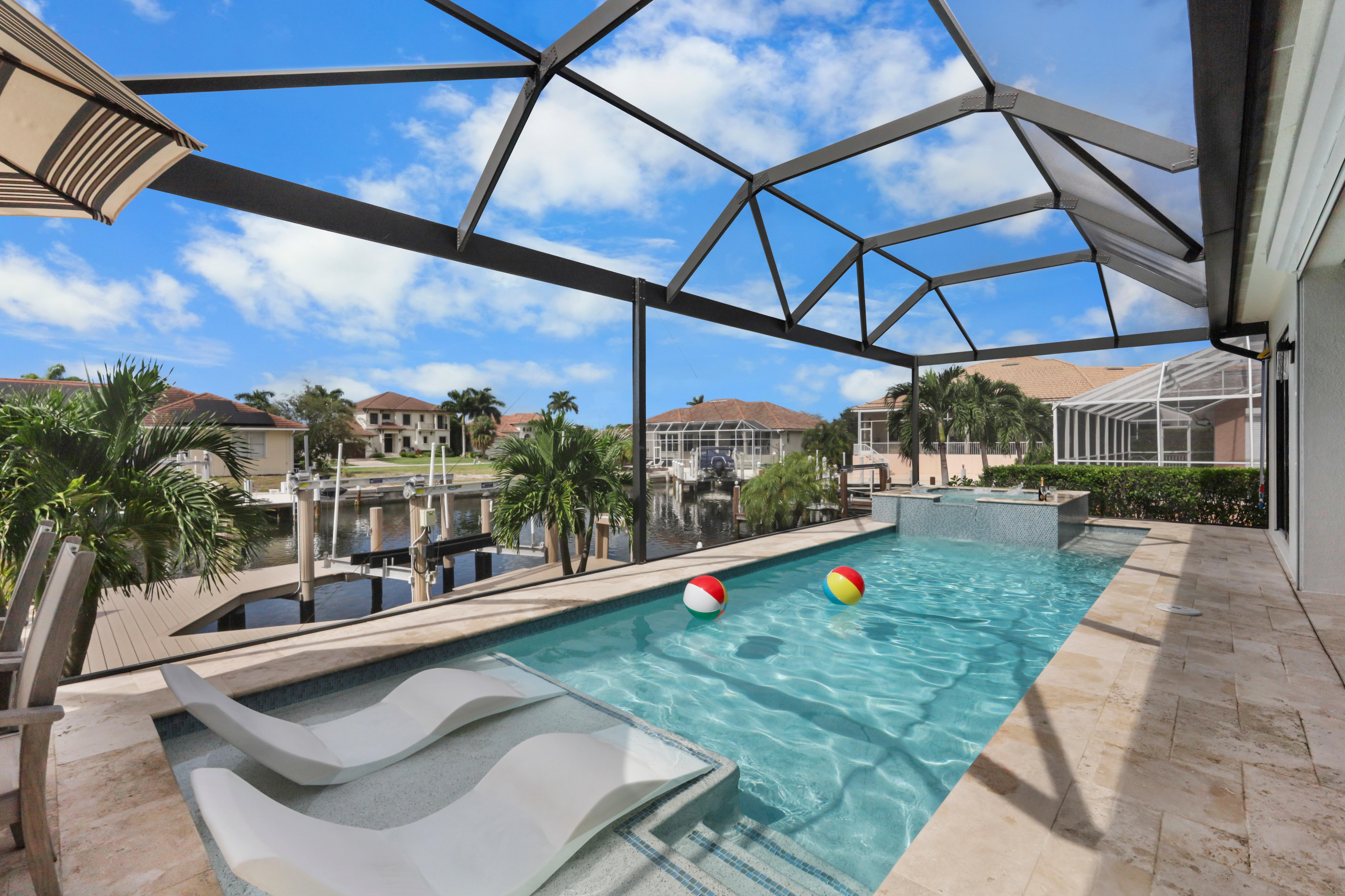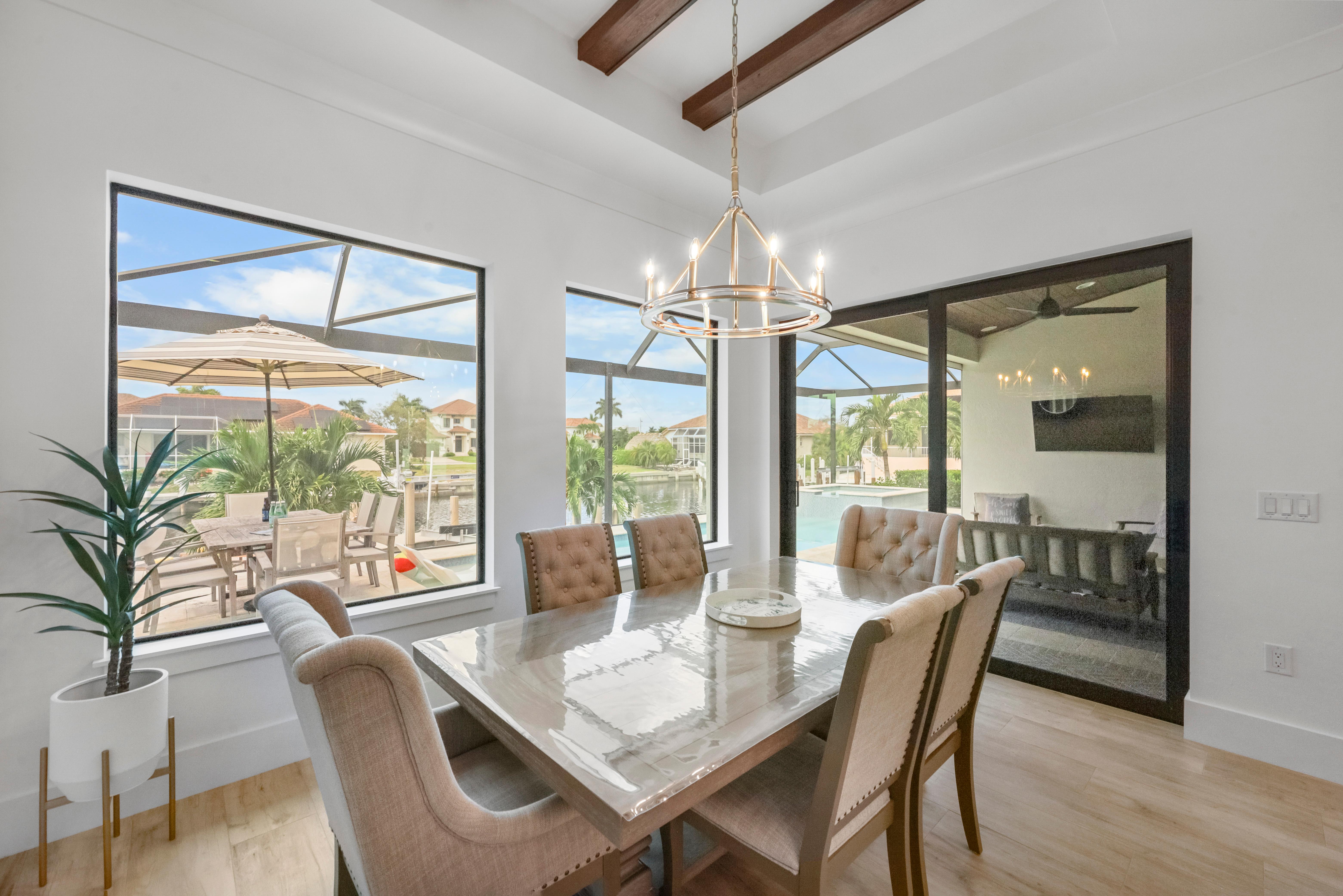Arrive in style at this 2,500-square-foot Marco Island waterfront retreat, where a welcoming arched driveway lined with palm trees and tropical landscaping sets the tone for a coastal escape. Designed for comfort, this four-bedroom, three-bathroom home has everything for an unforgettable getaway. It sleeps 10, with two king beds, one full bed, one queen-over-queen bunk bed, and three bathrooms. It also comes with a three-car garage.