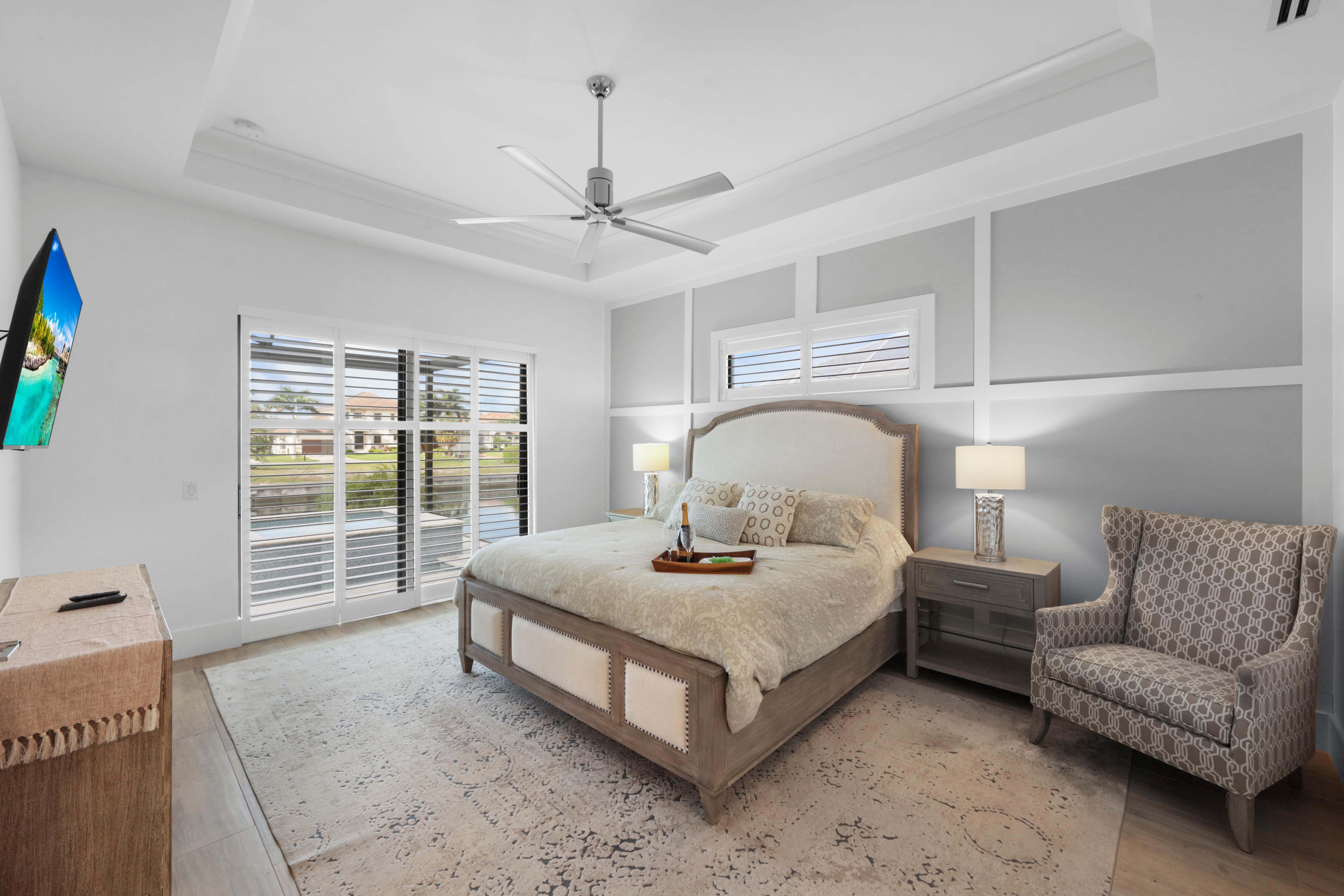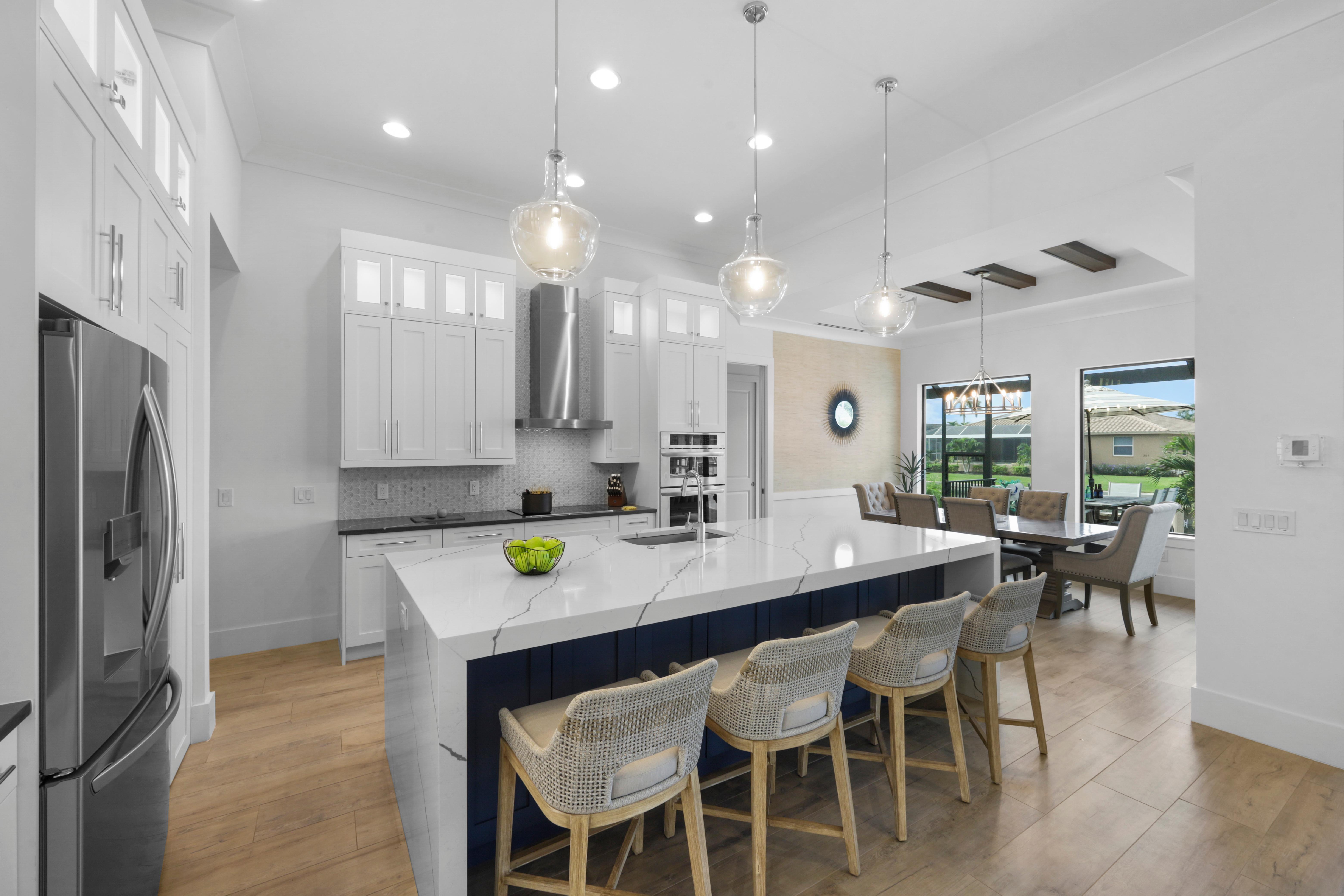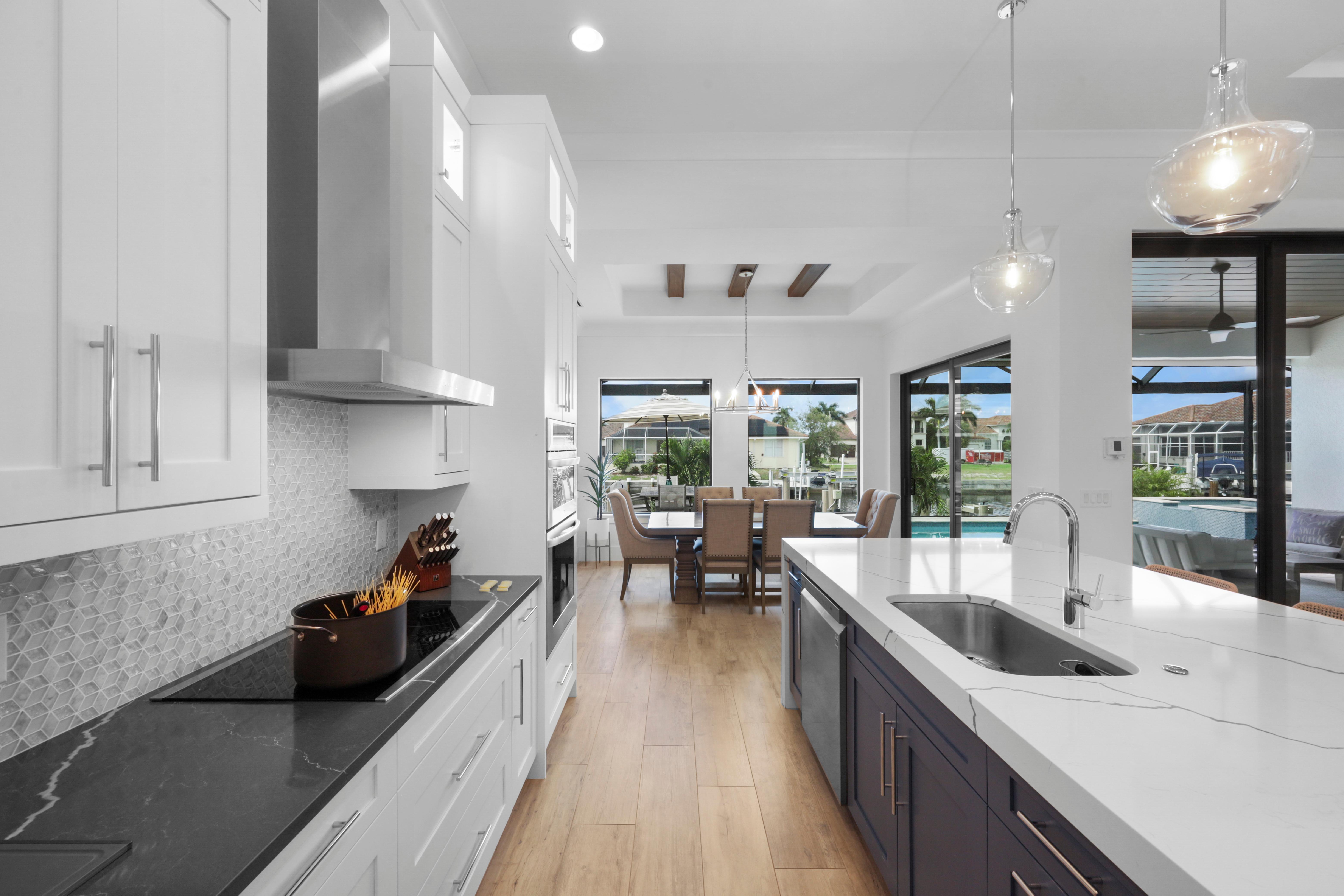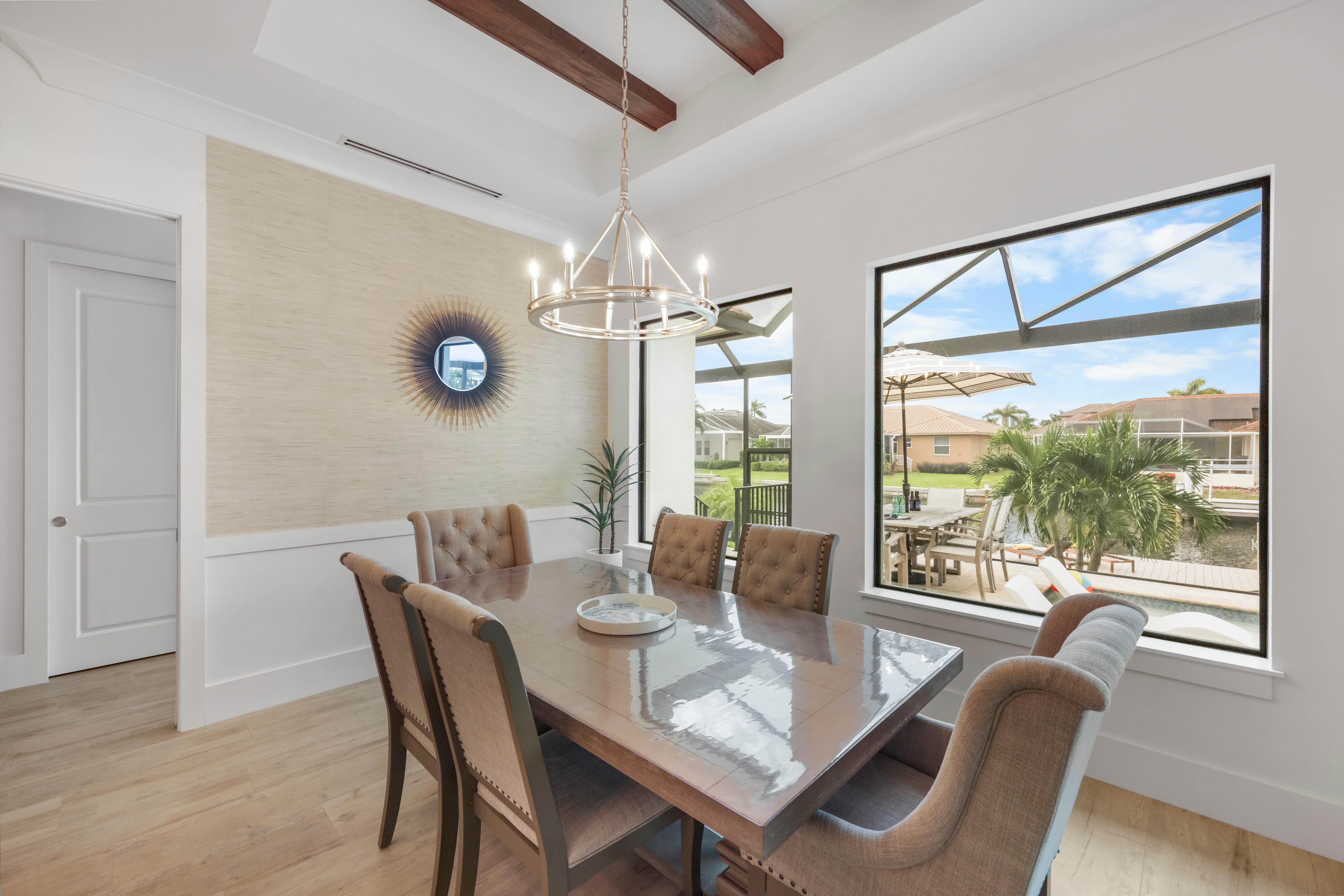 Arrive in style at this 2,500-square-foot Marco Island waterfront retreat, where a welcoming arched driveway lined with palm trees and tropical landscaping sets the tone for a coastal escape. Designed for comfort, this four-bedroom, three-bathroom home has everything for an unforgettable getaway. It sleeps 10, with two king beds, one full bed, one queen-over-queen bunk bed, and three bathrooms. It also comes with a three-car garage.