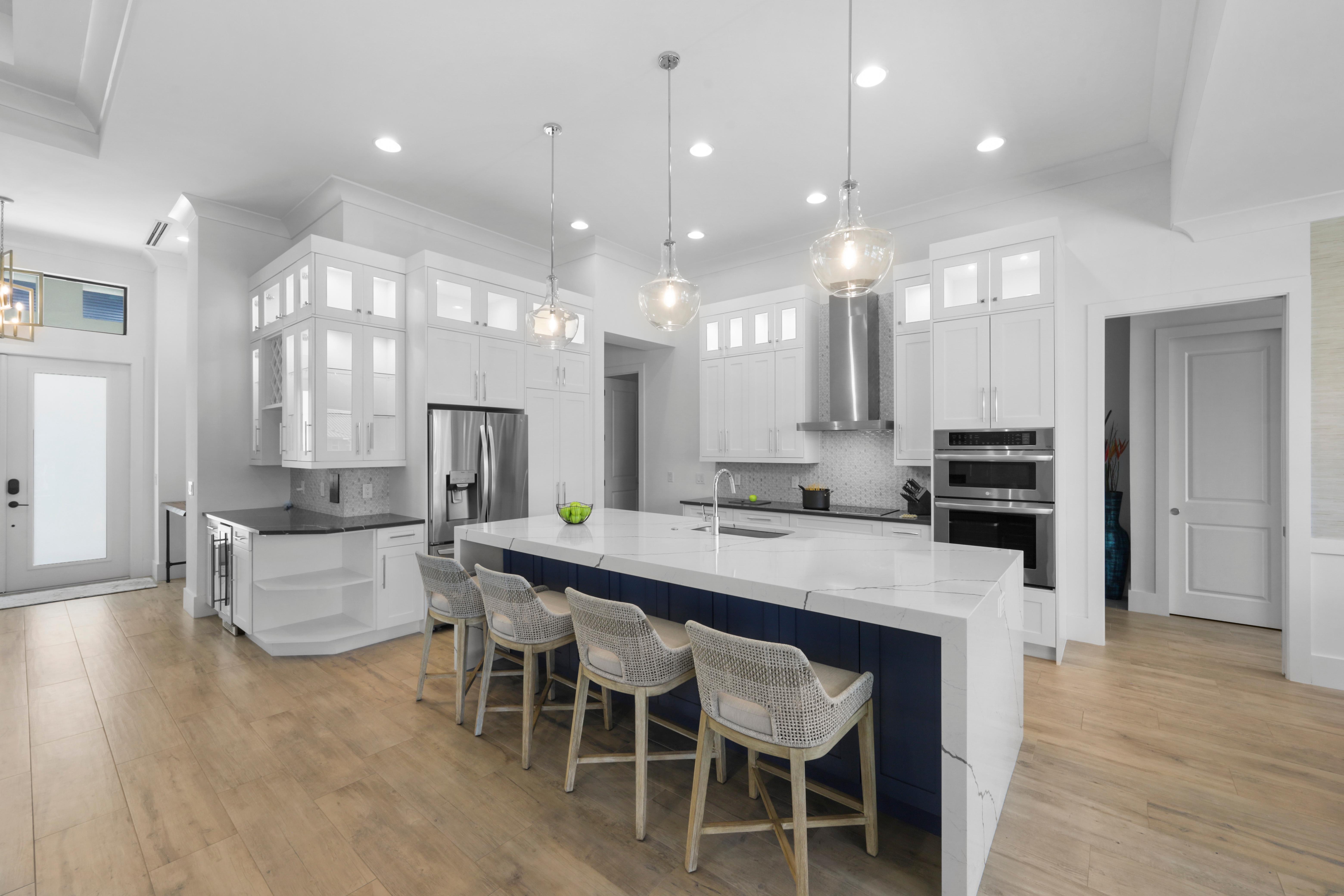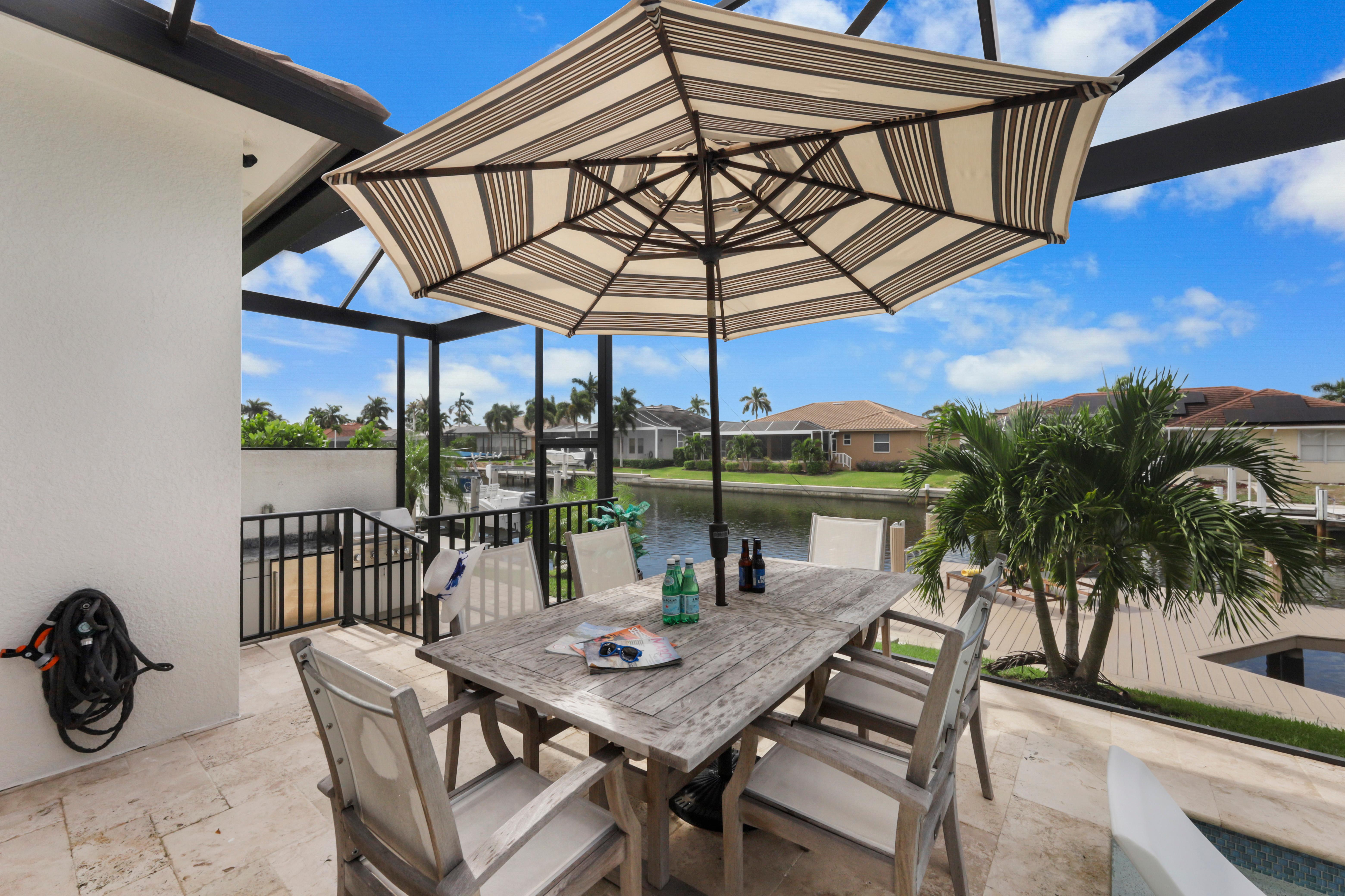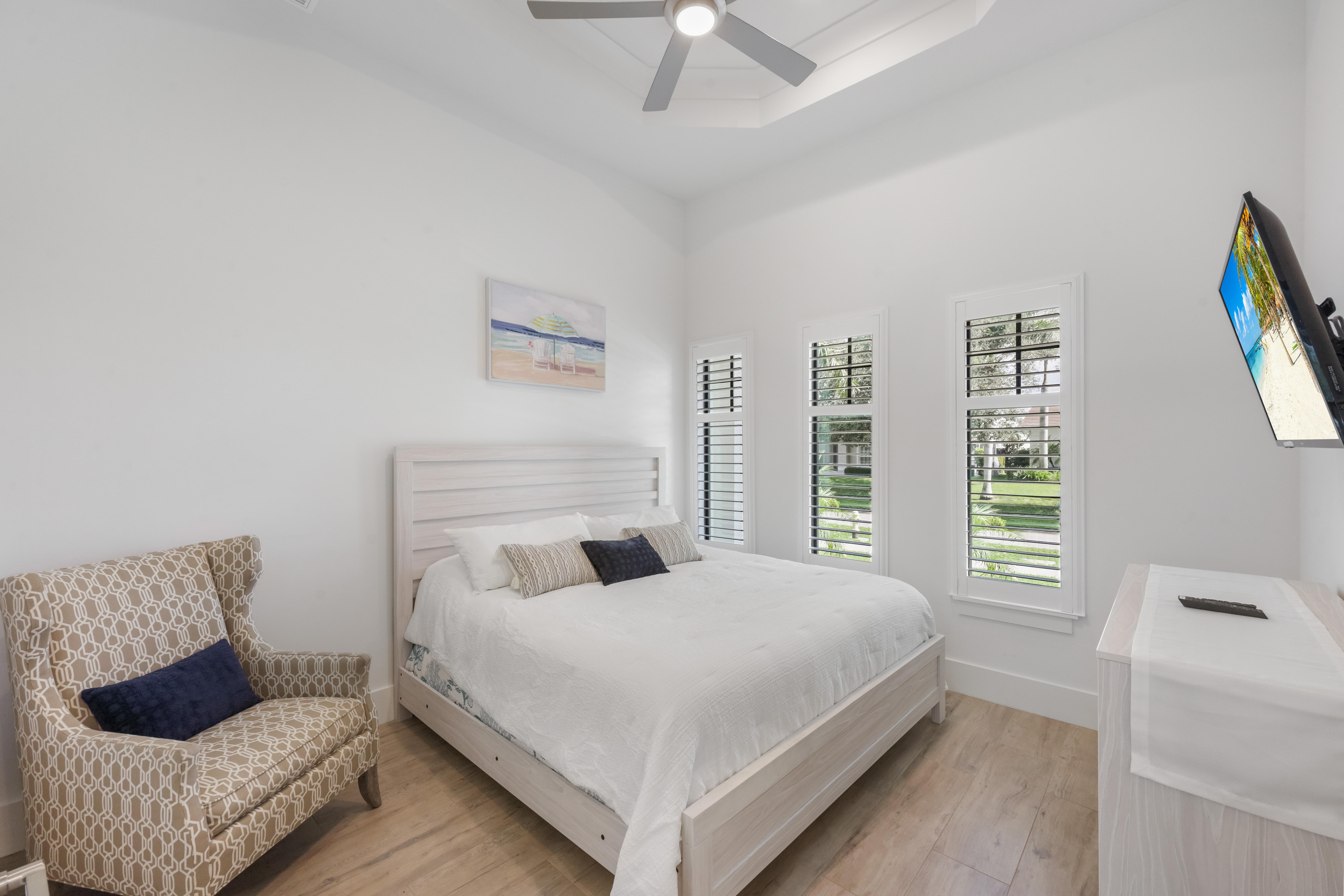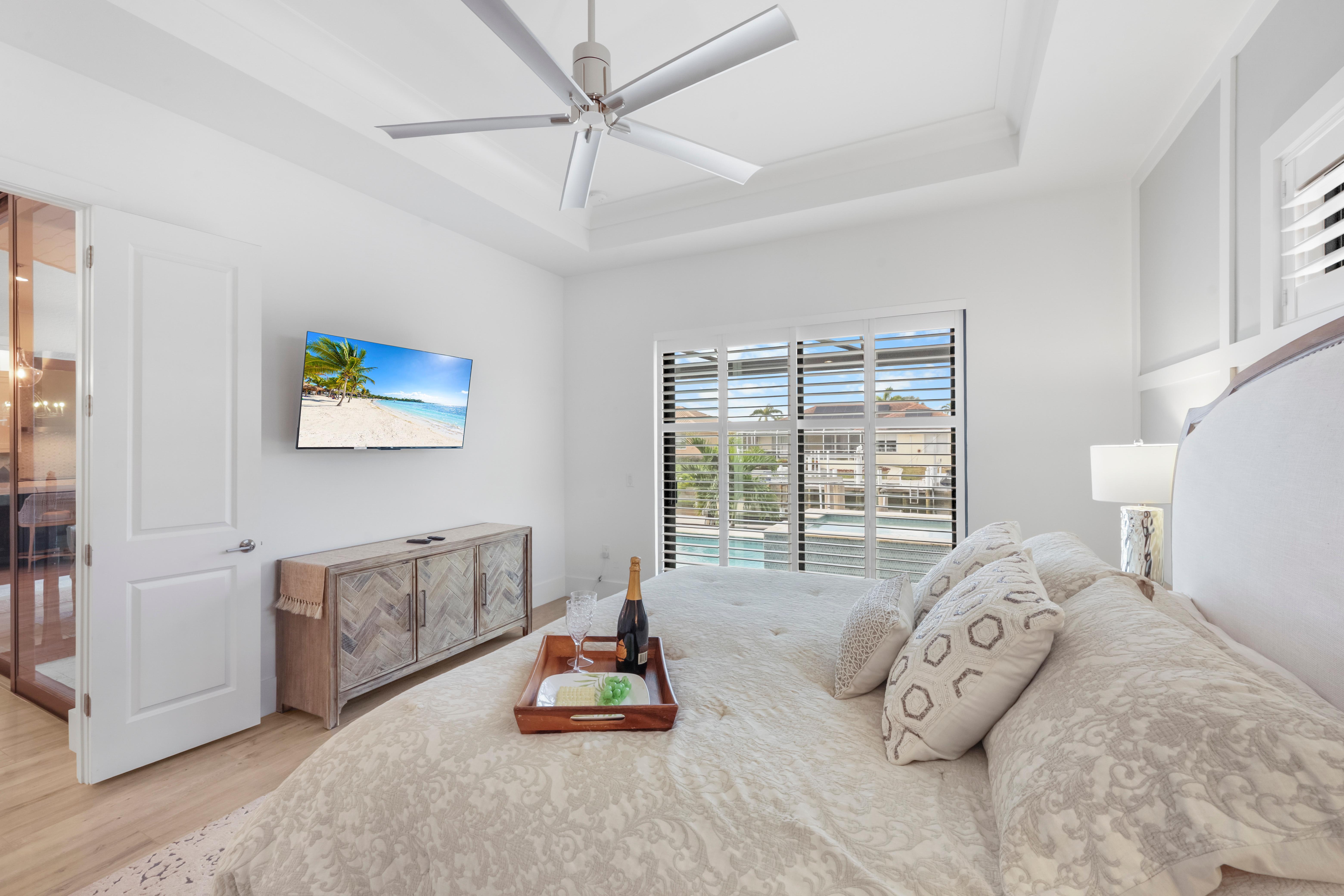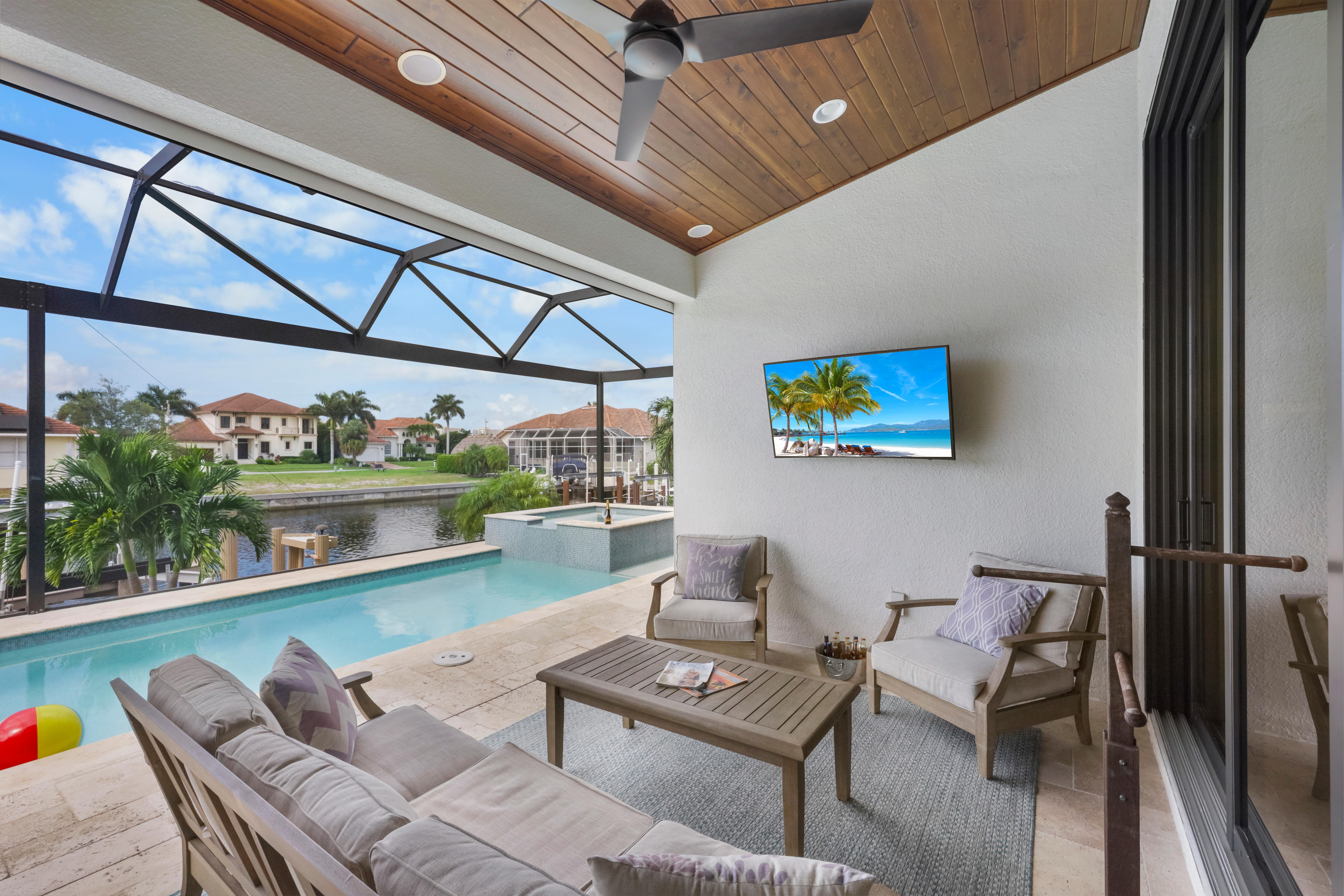 Arrive in style at this 2,500-square-foot Marco Island waterfront retreat, where a welcoming arched driveway lined with palm trees and tropical landscaping sets the tone for a coastal escape. Designed for comfort, this four-bedroom, three-bathroom home has everything for an unforgettable getaway. It sleeps 10, with two king beds, one full bed, one queen-over-queen bunk bed, and three bathrooms. It also comes with a three-car garage.