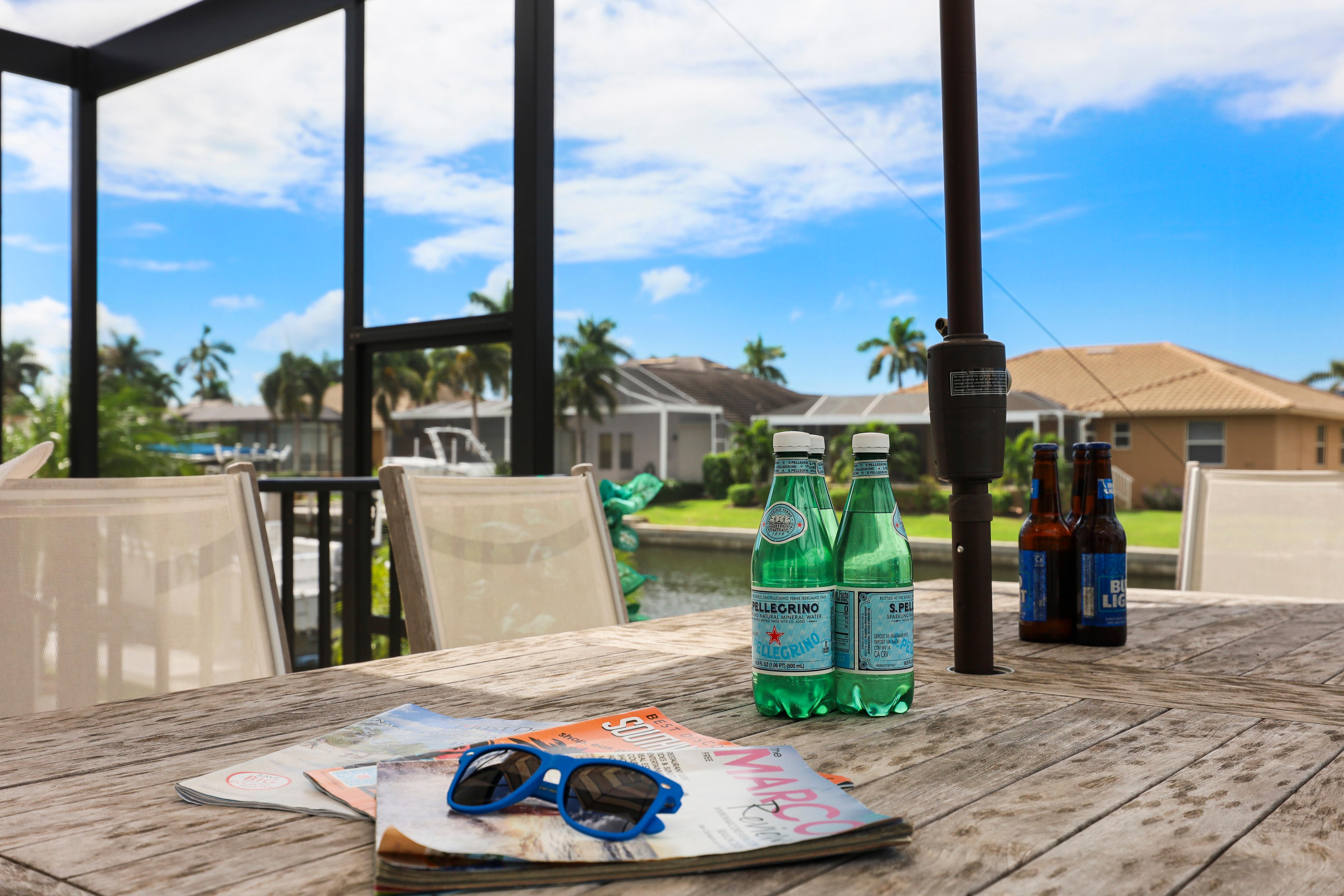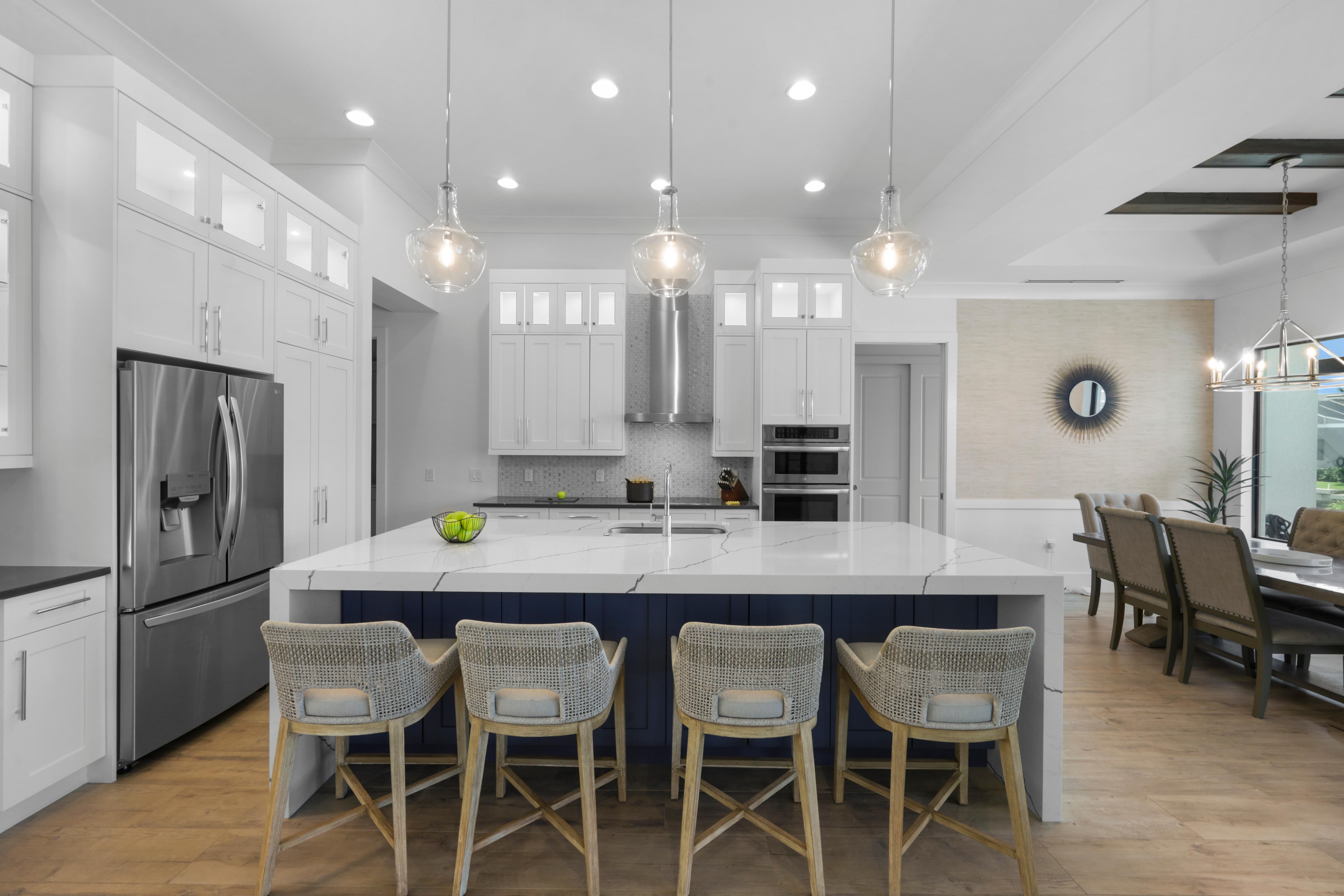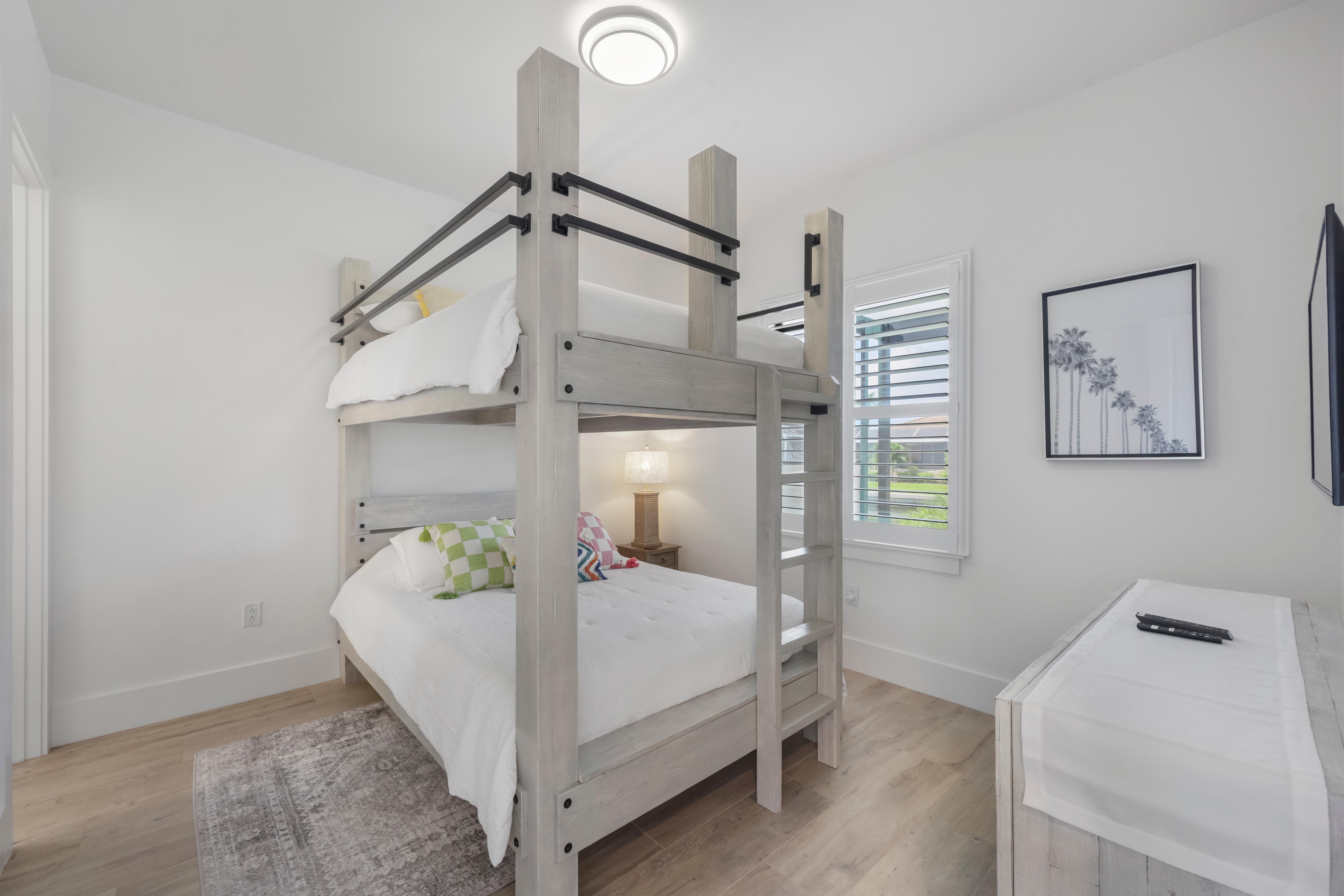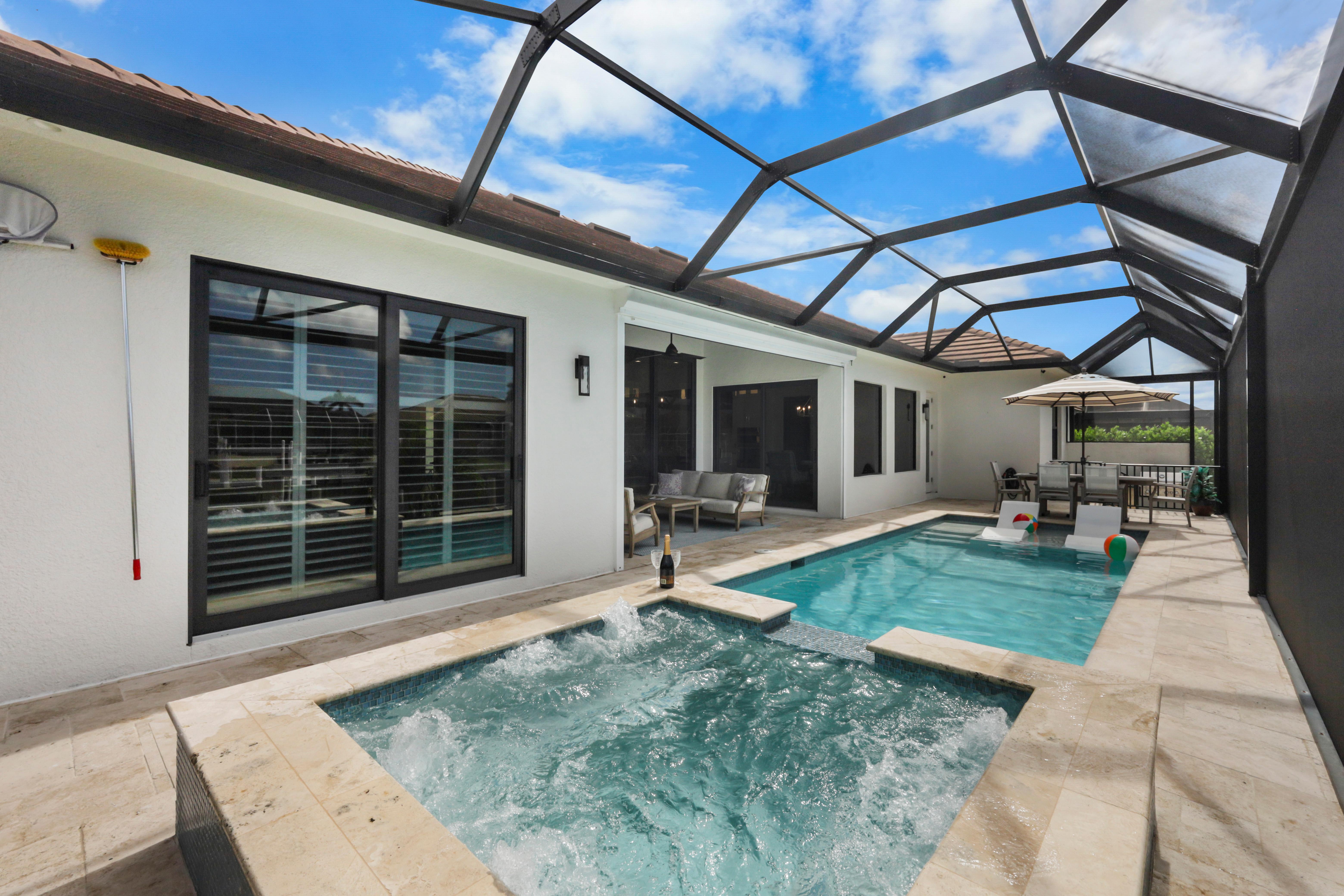 Arrive in style at this 2,500-square-foot Marco Island waterfront retreat, where a welcoming arched driveway lined with palm trees and tropical landscaping sets the tone for a coastal escape. Designed for comfort, this four-bedroom, three-bathroom home has everything for an unforgettable getaway. It sleeps 10, with two king beds, one full bed, one queen-over-queen bunk bed, and three bathrooms. It also comes with a three-car garage.