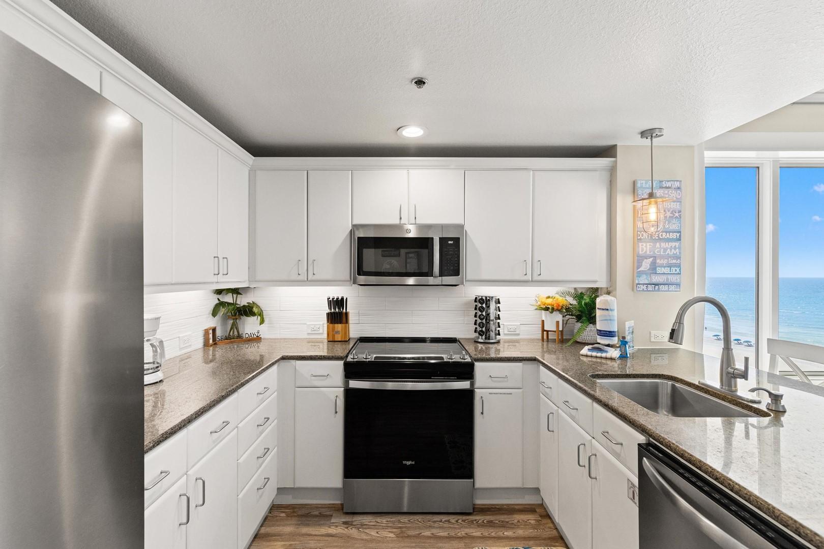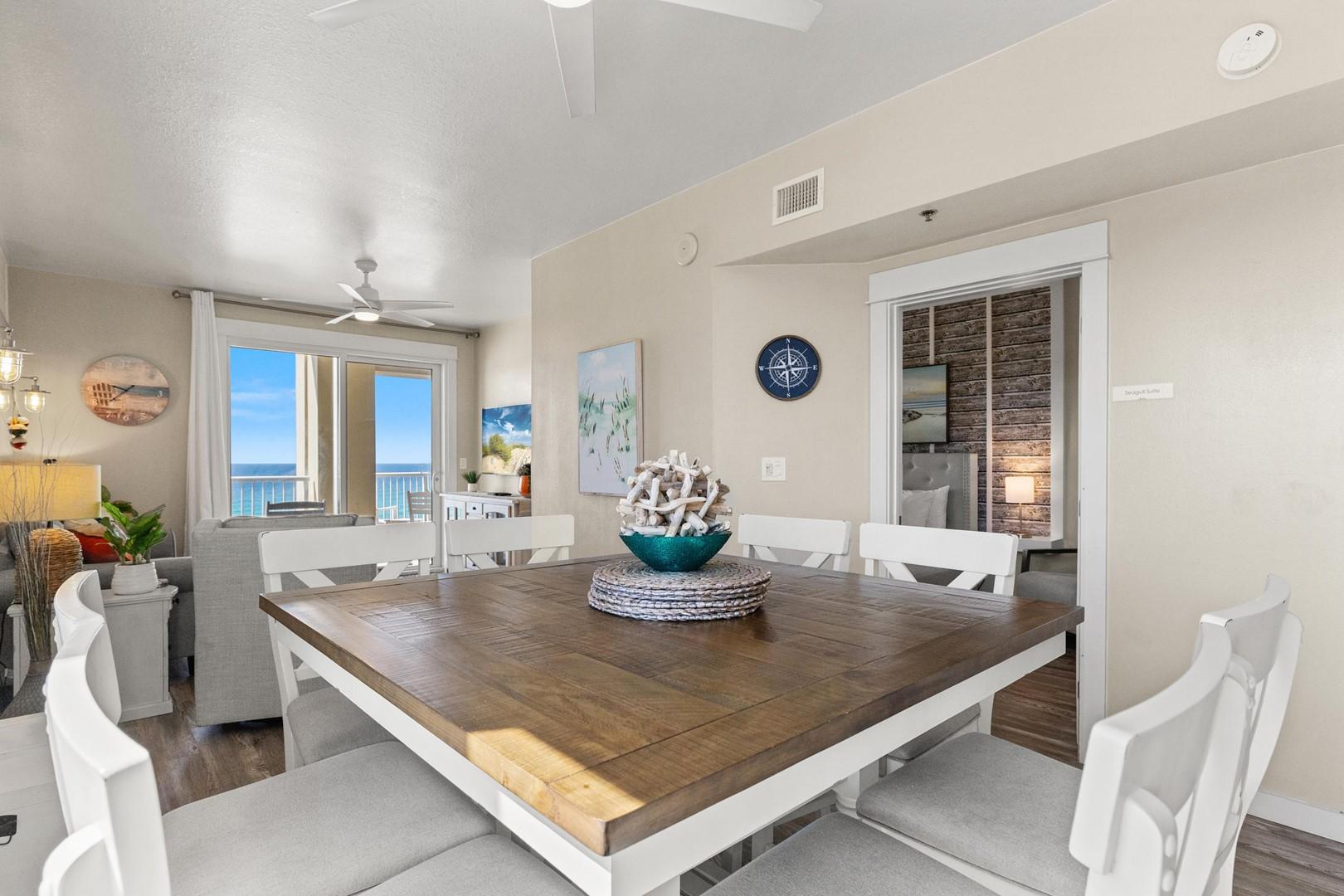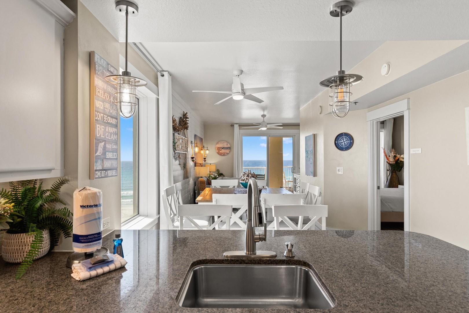 Grand Panama 1-609 is a beautifully updated 2024 corner-unit condo offering panoramic Gulf views, a huge balcony, three spacious bedrooms, a bunk area, and resort amenities perfect for families.