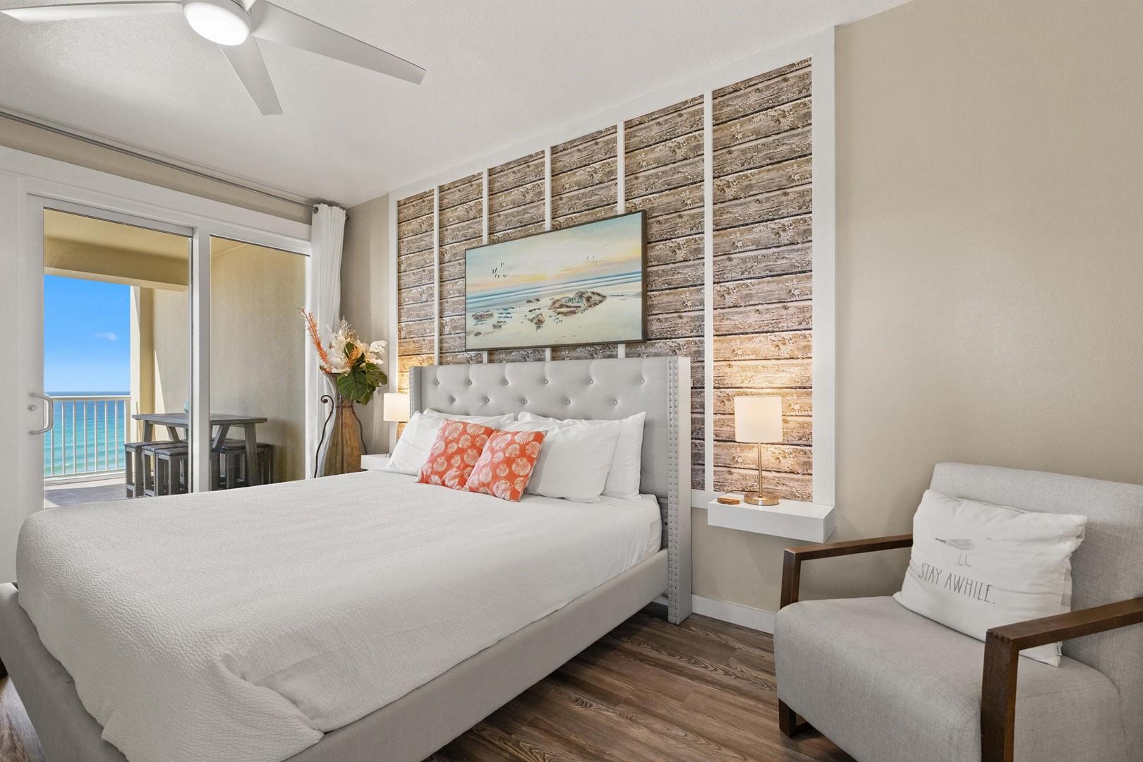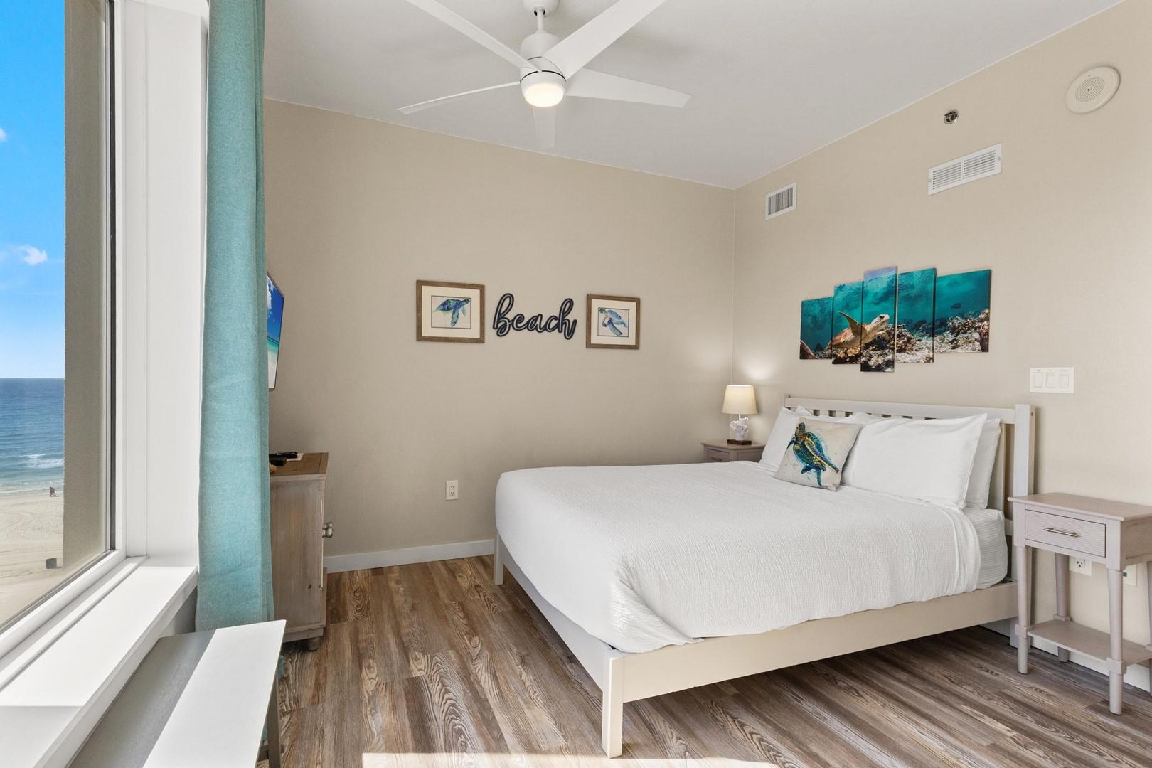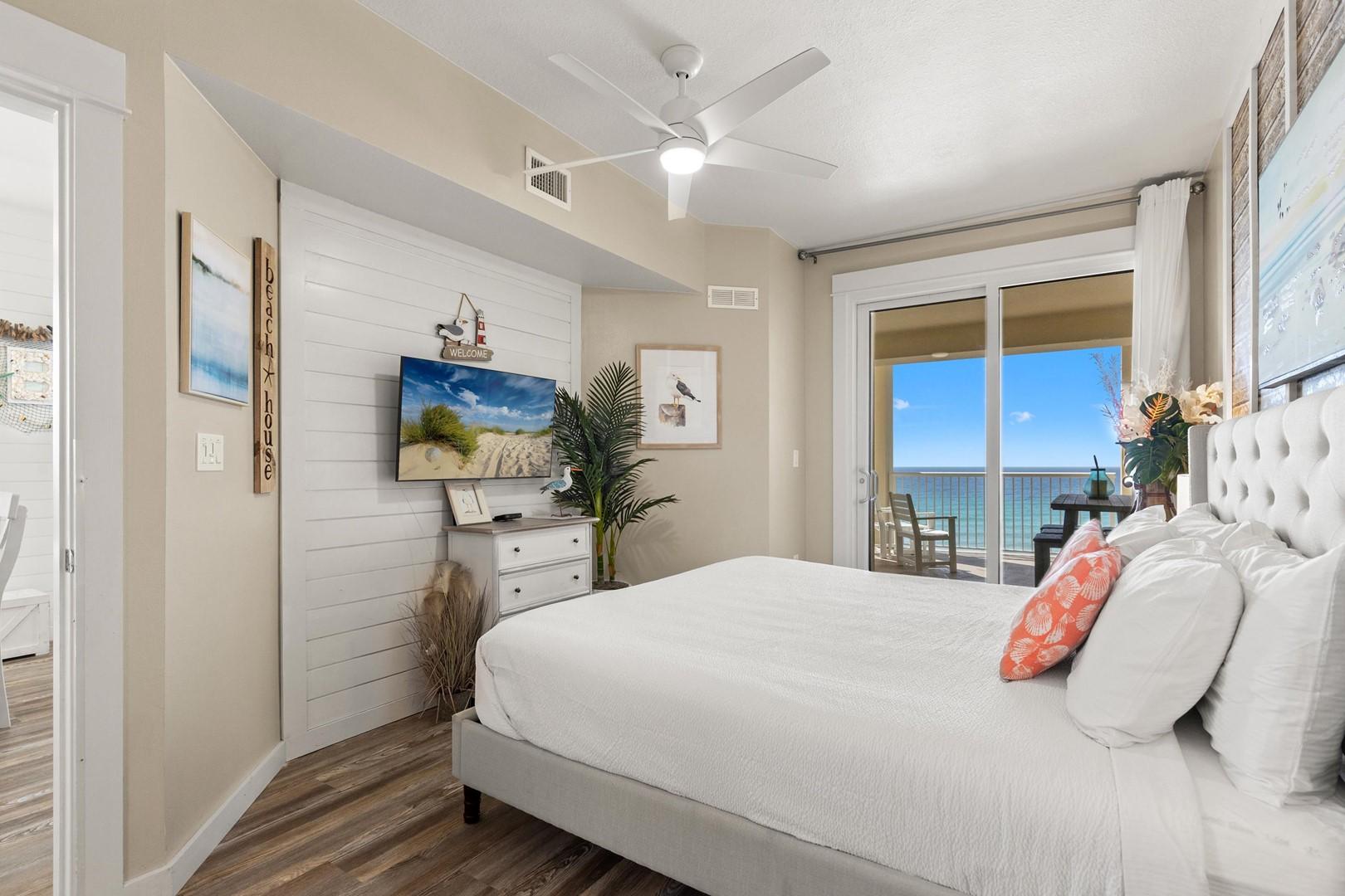 Bedroom 1 – Gulf front, king bed, 55" Smart TV, En Suite Bathroom
