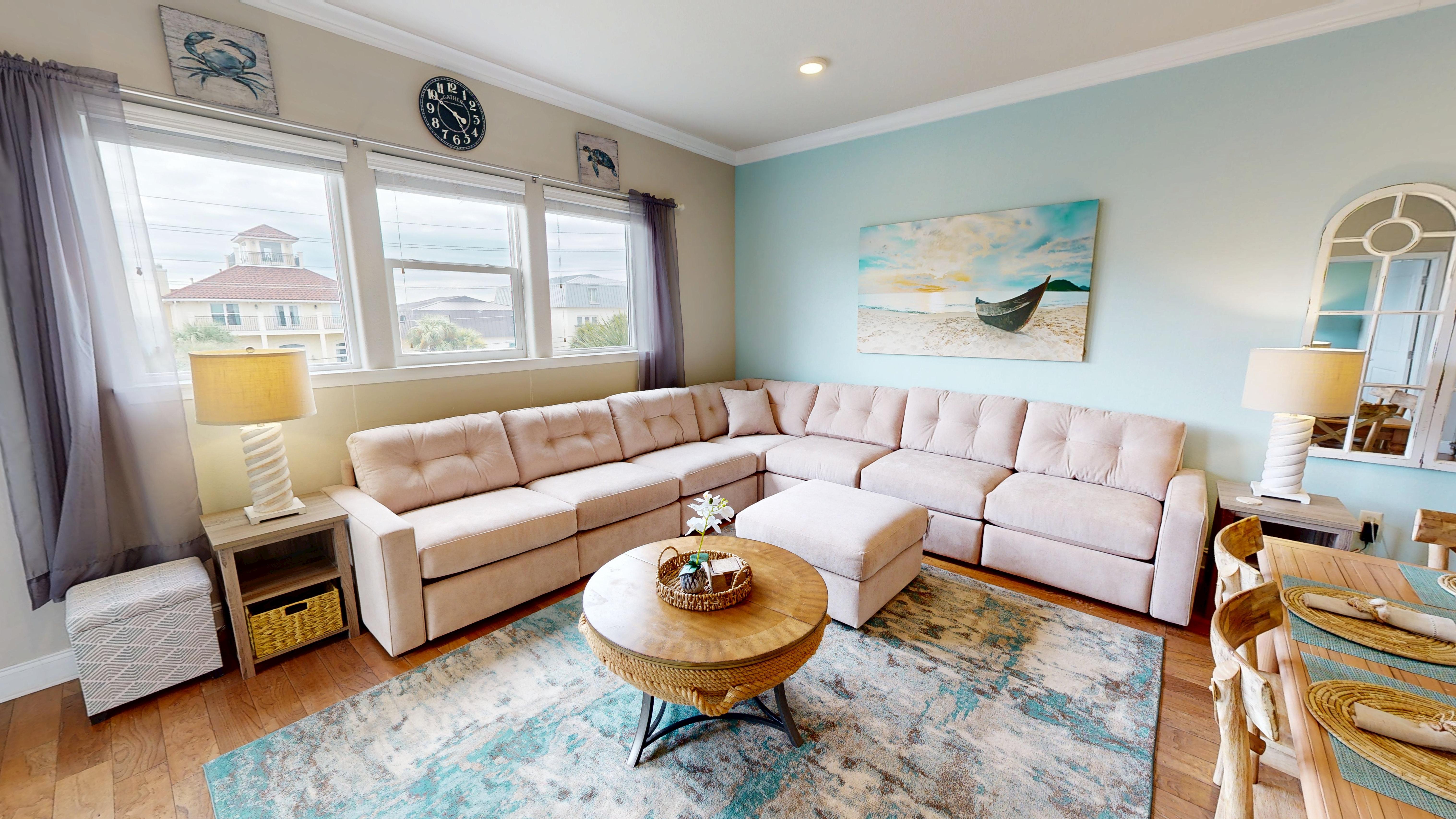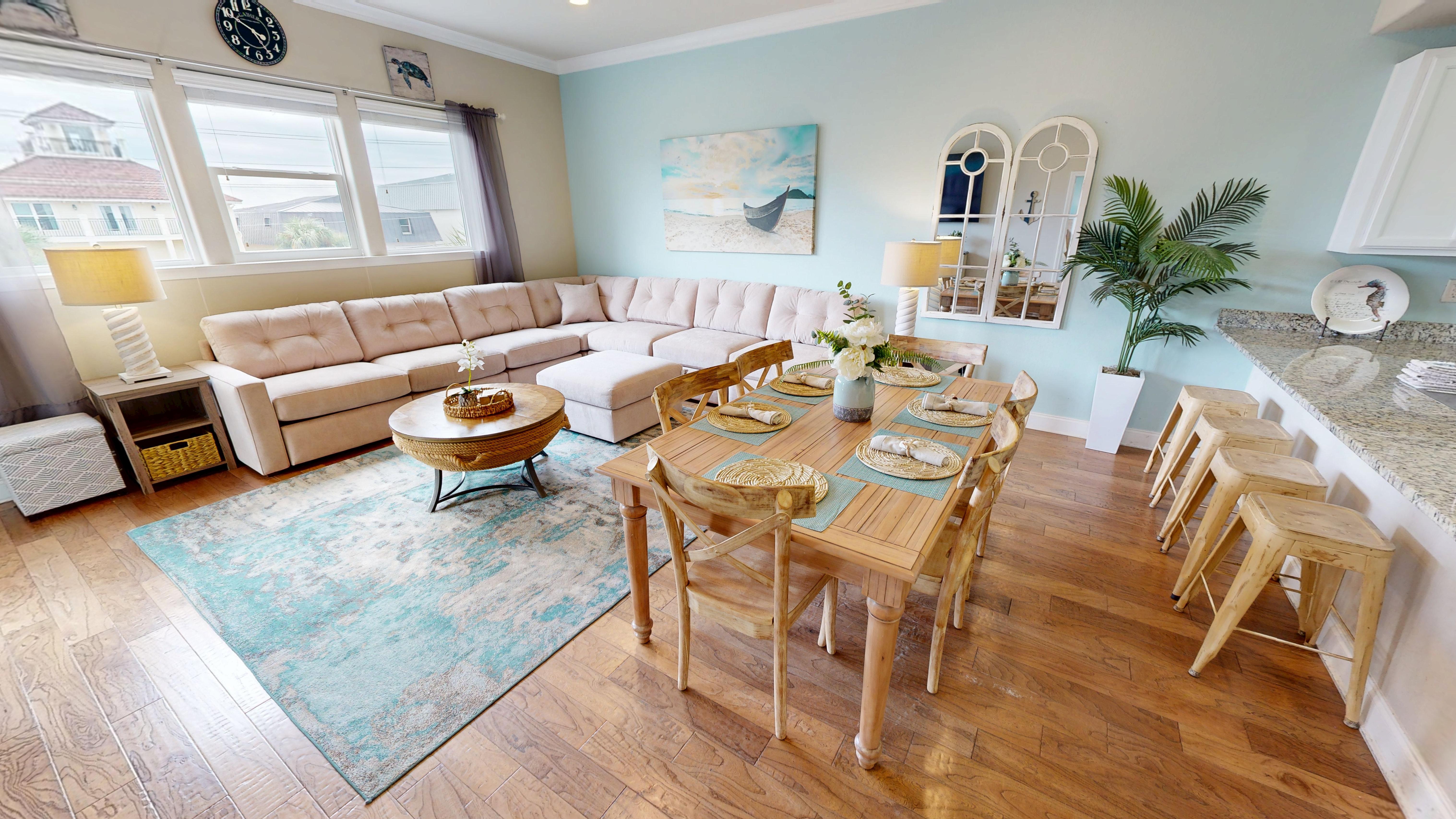 Step inside to discover a spacious, open concept living area adorned with modern coastal furnishings and a warm, inviting ambiance. The living room features a plush sectional sofa, a smart TV, and access to your private balcony, making it the perfect spot to relax after a day of adventure. The dining area seats six, ensuring everyone can enjoy deliciou...