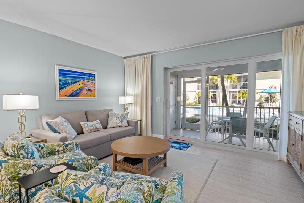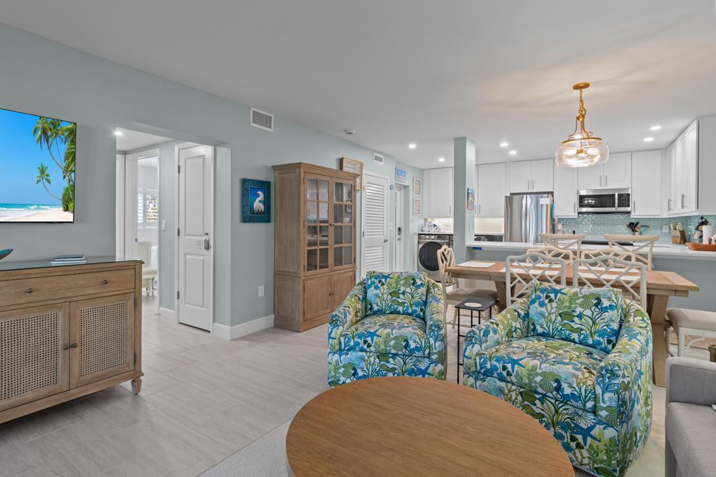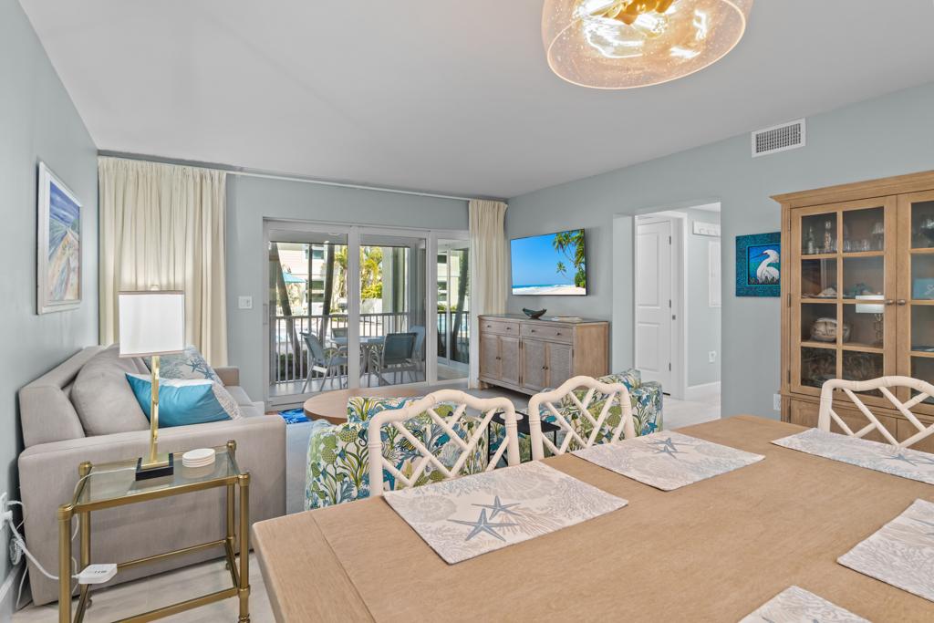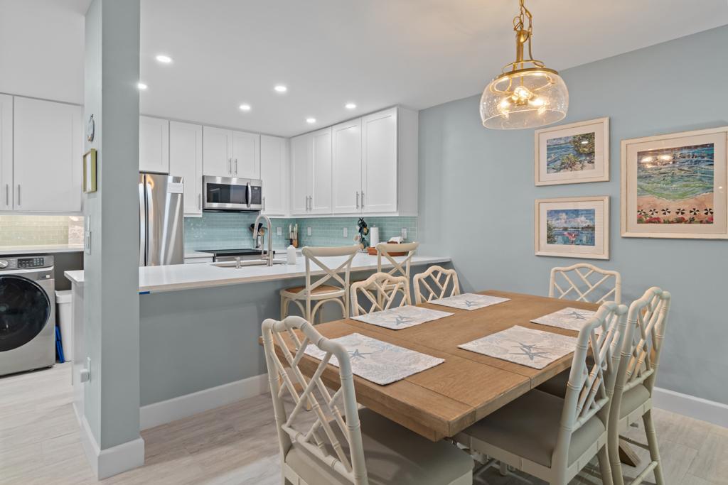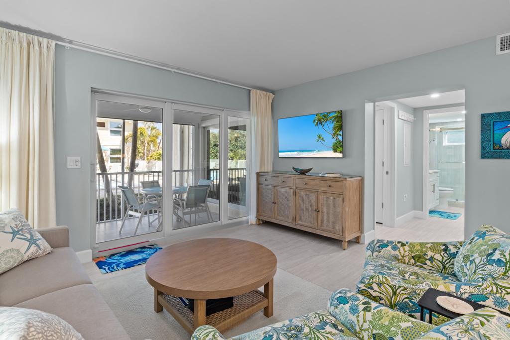 Step into a fully updated space featuring a modern kitchen equipped with full-size appliances, pots and pans, dishes, and all the essentials needed for cooking at home. The open-concept living and dining area is bright and inviting, with a sleeper sofa for extra guests and sliding doors that lead out to your private patio with direct access to the pool—perfect for morning coffee or relaxing after a day at the beach.