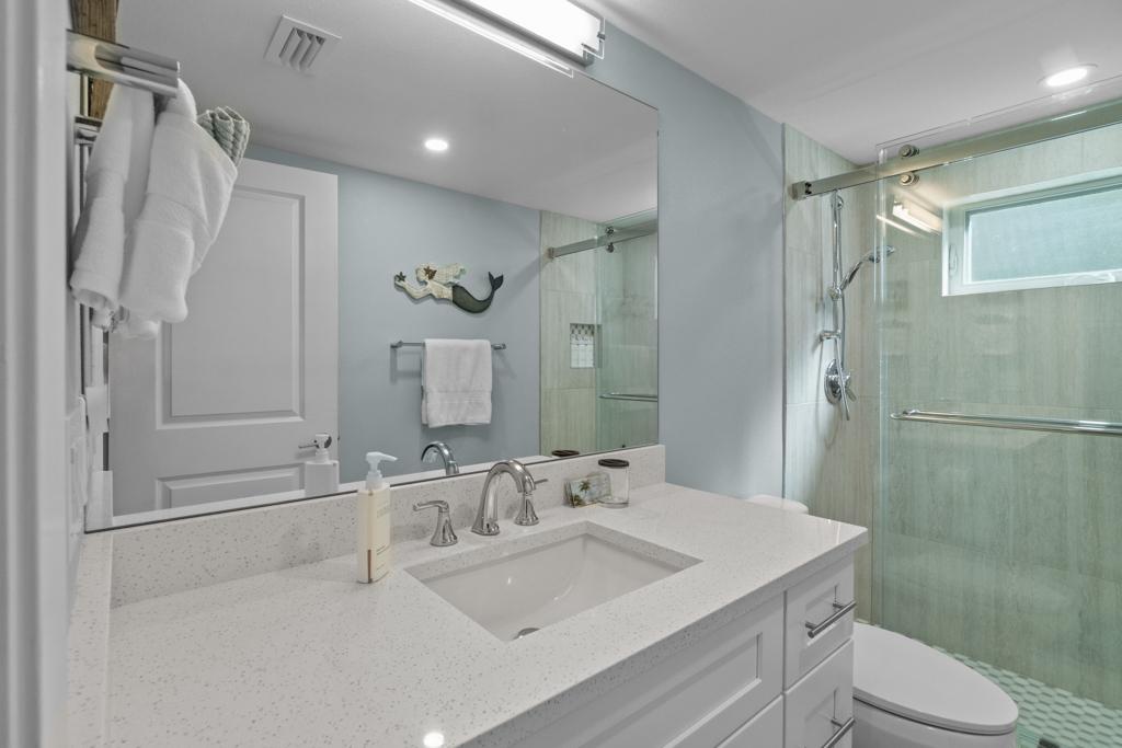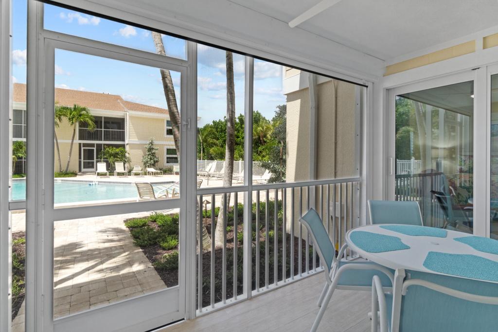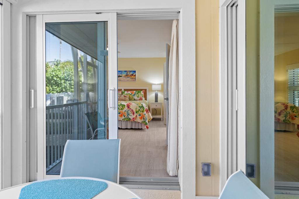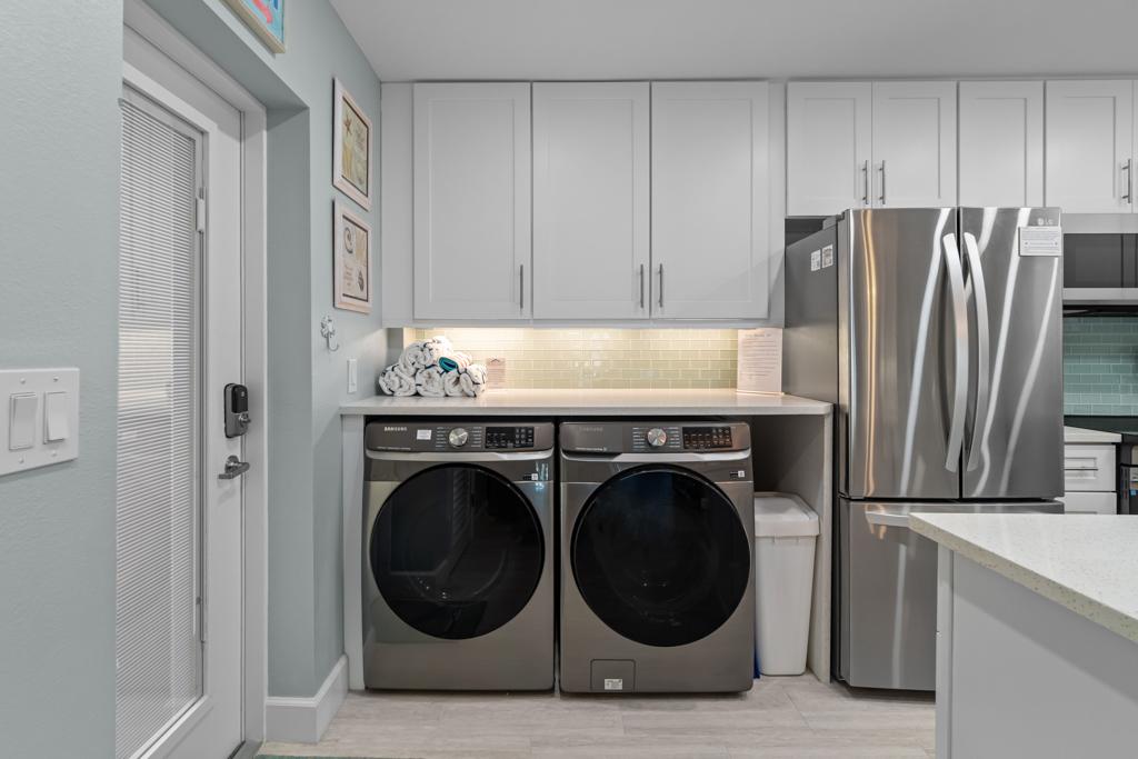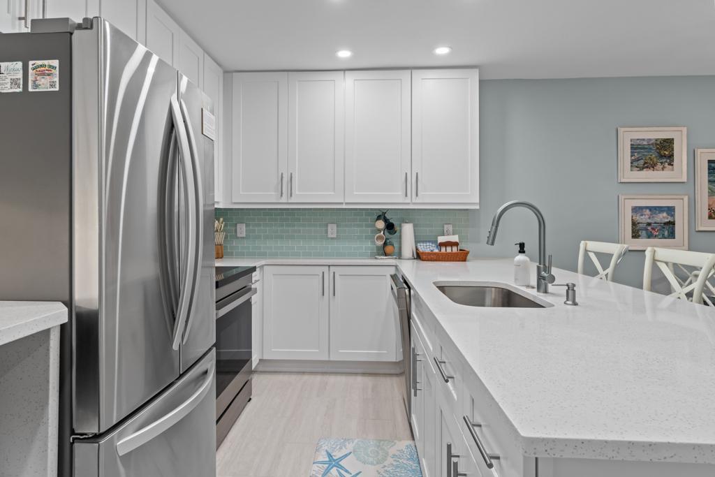 Step into a fully updated space featuring a modern kitchen equipped with full-size appliances, pots and pans, dishes, and all the essentials needed for cooking at home. The open-concept living and dining area is bright and inviting, with a sleeper sofa for extra guests and sliding doors that lead out to your private patio with direct access to the pool—perfect for morning coffee or relaxing after a day at the beach.