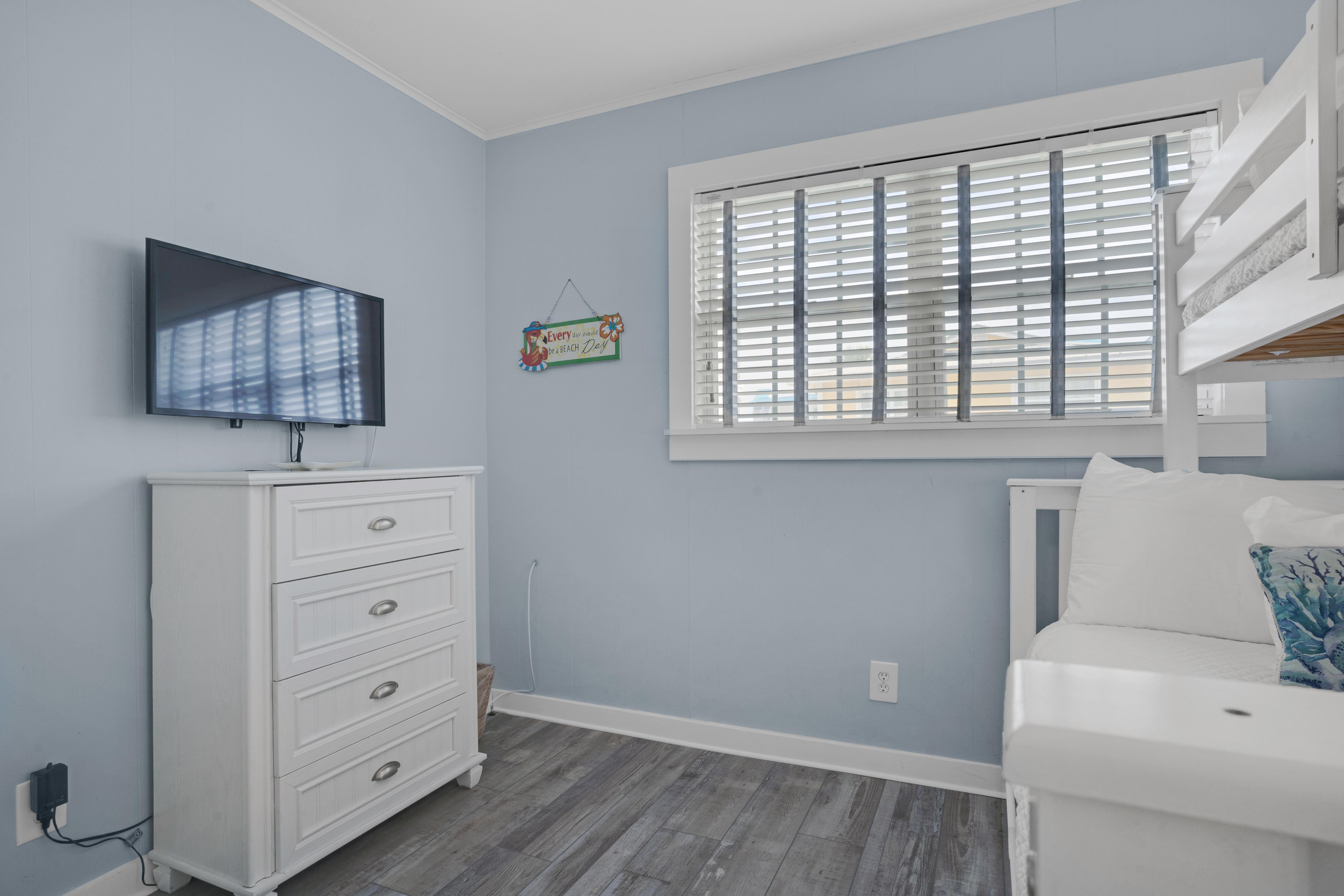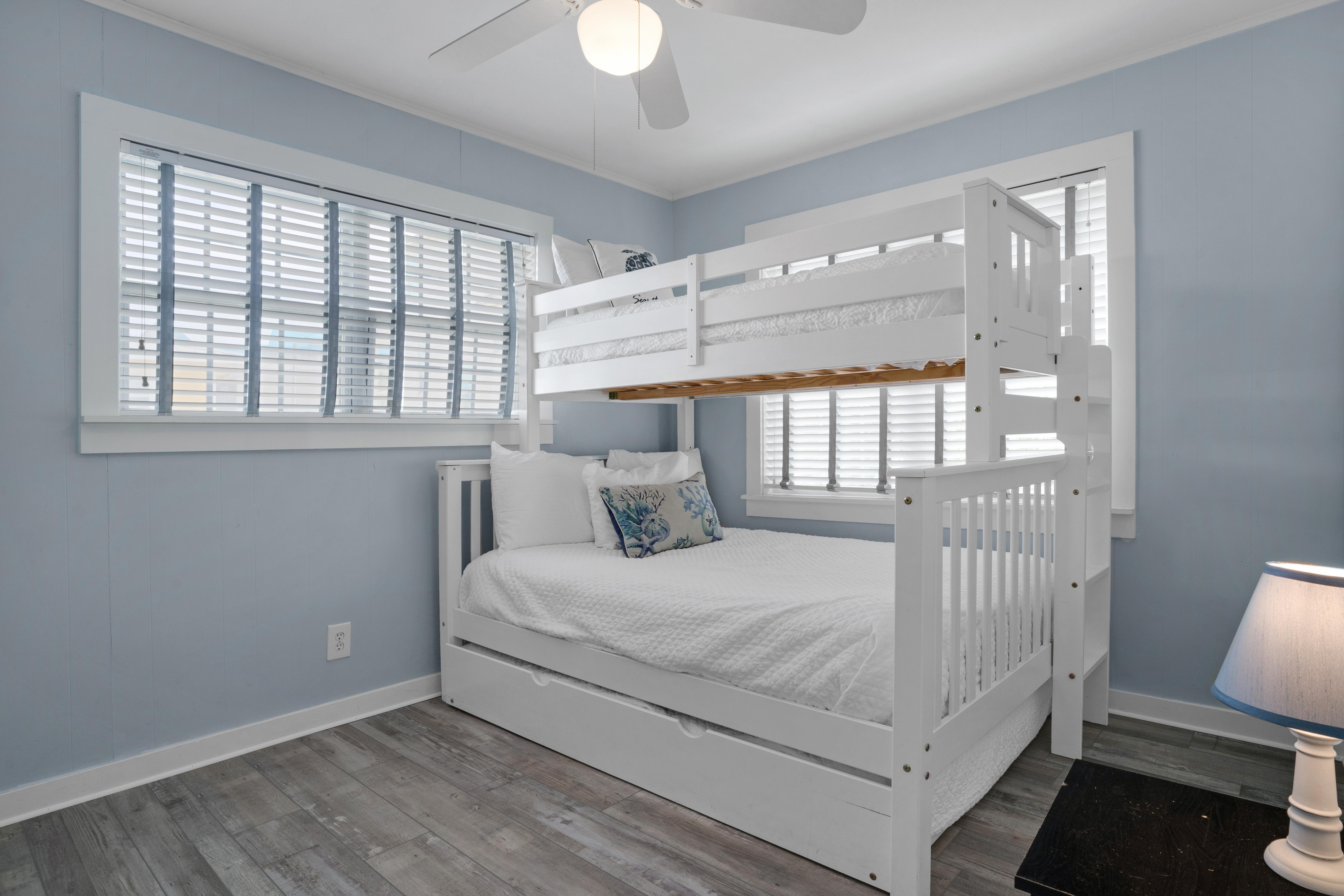 This pet-friendly vacation rental home has been recently remodeled and is perfect for a beach vacation! The master bedroom features a luxurious king size bed, and the the second bedroom offers a twin over full bunk bed with a full trundle. The full bathroom has just recently been renovated as well. The livin...