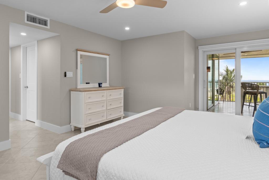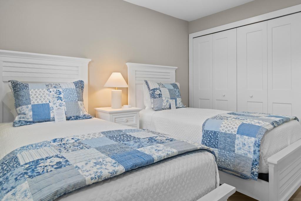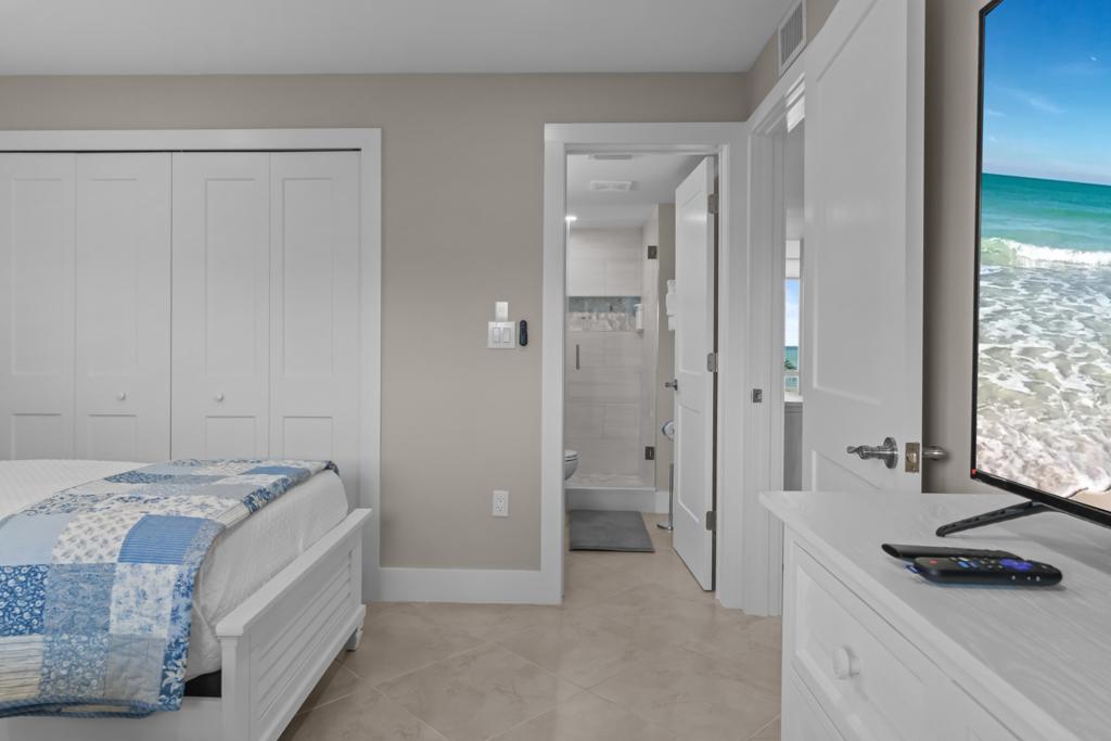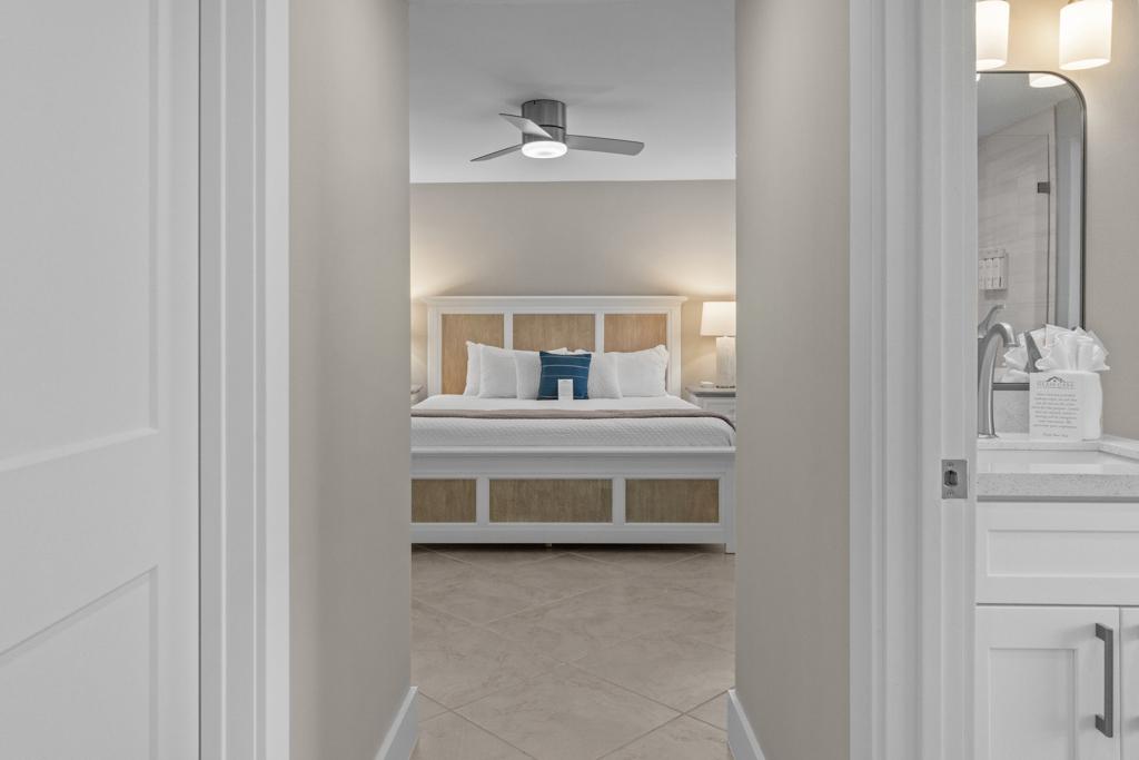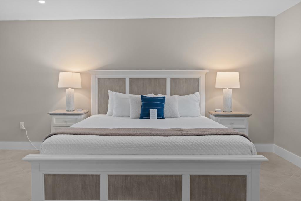 Inside, you’ll find a spacious and comfortable layout that sleeps four. The primary bedroom features a king bed and private patio access, while the second bedroom includes two twin beds—ideal for families, friends, or guests. Both bathrooms feature modern walk-in showers and generous storage space.