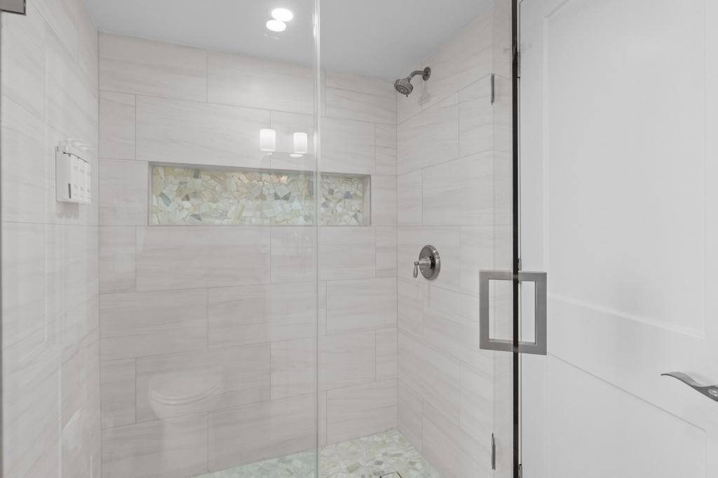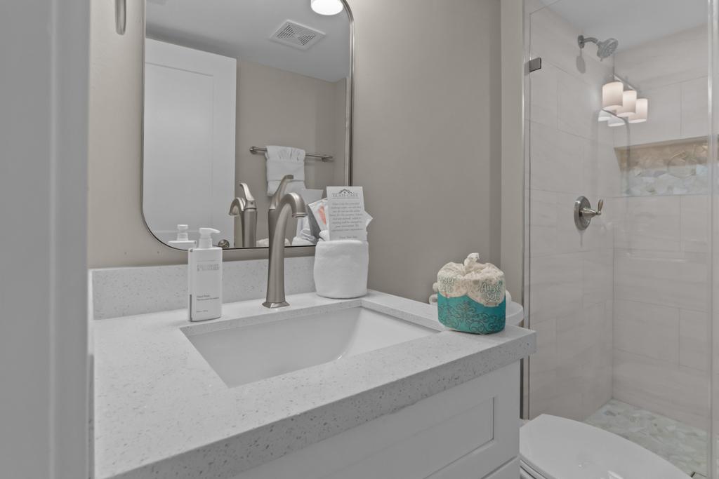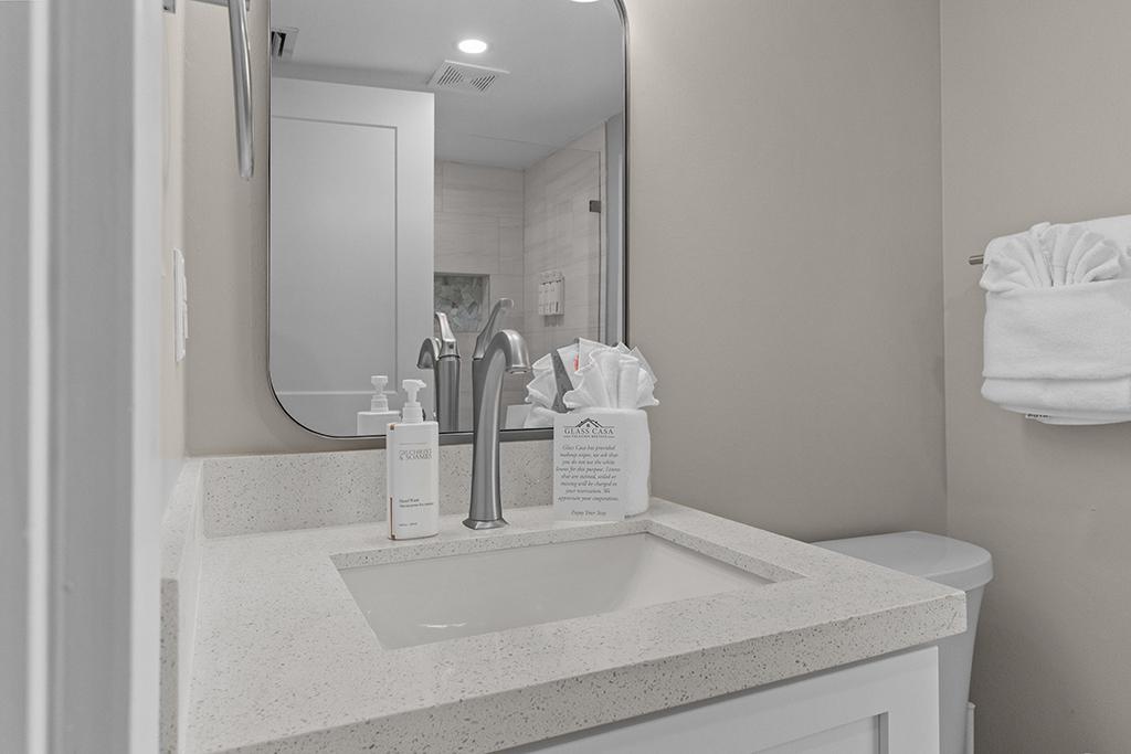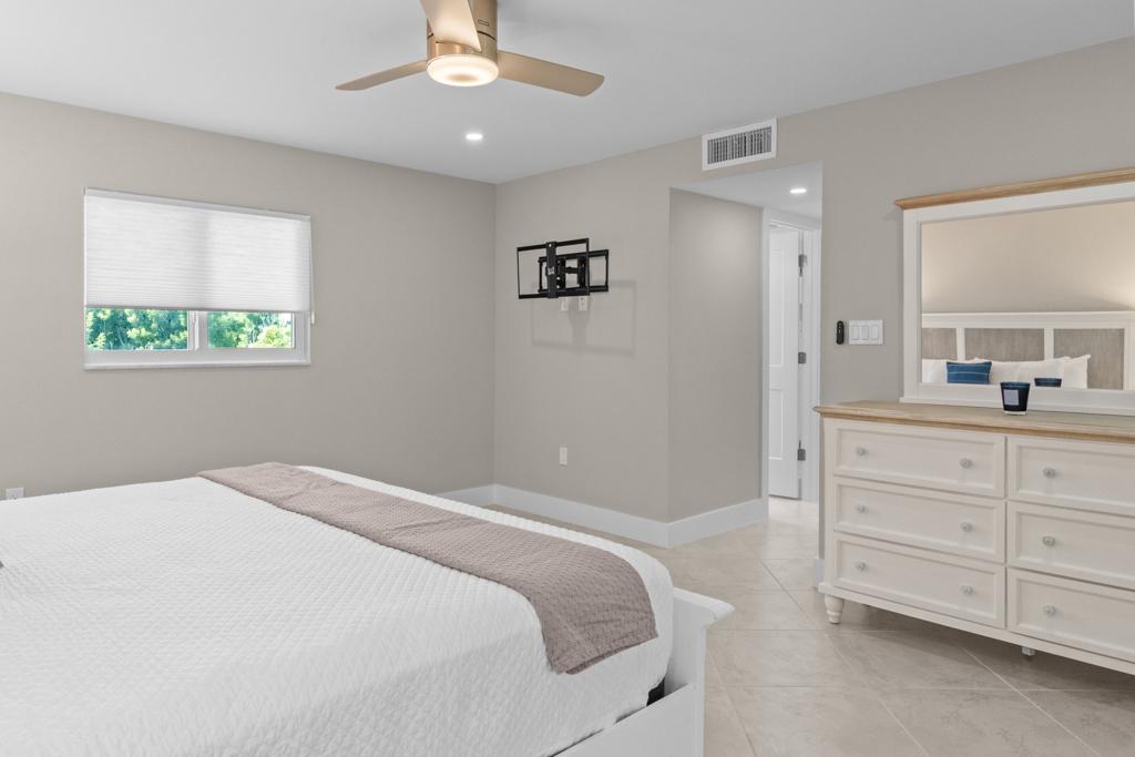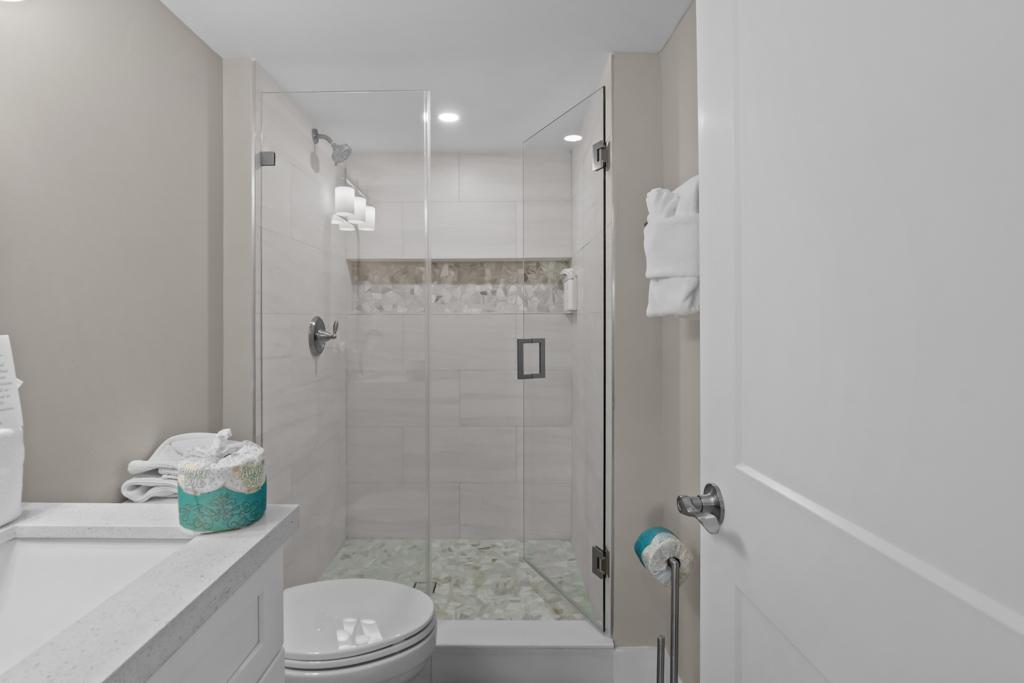 Inside, you’ll find a spacious and comfortable layout that sleeps four. The primary bedroom features a king bed and private patio access, while the second bedroom includes two twin beds—ideal for families, friends, or guests. Both bathrooms feature modern walk-in showers and generous storage space.